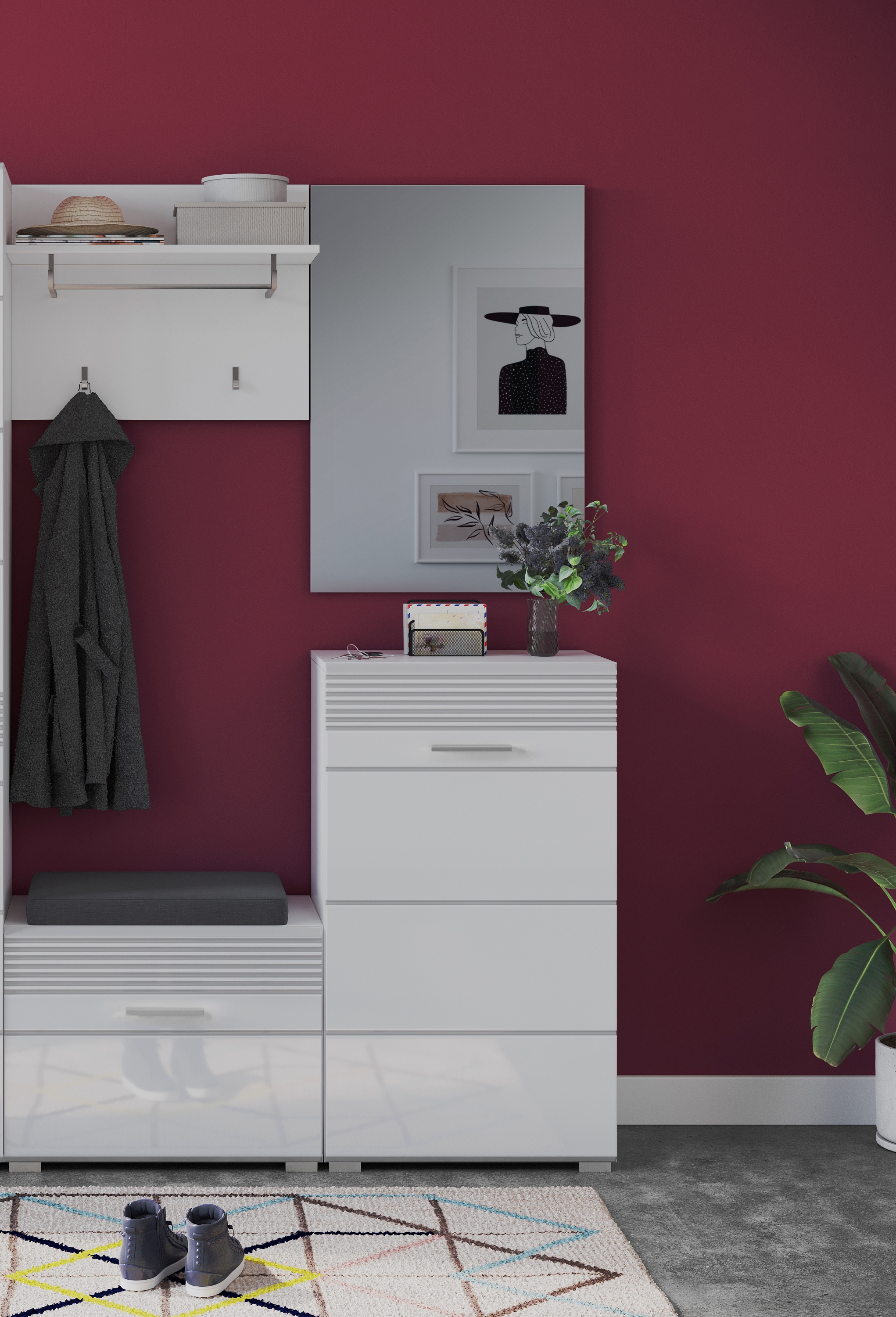 Erweitern Sie Ihren Stauraum und verleihen Sie Ihrem Flur oder Diele mit unserer Garderobenkombination einen Hauch von Eleganz. Gefertigt aus hochwertiger Weiß-Nachbildung und strahlendem Weiß-Hochglanz tiefzieh, bietet diese Kombination nicht nur großzügigen Stauraum, sondern auch eine moderne Ästhetik. Mit ihren praktischen Funktionen und dem zeitlosen Design ist sie die ideale Ergänzung für Ihre Raumgestaltung.