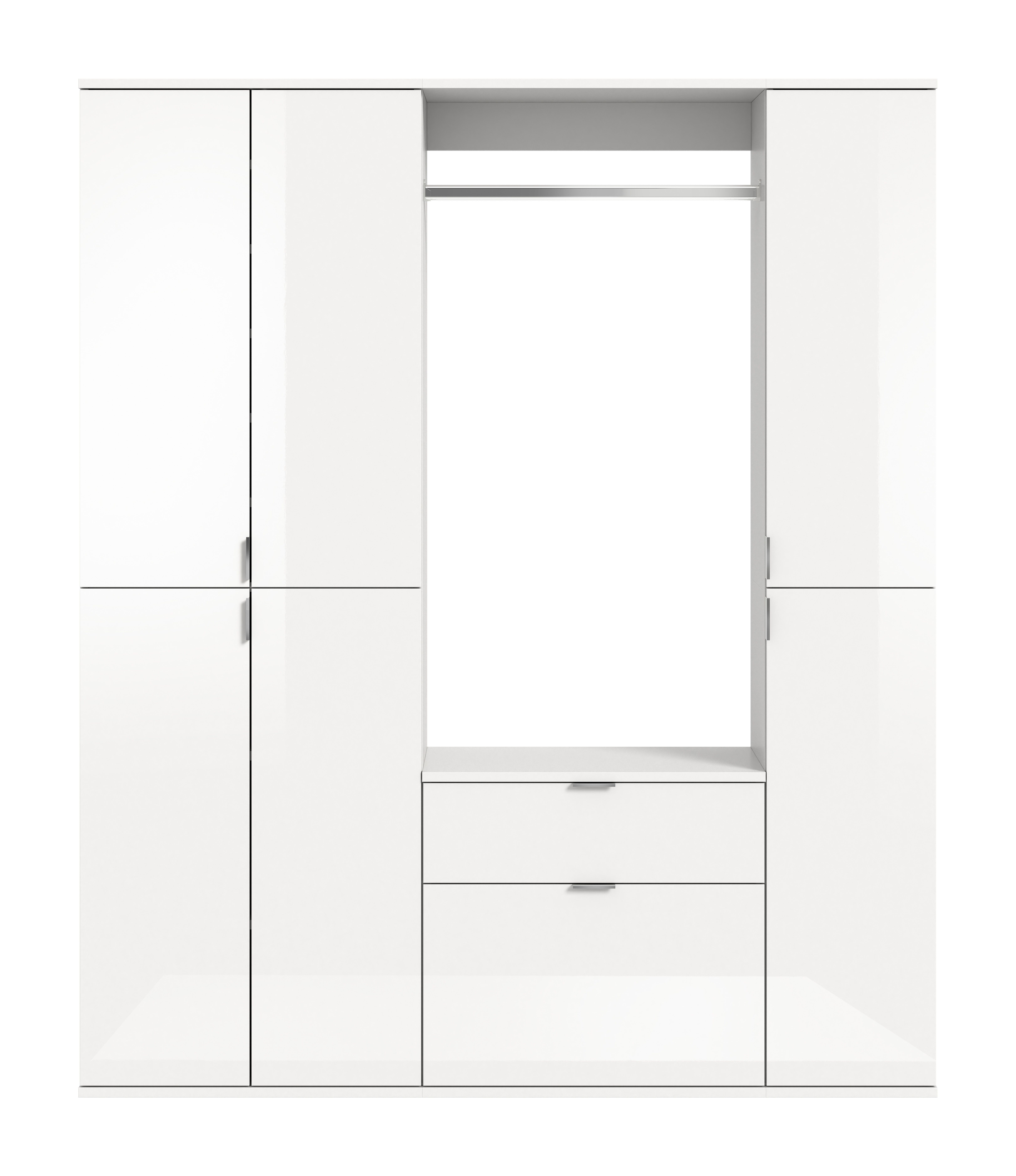 1 Garderobenschrank mit 2 Türen in Weiß Hochglanz, 7 Einlegeböden, 1 Konstruktionsboden und 1 Kleiderstange