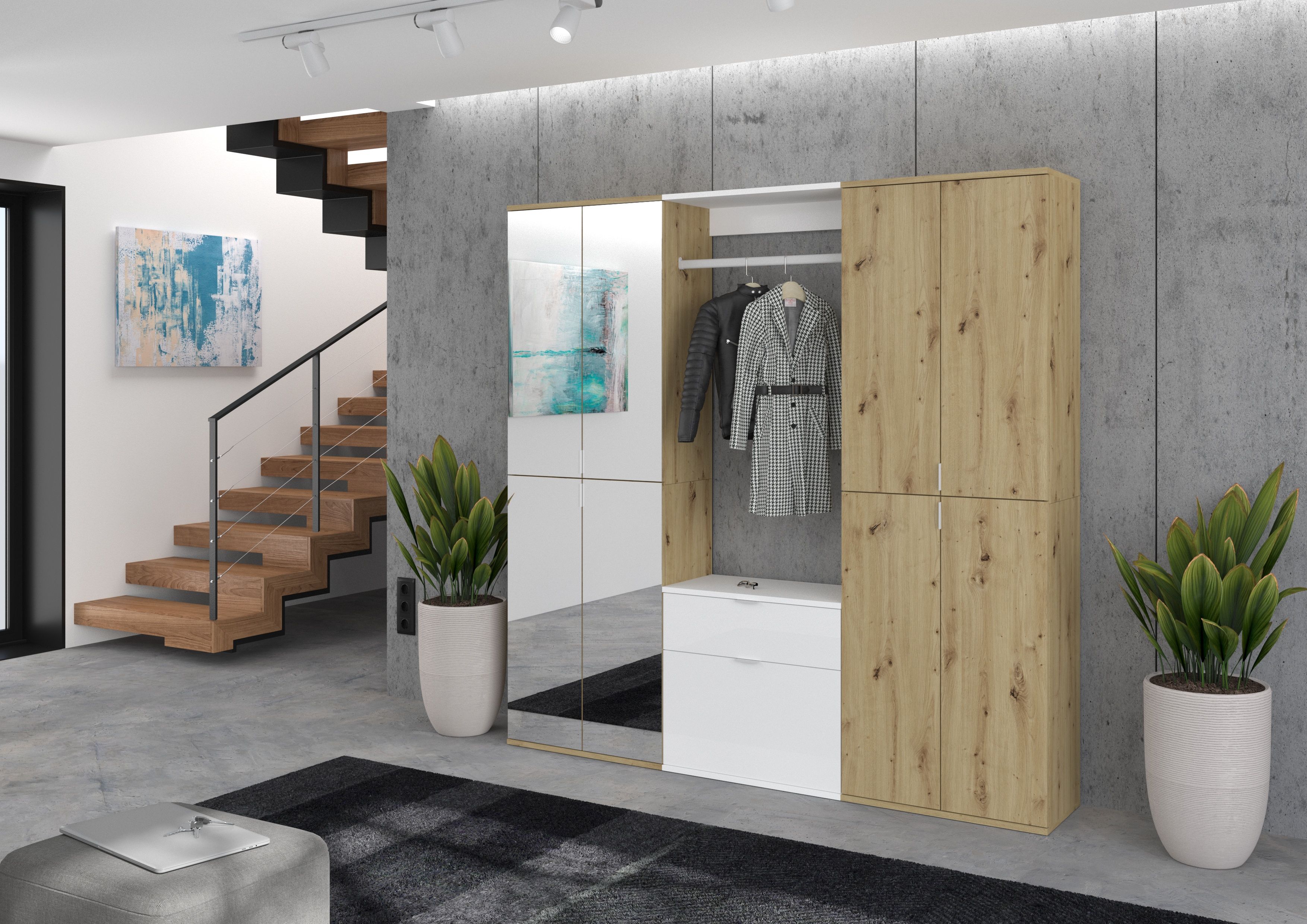- Design/Stil: Die Garderobenkombination kombiniert die warme Ausstrahlung von Artisan Eiche Nachbildung mit der zeitlosen Eleganz von weißer Nachbildung und dem raffinierten Look von Spiegelglas. Diese harmonische Fusion verleiht dem Möbelstück einen modernen und einladenden Charme, der sich gut in verschiedene Einrichtungsstile einfügt.