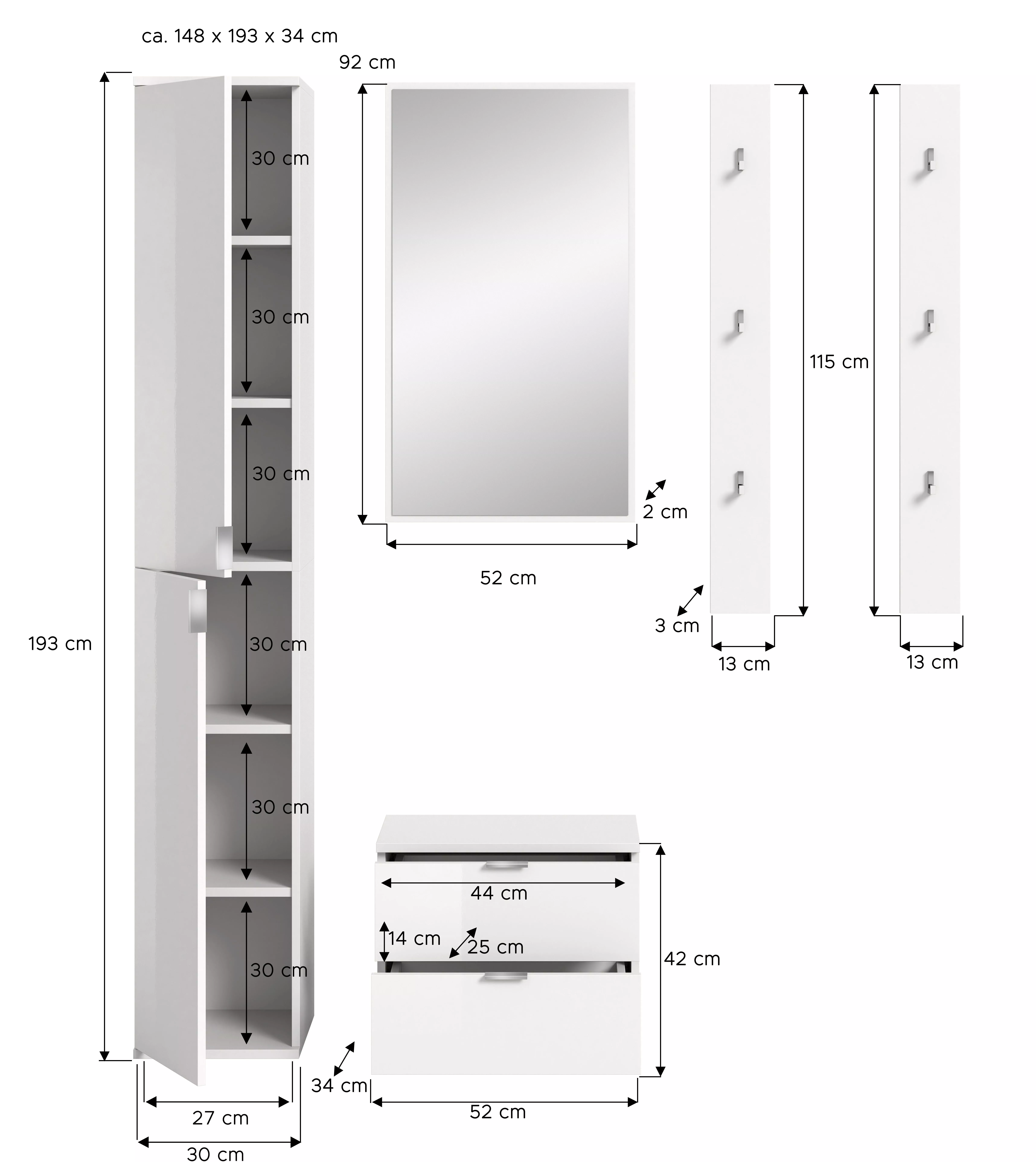Entdecken Sie unsere praktische Garderobenkombination in Weiß Hochglanz, die mit ihren Maßen von 148 cm Breite, 191 cm Höhe und 37 cm Tiefe jeden Flur verschönert. Diese Kombination umfasst einen geräumigen Hochschrank, eine bequeme Sitzbank/Kommode, einen großen Spiegel und ein 2er Set Paneel. Der Hochschrank bietet ausreichend Stauraum für Jacken und Accessoires, während die Sitzbank ideale Sitzmöglichkeiten beim Anziehen von Schuhen schafft. Der Spiegel und das Paneel setzen stilvolle Akzente. Holen Sie sich Funktionalität und Eleganz in Ihr Zuhause!