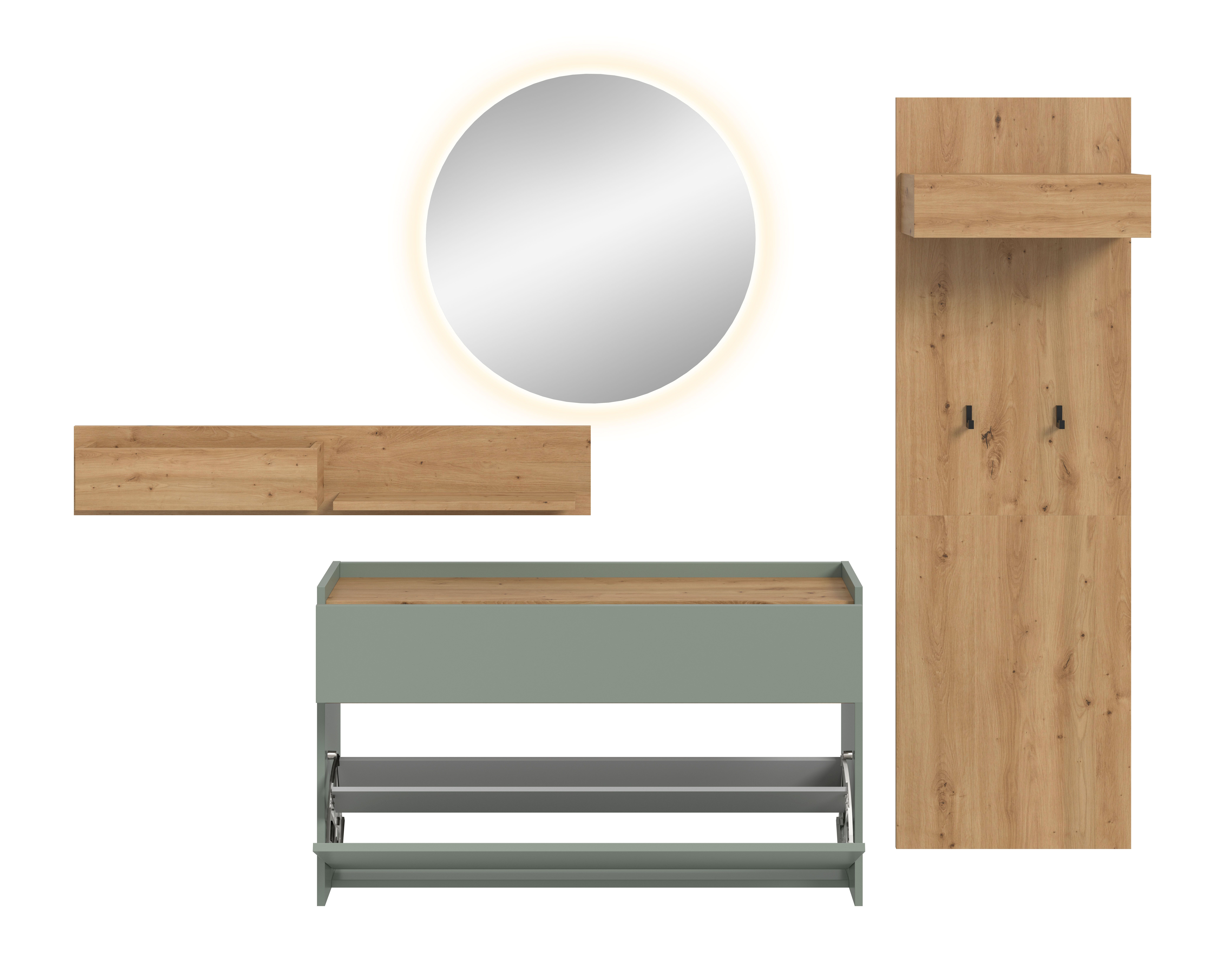 - 5-teiliges Set, bestehend aus: 1x Schuhkommode, 1x Hängeregal, 1x Spiegel, 1x Garderobenpaneel, 1x LED Bad warm-weiß 2x 110cm