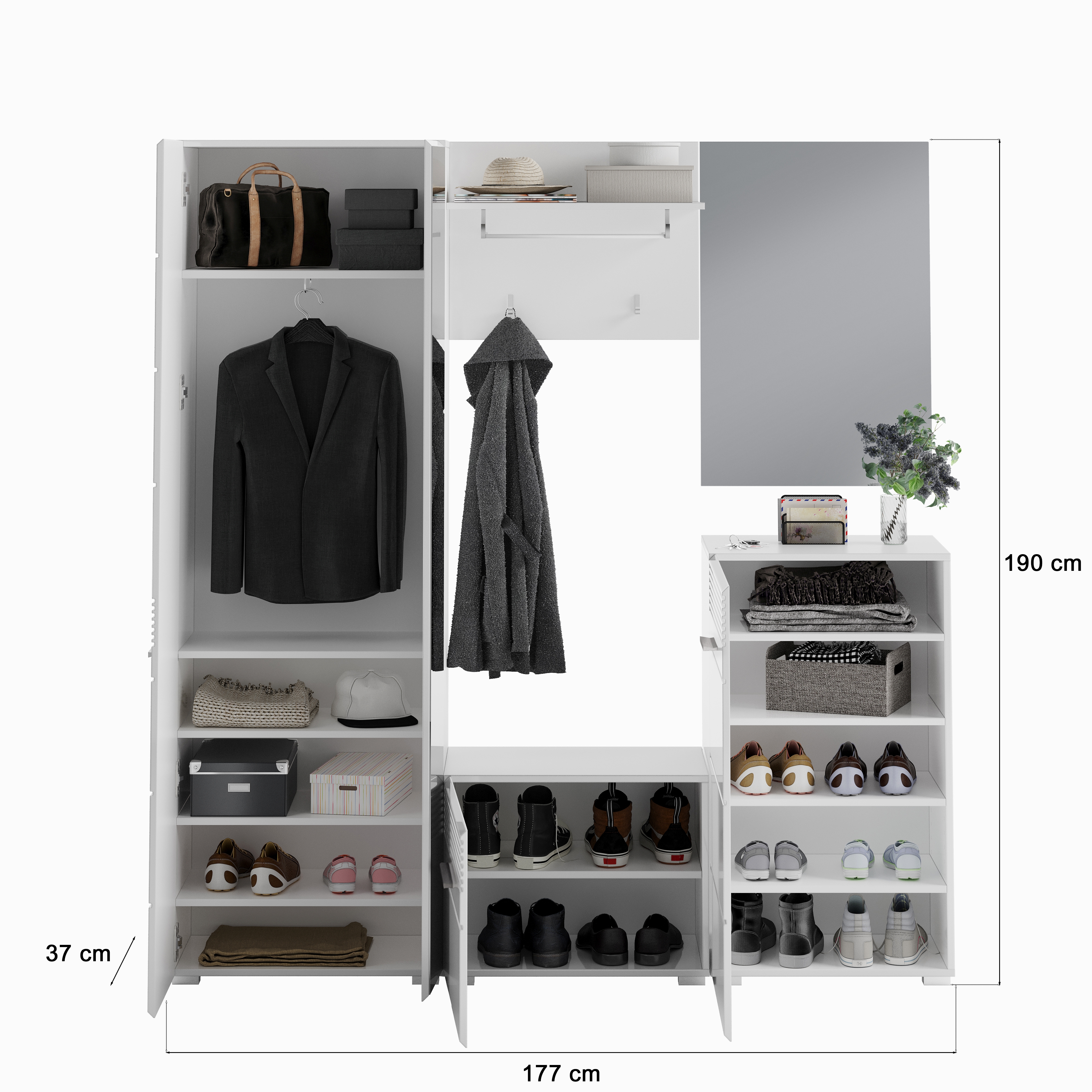 - Funktionalität: Geräumige Garderobenkombination mit verschiedenen Schrankfächern und Kleiderstangen , die ausreichend Stauraum für Jacken, Schuhe, Accessoires und andere Gegenstände bietet. Die durchdachte Aufteilung und die praktischen Funktionen erleichtern die Organisation und Nutzung im Alltag.
