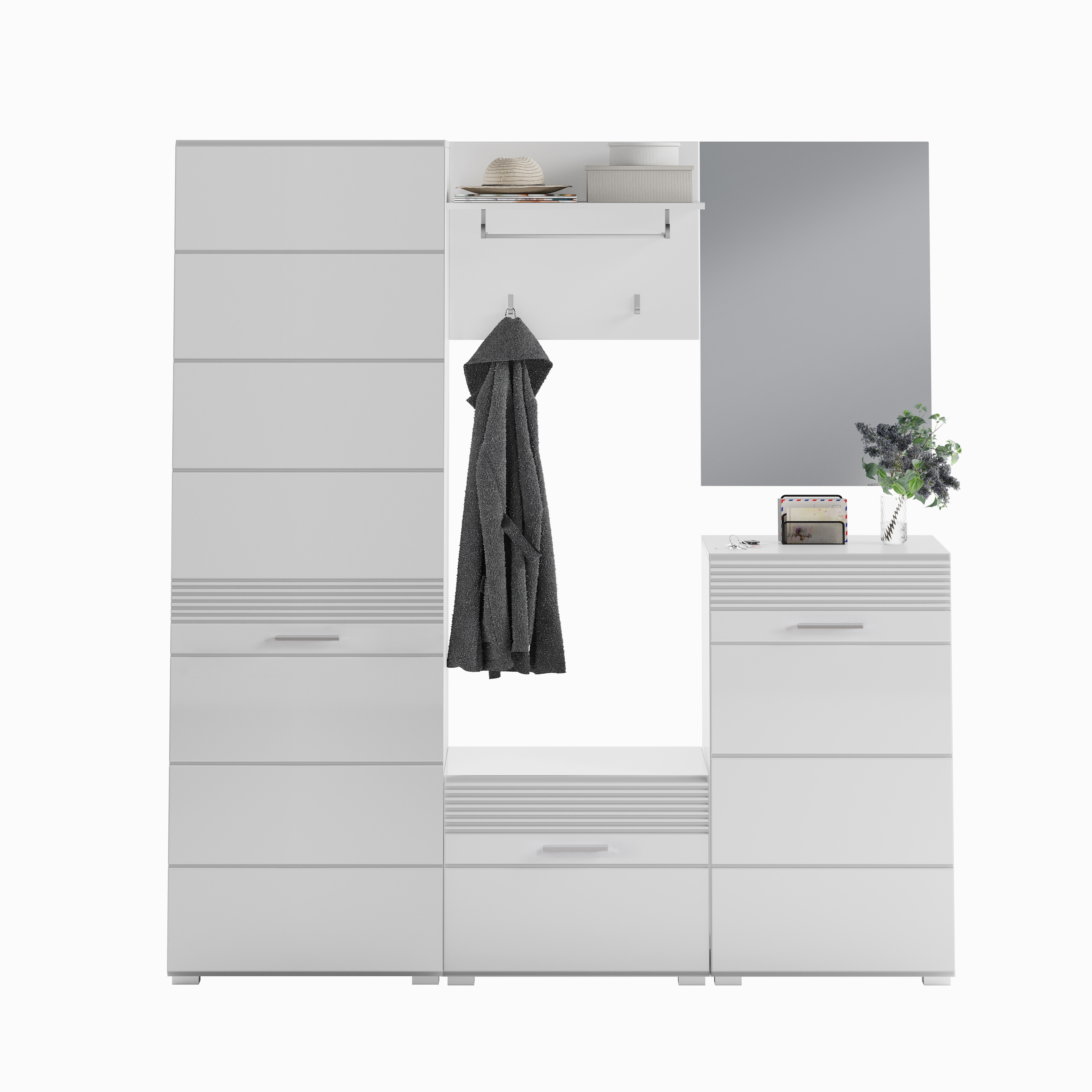 Erweitern Sie Ihren Stauraum und verleihen Sie Ihrem Flur oder Diele mit unserer Garderobenkombination einen Hauch von Eleganz. Gefertigt aus hochwertiger Weiß-Nachbildung und strahlendem Weiß-Hochglanz tiefzieh, bietet diese Kombination nicht nur großzügigen Stauraum, sondern auch eine moderne Ästhetik. Mit ihren praktischen Funktionen und dem zeitlosen Design ist sie die ideale Ergänzung für Ihre Raumgestaltung.