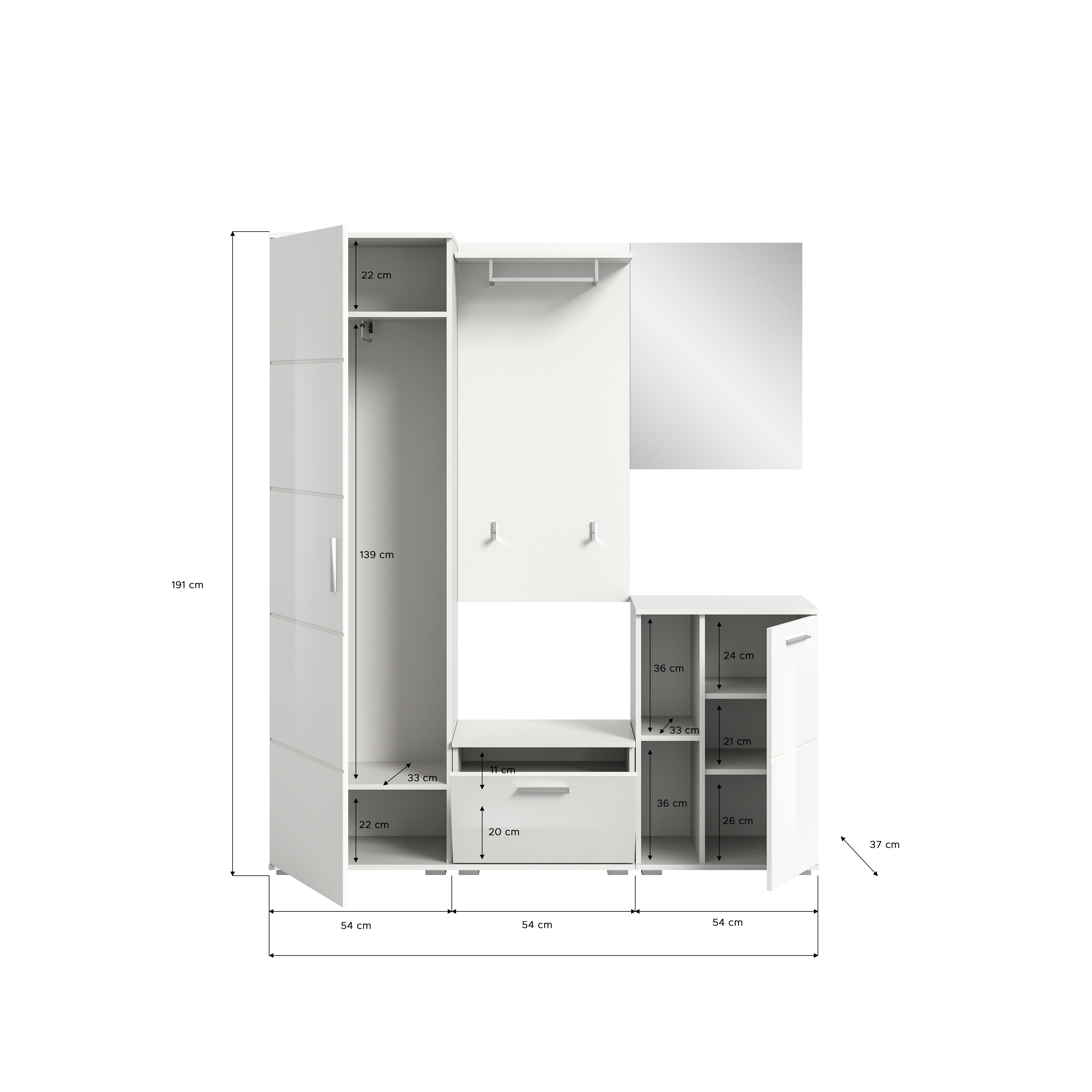 - Einsatzbereich: Die Garderobenkombination eignet sich perfekt für den Einsatz im Flur oder in der Diele, um zusätzlichen Stauraum zu schaffen und gleichzeitig das Raumambiente mit ihrem modernen Design aufzuwerten. Sie kann aber auch in anderen Wohnbereichen wie dem Schlafzimmer oder dem Arbeitszimmer verwendet werden, um Funktionalität und Ästhetik zu kombinieren.