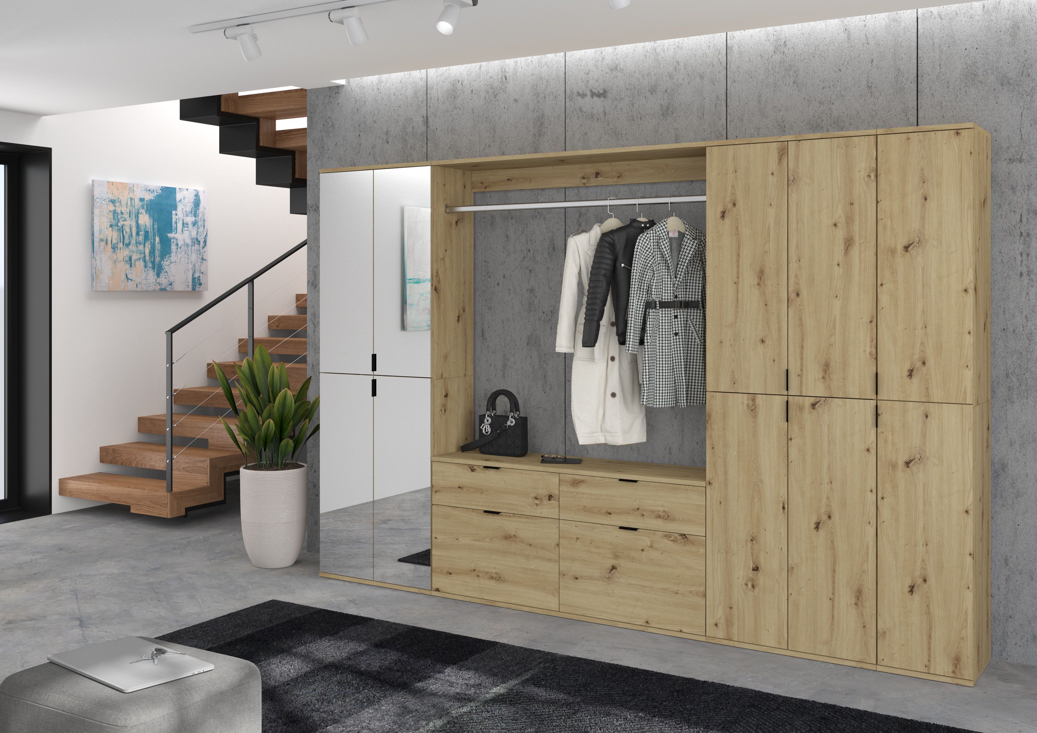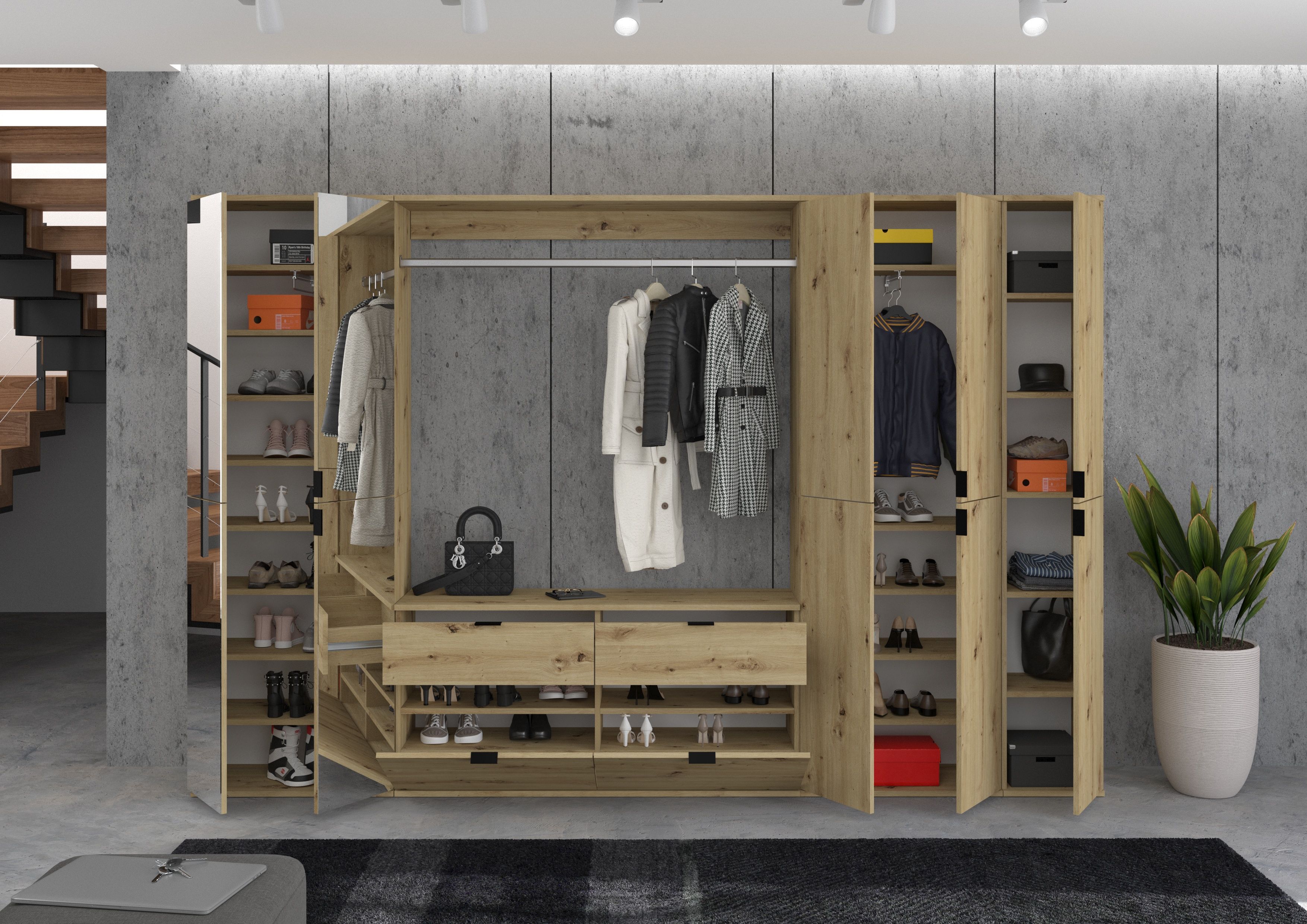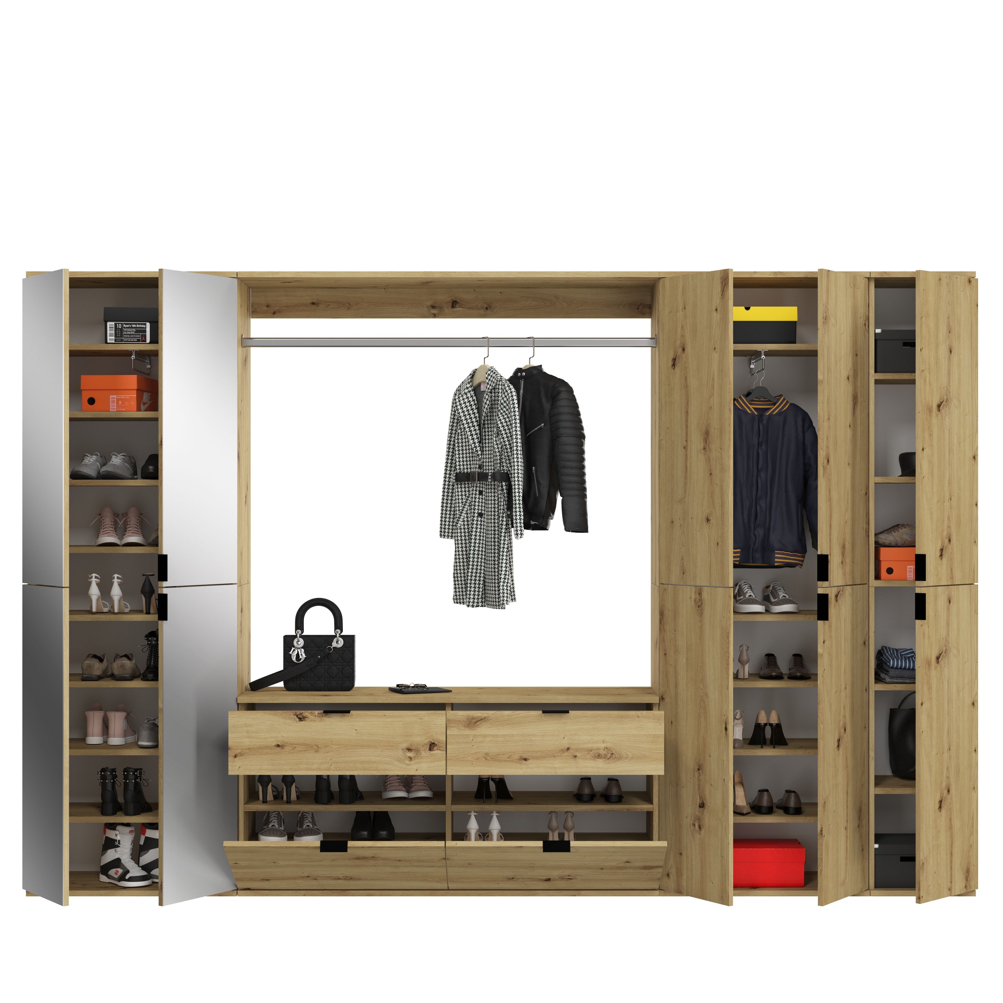 Optimieren Sie Ihren Flur, die Diele, den Hauswirtschaftsraum, das Büro und das Schlafzimmer mit unserer Garderobenkombination. Mit den Maßen 273x193x34 cm und einem eleganten Design in Artisan Holznachbildung und Spiegel verleiht sie jedem Raum eine helle und moderne Atmosphäre. Holen Sie sich dieses praktische und stilvolle Möbelstück für eine organisierte und ästhetische Einrichtung.
