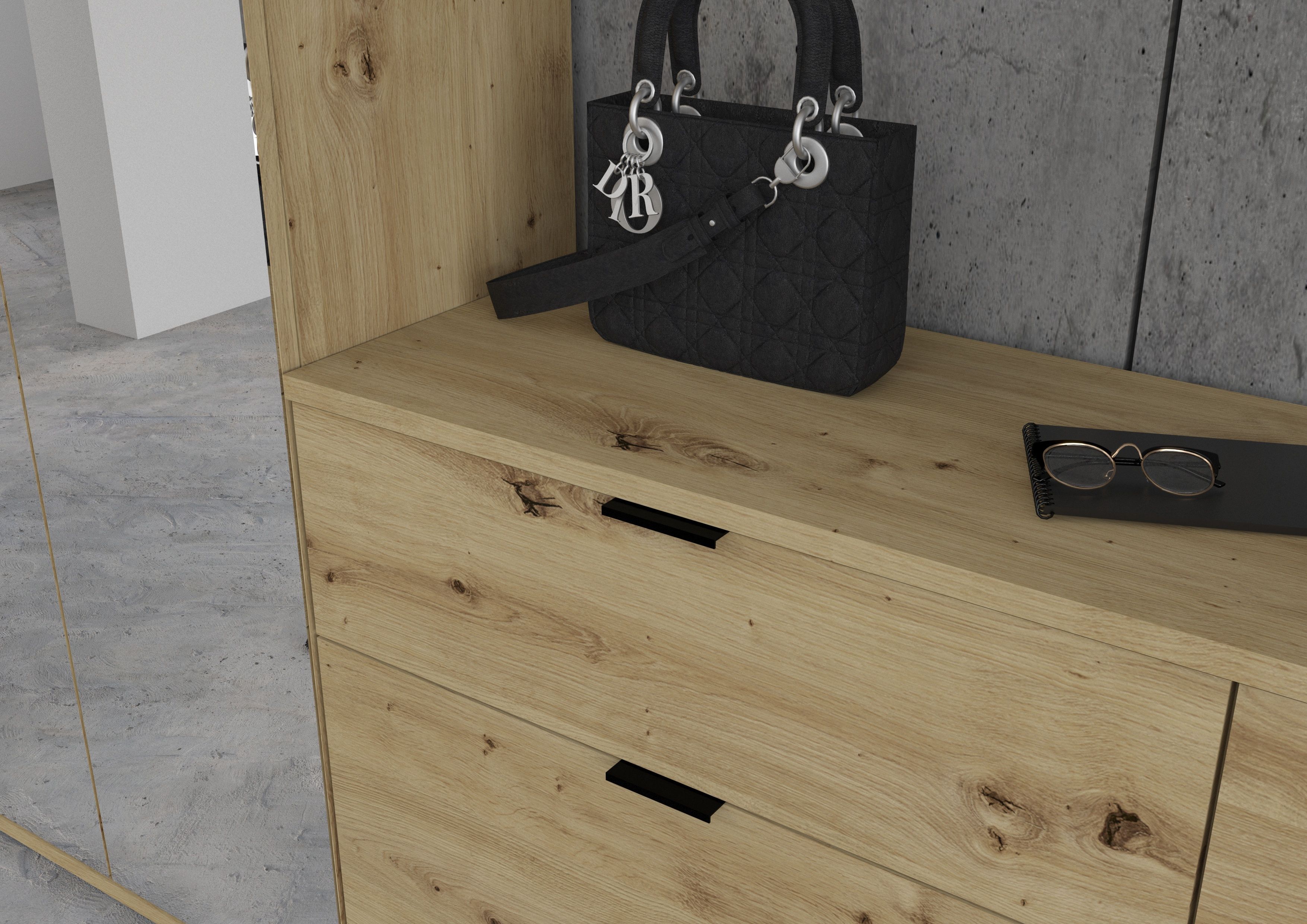 - Funktionalität: Die Garderobenkombination bietet mit ihren verschiedenen Aufbewahrungsmöglichkeiten eine praktische Lösung für die Organisation von Kleidung, Schuhen und anderen persönlichen Gegenständen. Die Kombination aus Kleiderstange und shelfen bietet ausreichend Platz für eine vielseitige Nutzung. Die Artisan Holznachbildung ist zudem leicht zu reinigen und verleiht dem Möbelstück eine glatte Oberfläche.