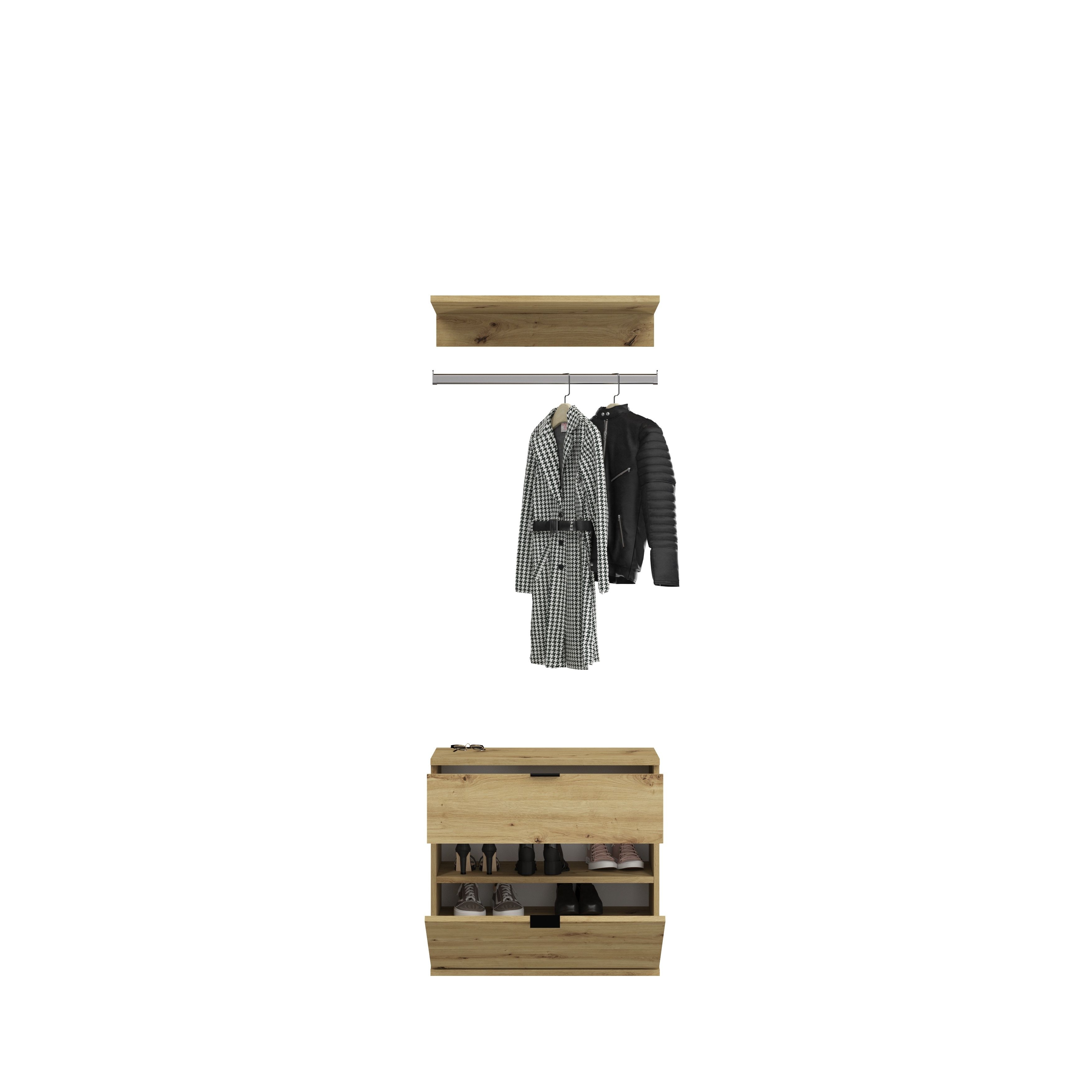 - Funktionalität: Mit einer Kombination aus shelffächern und Kleiderstangen bietet die Garderobenkombination ausreichend Platz zur Aufbewahrung von Kleidung und Accessoires. Die durchdachte Anordnung der Elemente ermöglicht eine organisierte Aufbewahrung und einen bequemen Zugriff auf benötigte Gegenstände.