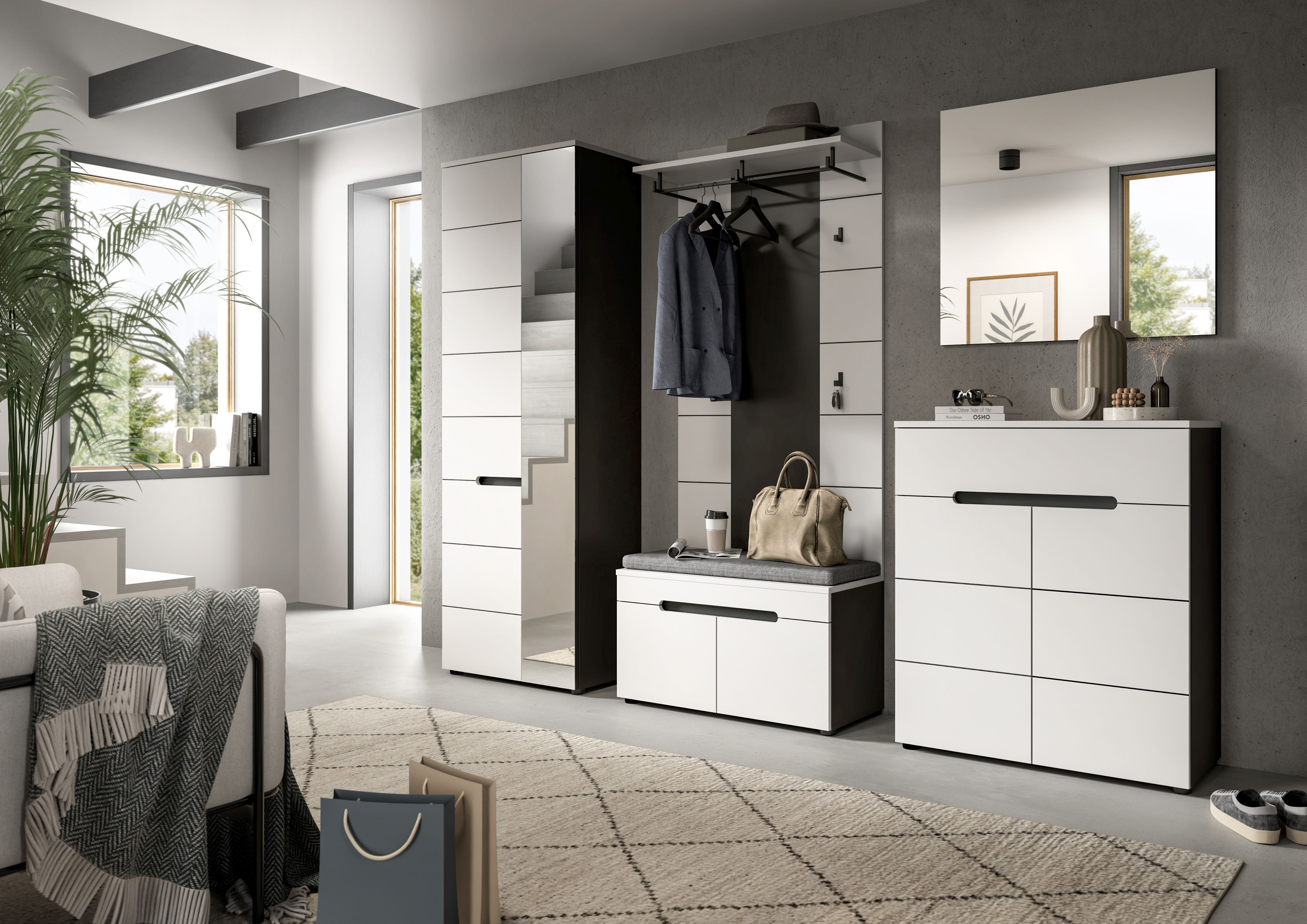 Entdecken Sie die großzügige Garderobenkombination (B/H/T: 255x190x37 cm) in basaltgrauer Nachbildung und Weiß! Dieses umfassende Set besteht aus einem Garderobenschrank, einer bequemen Sitzbank, einem stilvollen Paneel, einer praktischen Schuhkommode und einem Spiegel. Es bietet nicht nur ausreichend Stauraum, sondern schafft auch eine elegante Atmosphäre in Ihrem Flur. Die moderne Gestaltung sorgt für einladendes Flair und hält Ihren Eingangsbereich stets ordentlich. Optimieren Sie Ihren Raum mit dieser hochwertigen Garderobenkombination!