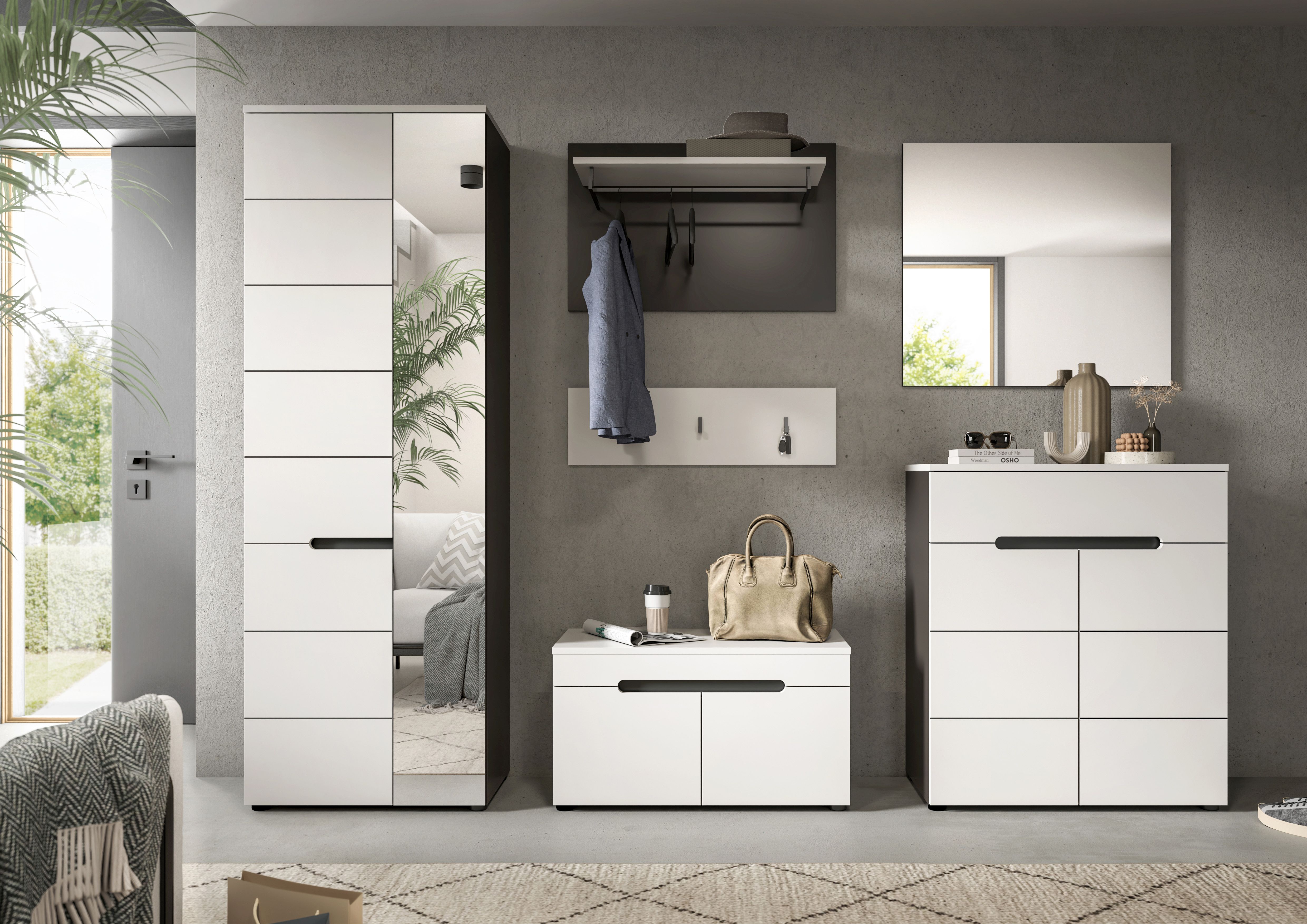 Unsere Garderobenkombination aus hochwertigem Basaltgrau Nachbildung und Weiß bietet eine moderne und funktionale Lösung für Ihren Eingangsbereich. Mit verschiedenen Elementen wie Garderobenschrank, Garderobenpaneel, Sitzbank, Schuhkommode und Spiegel schaffen Sie eine organisierte und einladende Atmosphäre. Entdecken Sie jetzt diese vielseitige und ästhetische Kombination für eine perfekte Garderobe.