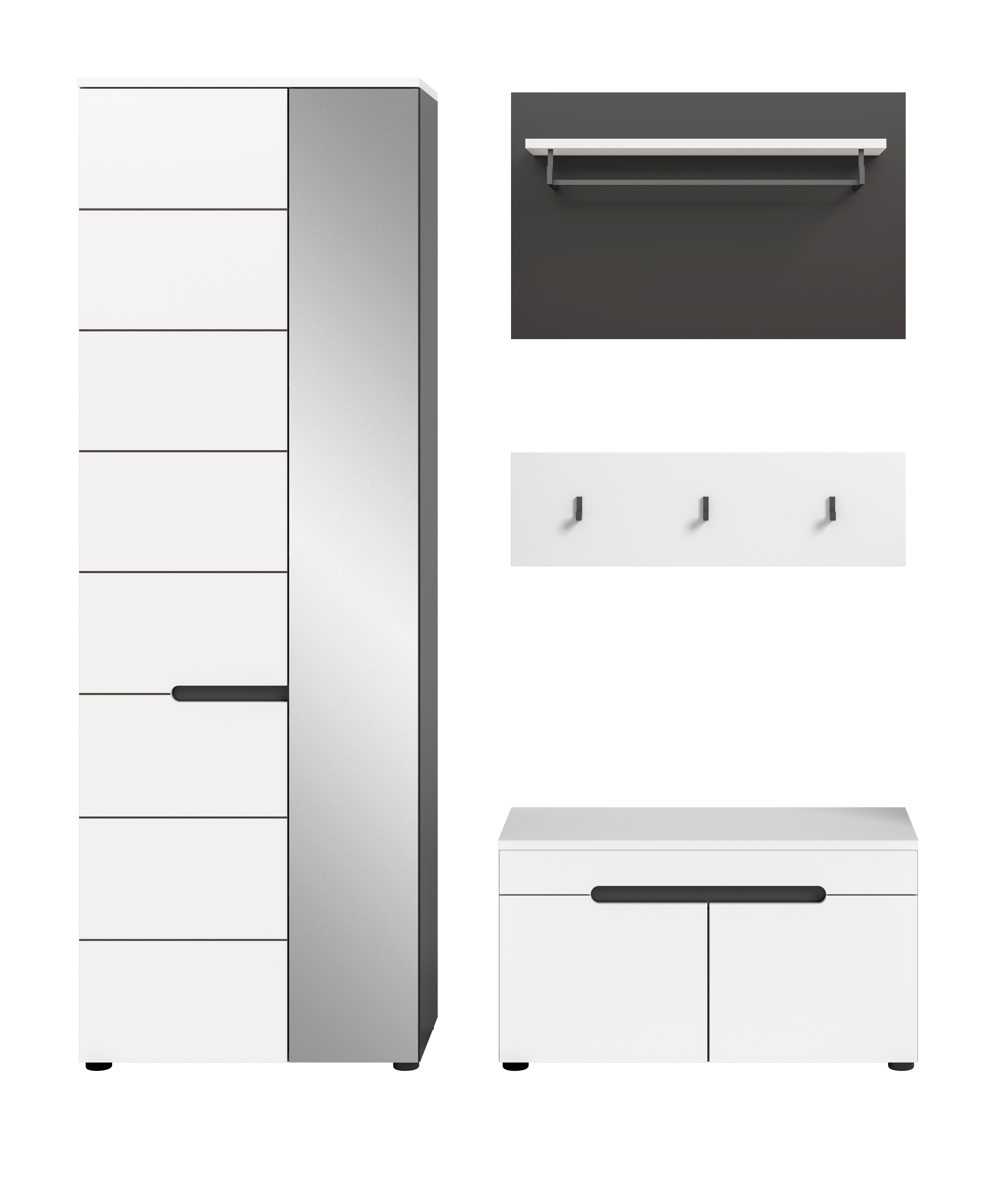 Unsere Garderobenkombination aus hochwertigem Basaltgrau Nachbildung und Weiß bietet eine moderne und funktionale Lösung für Ihren Eingangsbereich. Mit verschiedenen Elementen wie Garderobenschrank, Sitzbank und Garderobenpaneel schaffen Sie eine organisierte und einladende Atmosphäre. Entdecken Sie jetzt diese vielseitige und ästhetische Kombination für eine perfekte Garderobe.