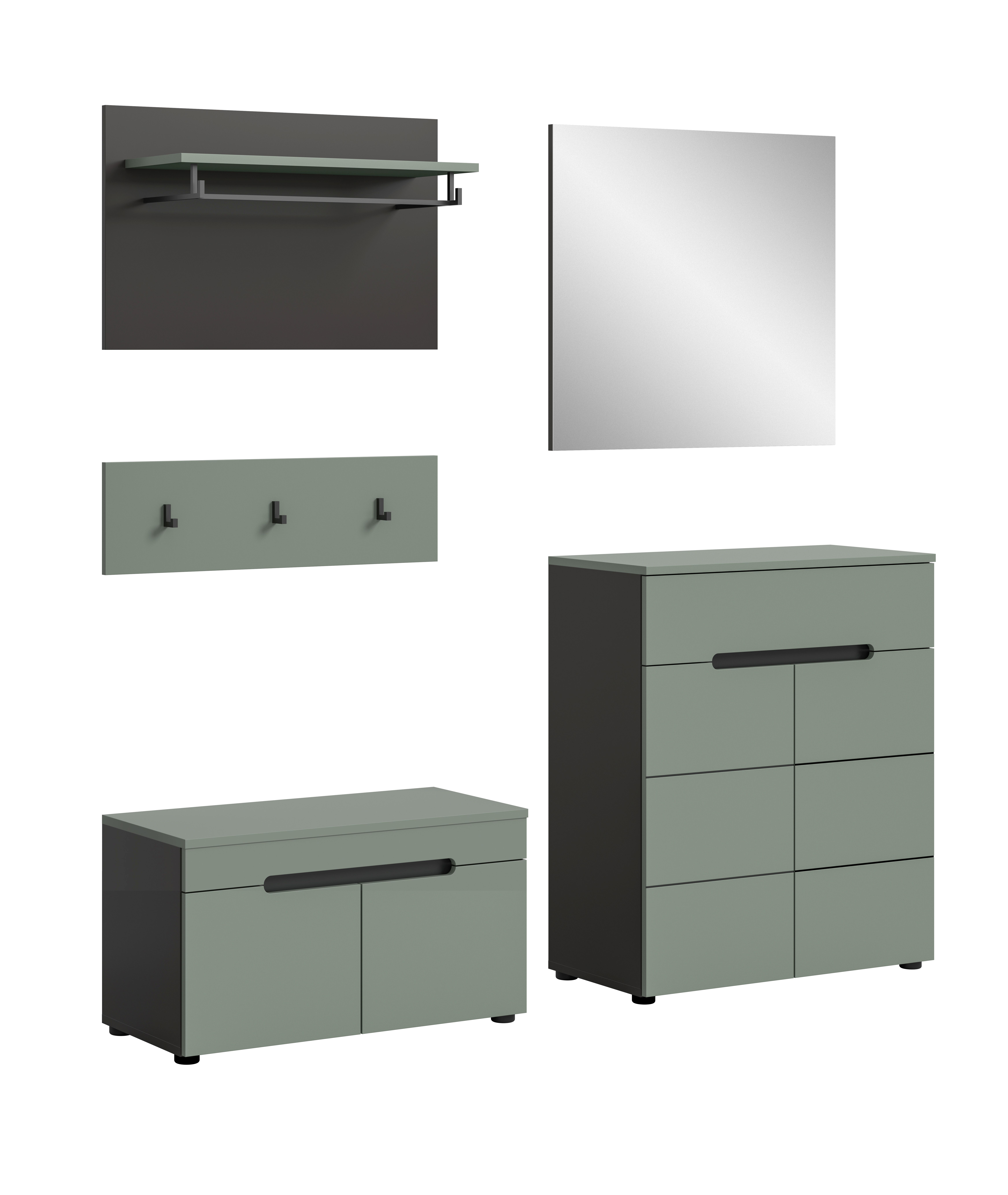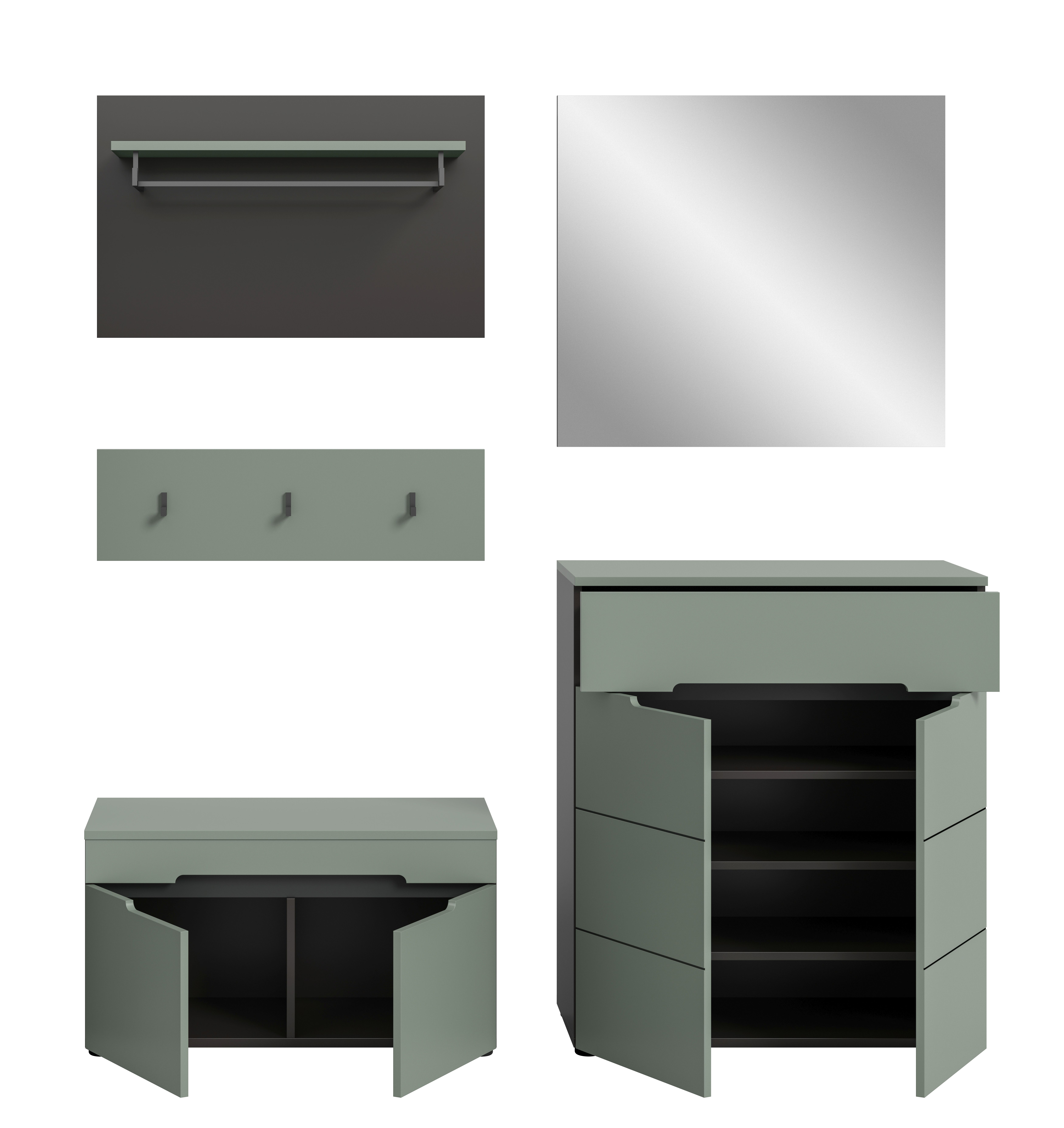 Unsere Garderobenkombination aus hochwertigem Basaltgrau Nachbildung und Smoke Green bietet eine moderne und funktionale Lösung für Ihren Eingangsbereich. Mit verschiedenen Elementen wie Garderobenpaneel, Sitzbank, Schuhkommode und Spiegel schaffen Sie eine organisierte und einladende Atmosphäre. Entdecken Sie jetzt diese vielseitige und ästhetische Kombination für eine perfekte Garderobe.