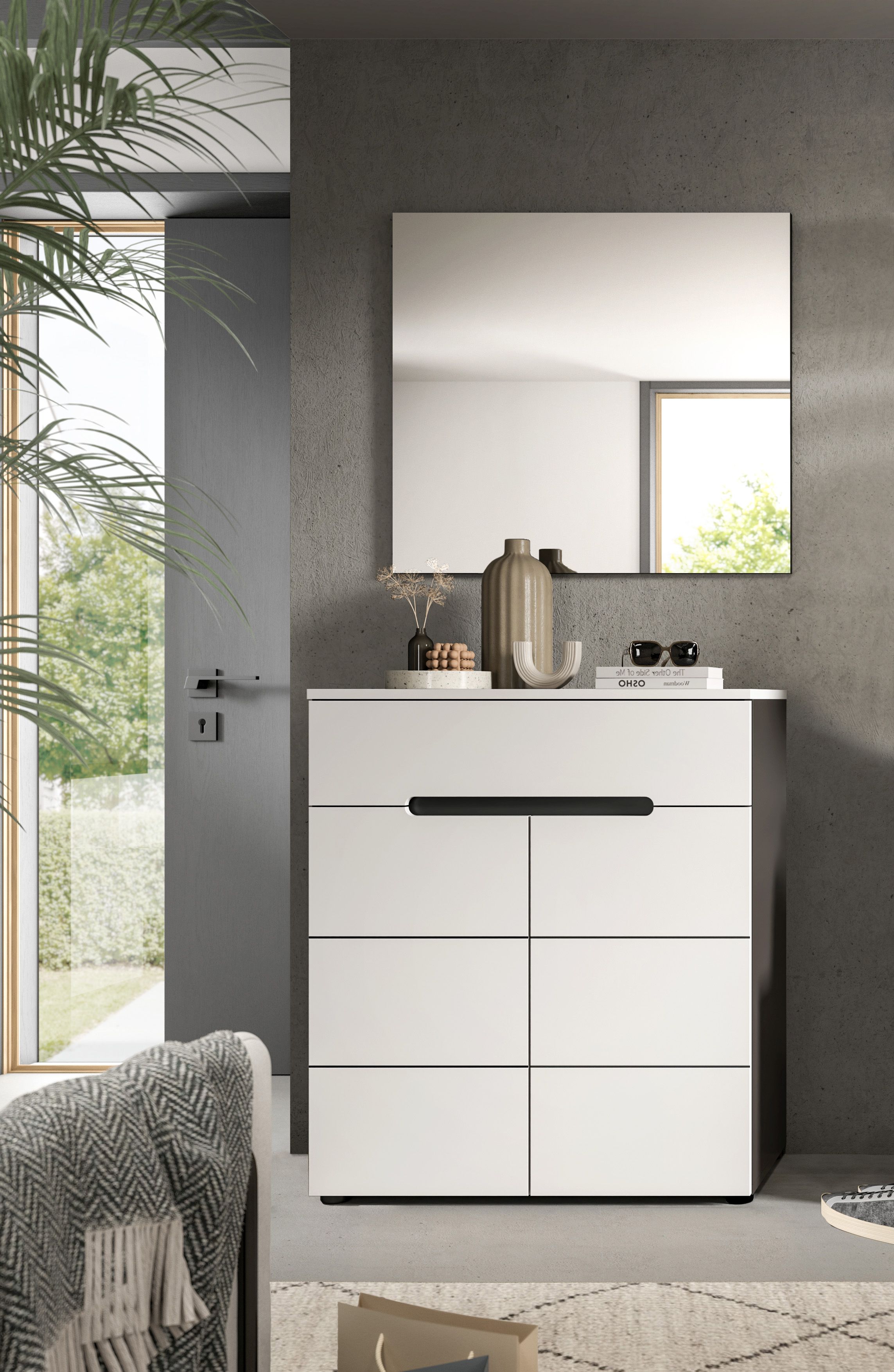 Unsere Garderobenkombination aus hochwertigem Basaltgrau Nachbildung und Weiß bietet eine moderne und funktionale Lösung für Ihren Eingangsbereich. Mit verschiedenen Elementen wie Schuhkommode und Spiegel schaffen Sie eine organisierte und einladende Atmosphäre. Entdecken Sie jetzt diese vielseitige und ästhetische Kombination für eine perfekte Garderobe.