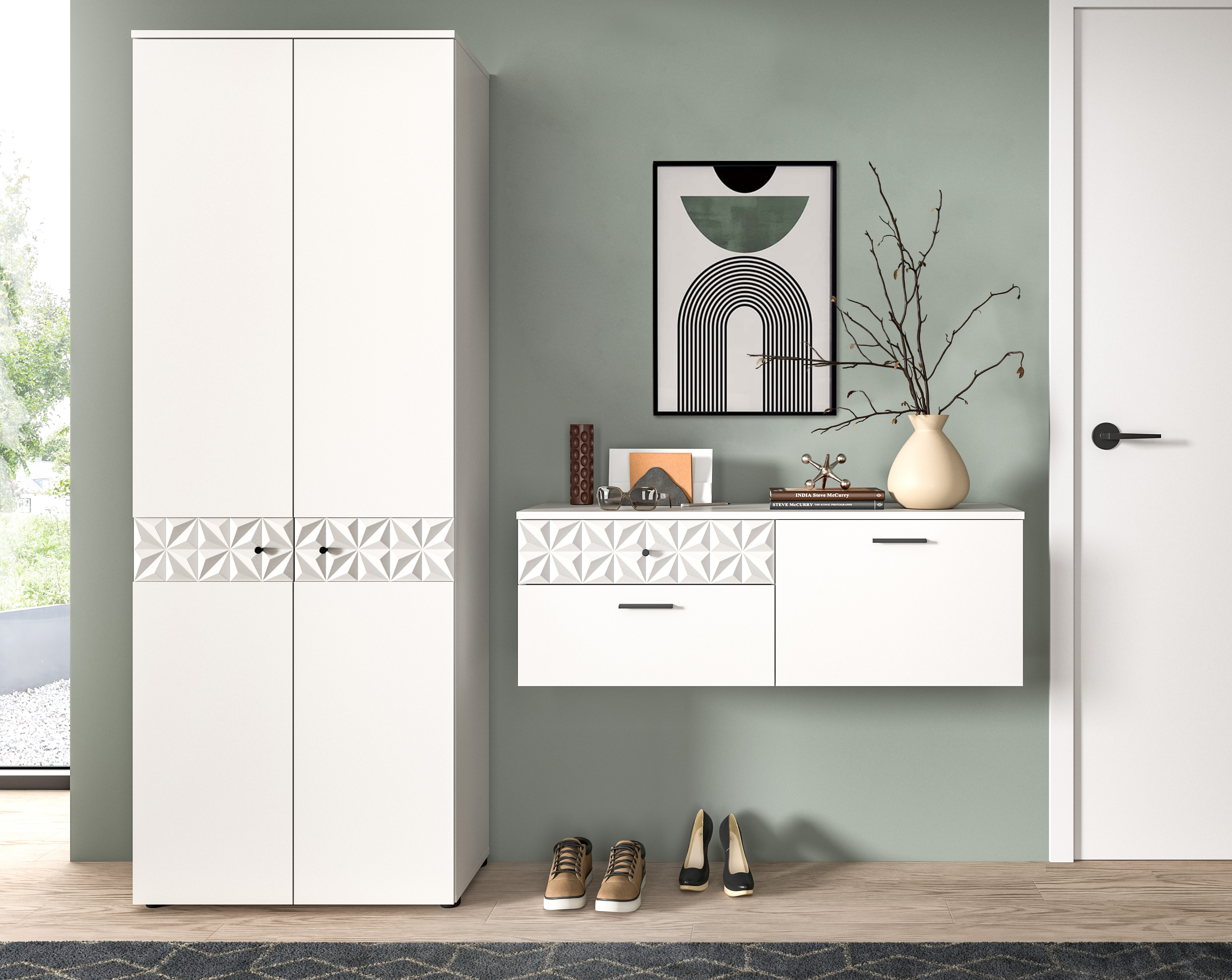 - Design/Stil: Die Garderobenkombination in Weiß Nachbildung und Weiß Hochglanz überzeugt mit ihrem modernen und eleganten Erscheinungsbild. Die hochwertige Rillenoptik verleiht den Möbeln einen Hauch von Raffinesse.
