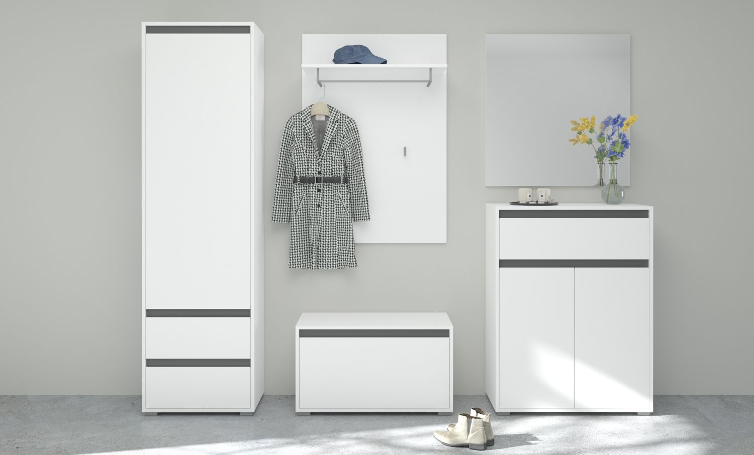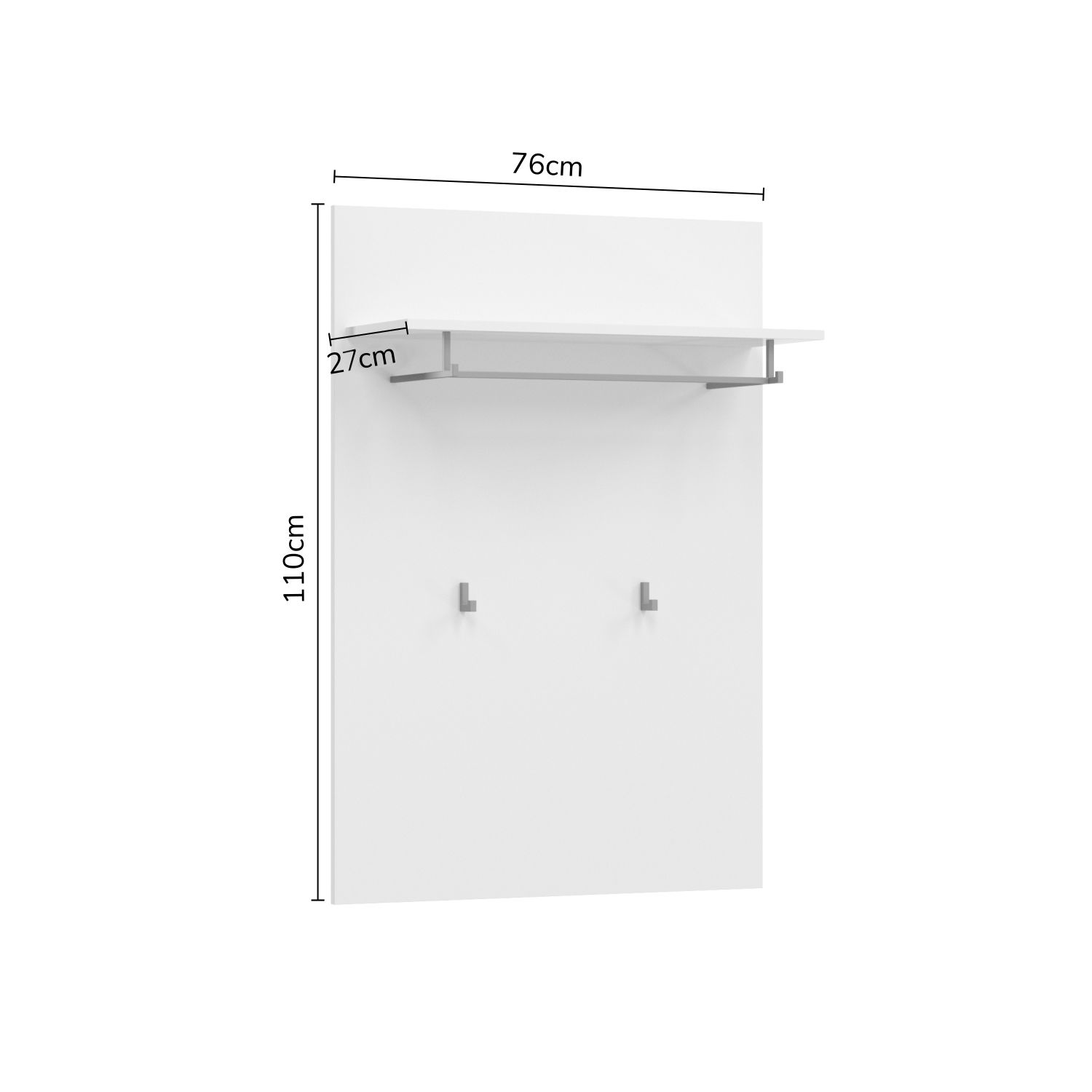 Entdecken Sie unser vielseitiges Garderobepaneel in weiß, welches die perfekte Einrichtung für Flur oder Diele darstellt. Mit Maßen von 76/110/27 cm bietet dieses Paneel nicht nur ausreichend Platz für Ihre Jacken und Accessoires, sondern verleiht auch Ihrem Eingangsbereich eine ordentliche und stilvolle Note. Sein zeitloses Design und die hochwertige Verarbeitung machen es zu einem unverzichtbaren Element für eine organisierte und ästhetische Raumgestaltung.