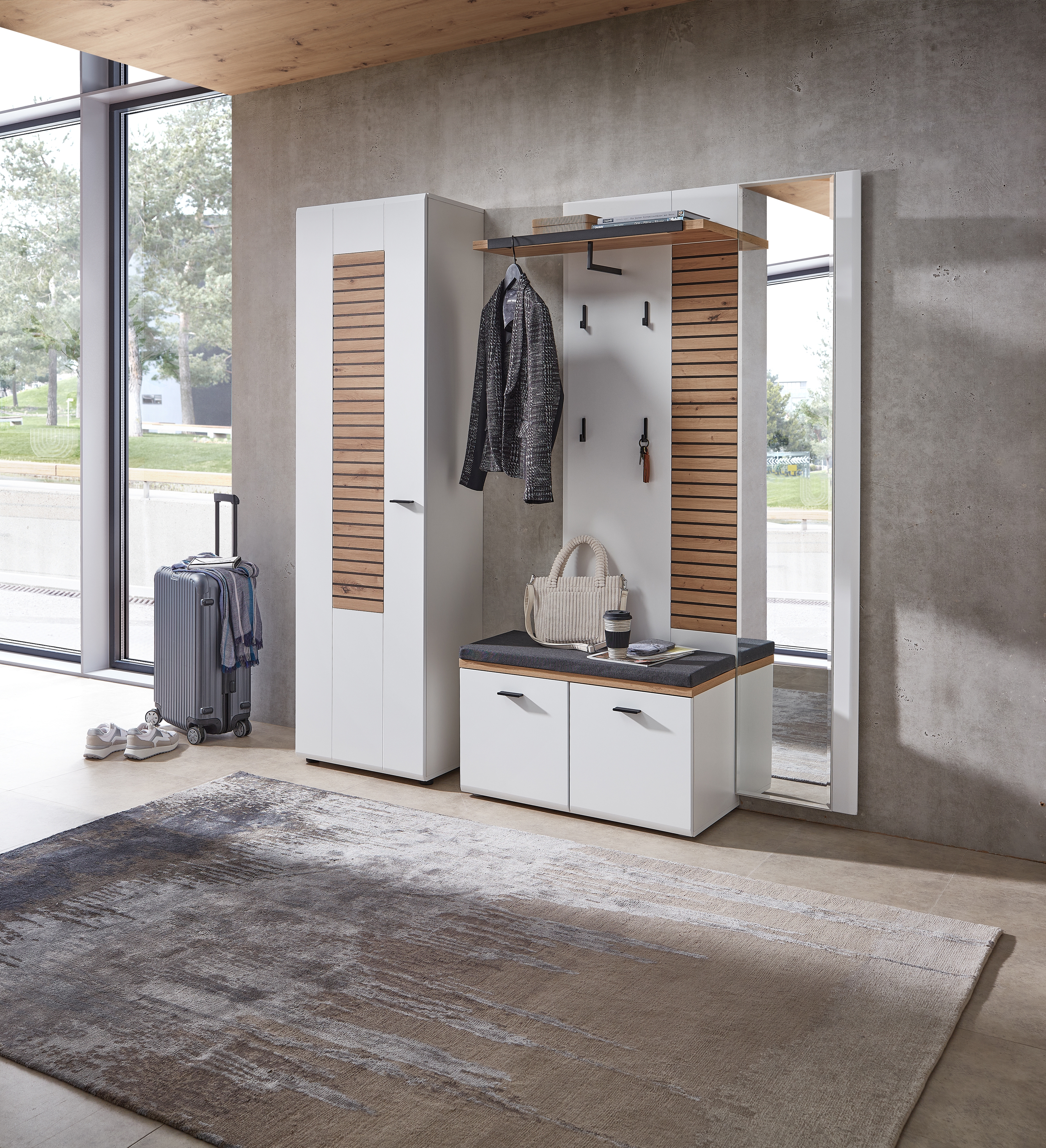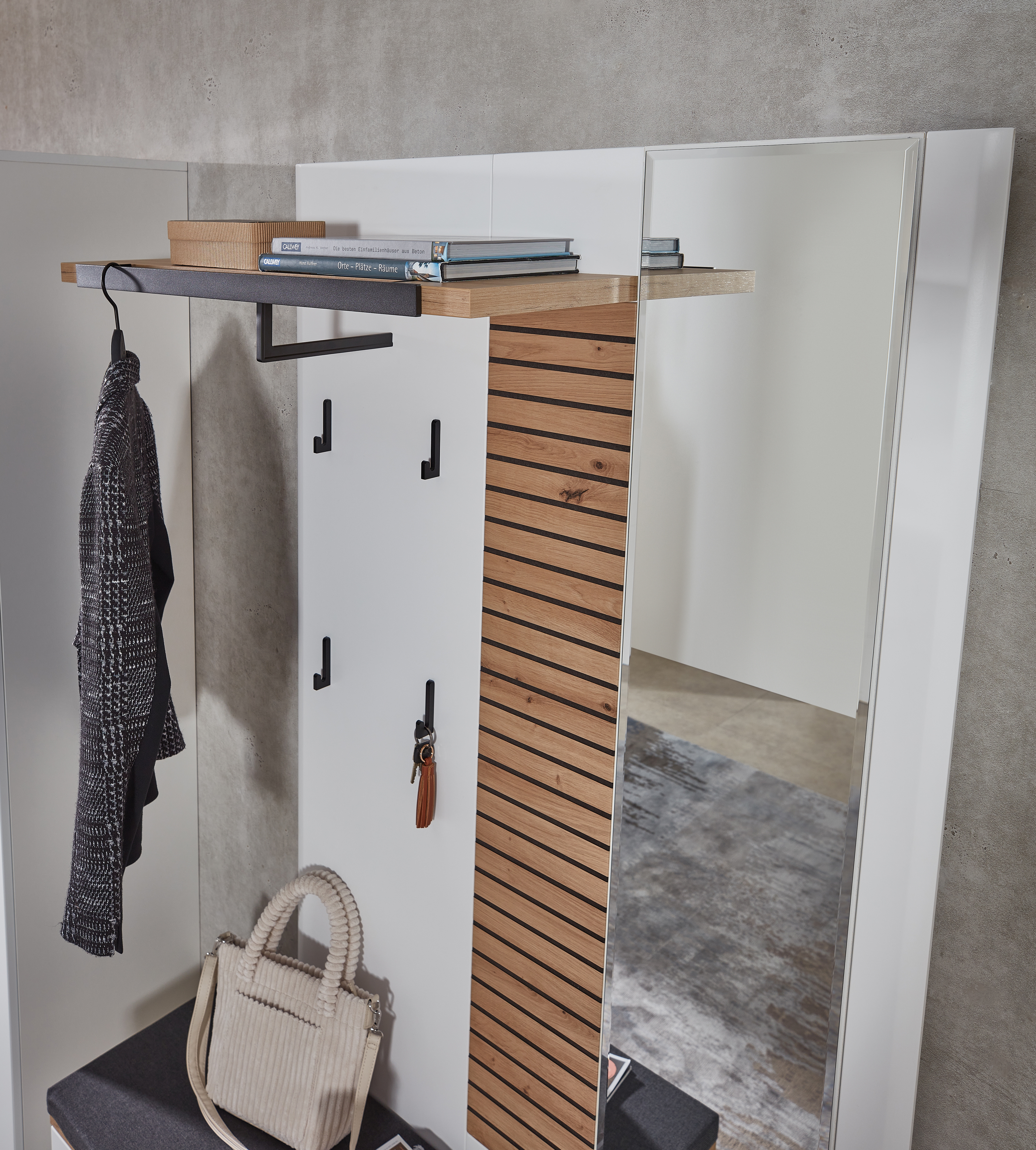 Front: Weiß matt MDF (Mitteldichte Holzfaserplatte) mit Absetzungen in Artisan Eiche Holznachbildung MDF Leistenoptik / Spiegel