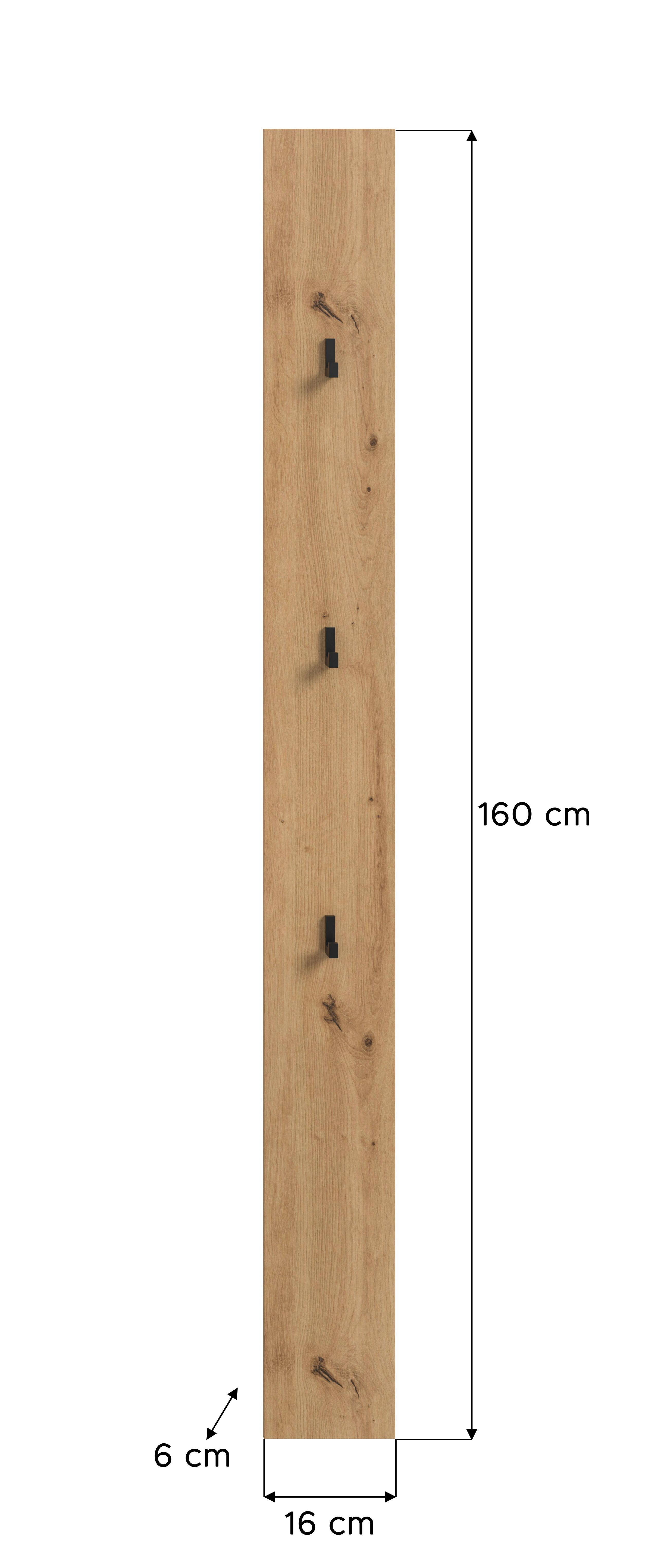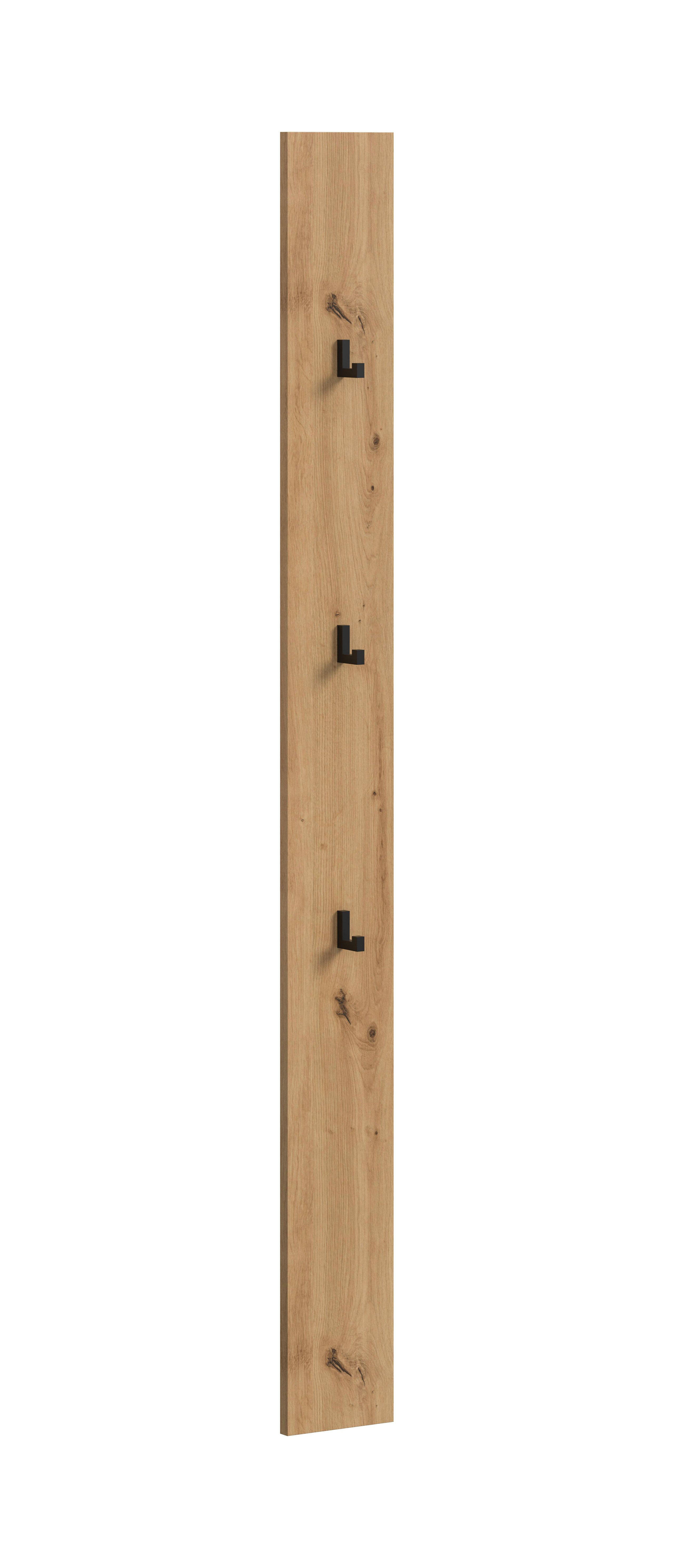 Das Garderobenpaneel 16x160x6 cm in Artisan Oak Nachbildung bietet 3 schwarze Metallhaken für Jacken und Accessoires. FSC®-zertifizierter Holzwerkstoff garantiert Nachhaltigkeit. Die pflegeleichte Oberfläche und schnelle Montage machen es besonders nutzerfreundlich. Erweitere dein Flur-Setup flexibel mit weiteren Artikeln der Serie. Für eine ordentliche und stilvolle Garderobe.
