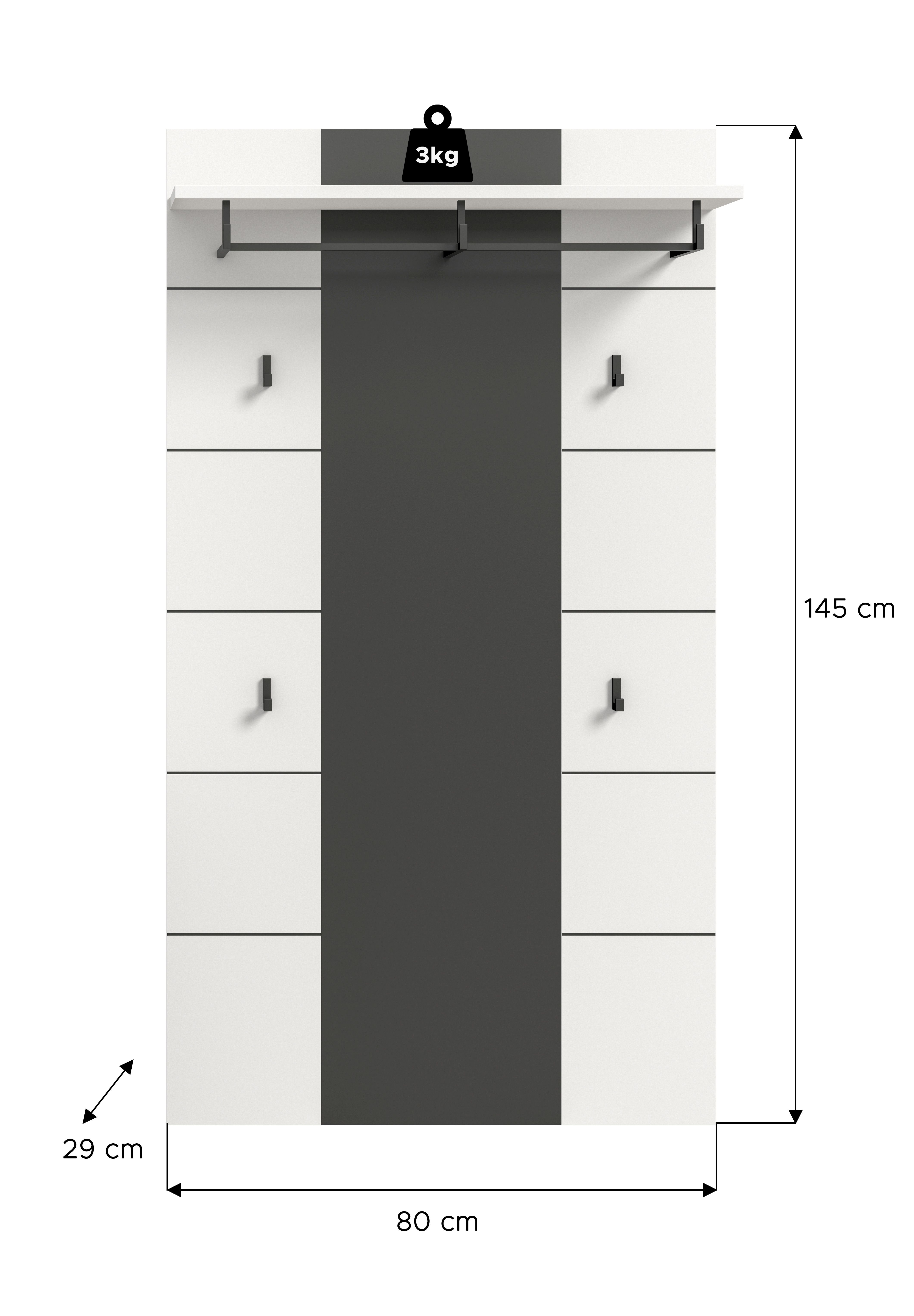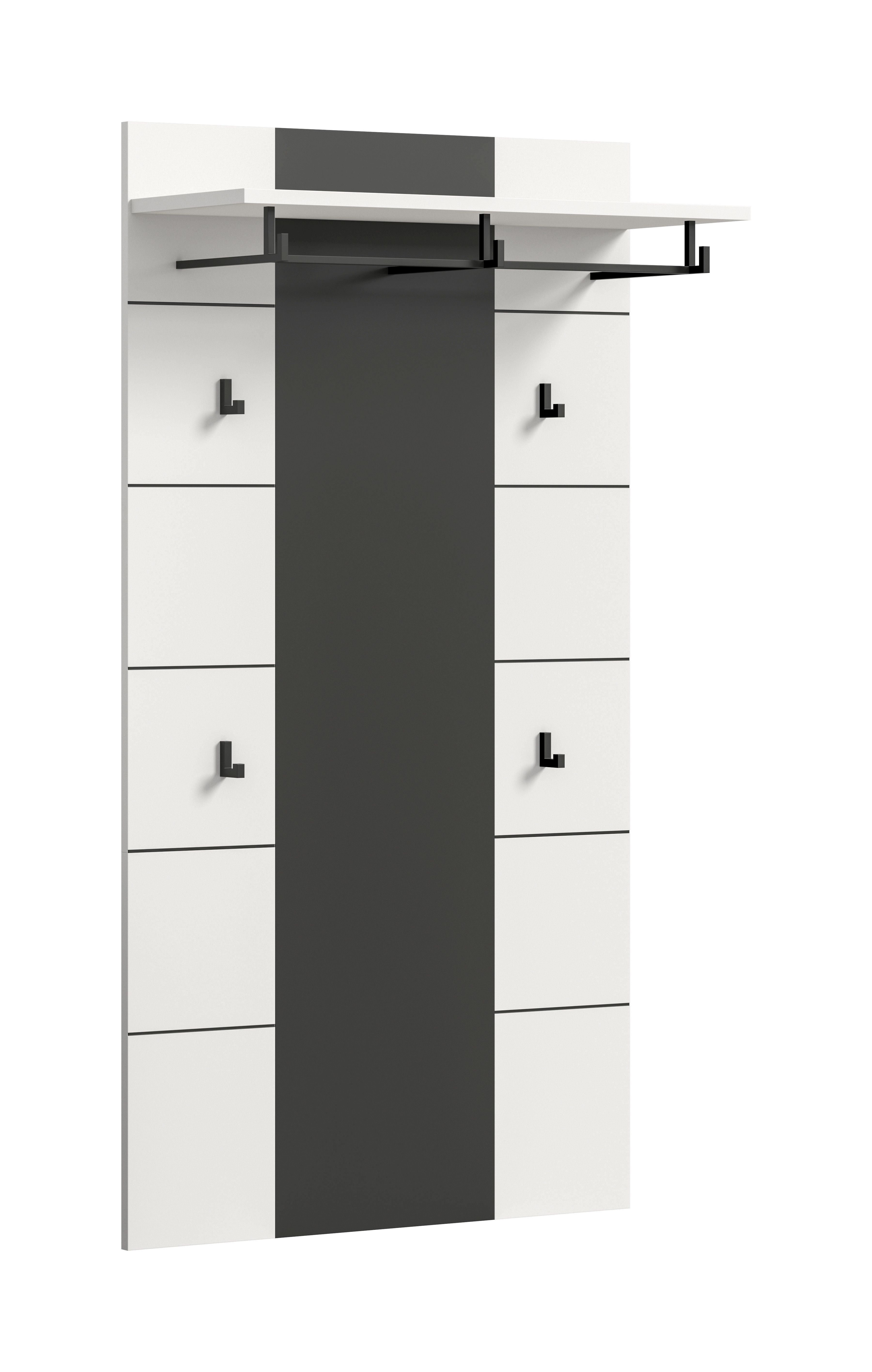 Unser vielseitiges Paneel (B/H/T: 80x141x29 cm) in basalt grauer Nachbildung und Weiß ist die ideale Wahl für Ihren Eingangsbereich. Mit einem durchdachten Design bietet es Platz für Jacken, Taschen und Schlüssel, während die stilvollen Haken für eine ordentliche Aufbewahrung sorgen. Die helle, moderne Optik des Paneels fügt sich nahtlos in Ihr Zuhause ein und verleiht Ihrem Flur eine freundliche Ausstrahlung. Die kompakte Bauweise gewährleistet, dass es auch in schmalen Räumen hervorragend zur Geltung kommt. Bringen Sie mit diesem praktischen Paneel Ordnung in Ihre Garderobe und gestalten Sie einen einladenden Einstieg in Ihr Zuhause!