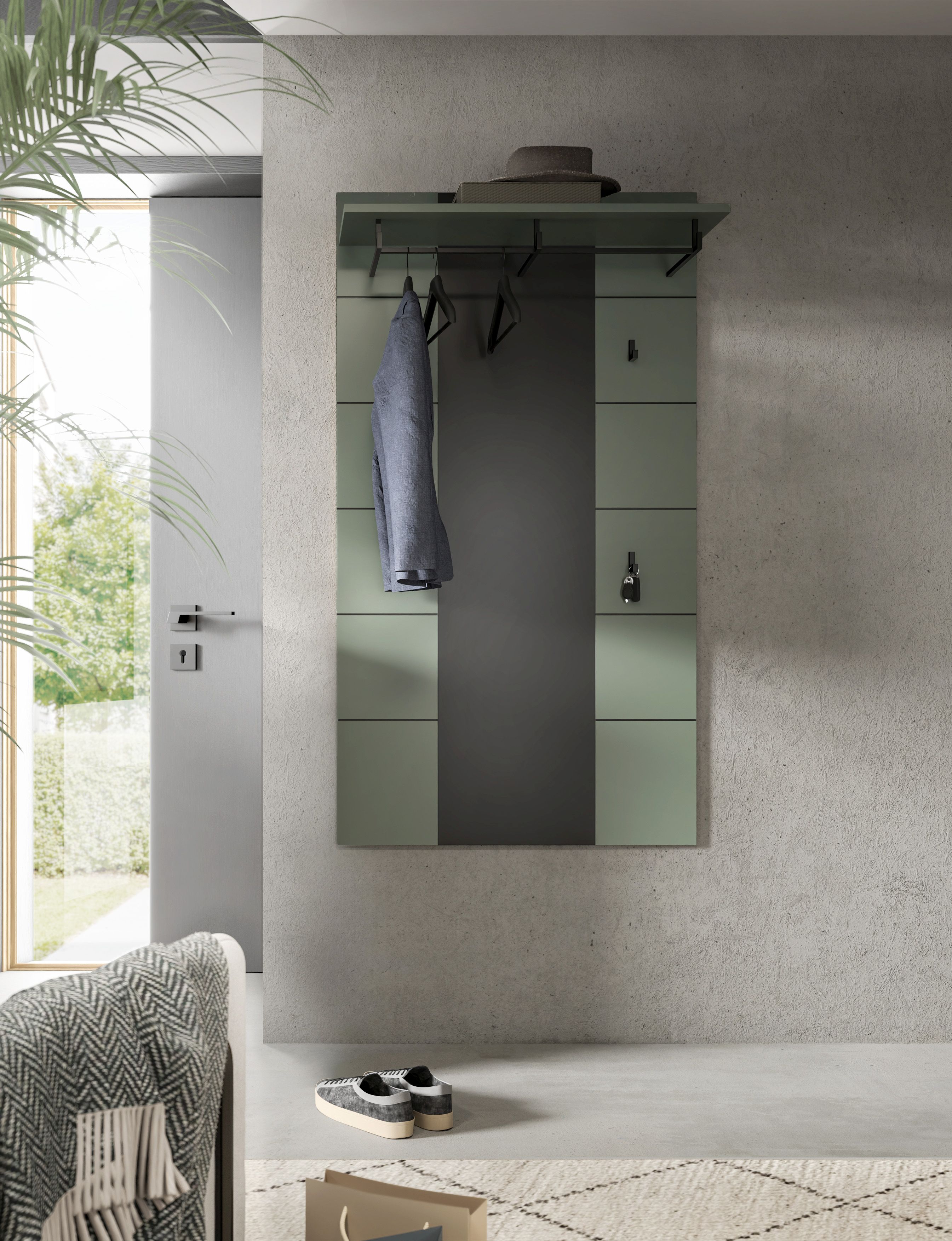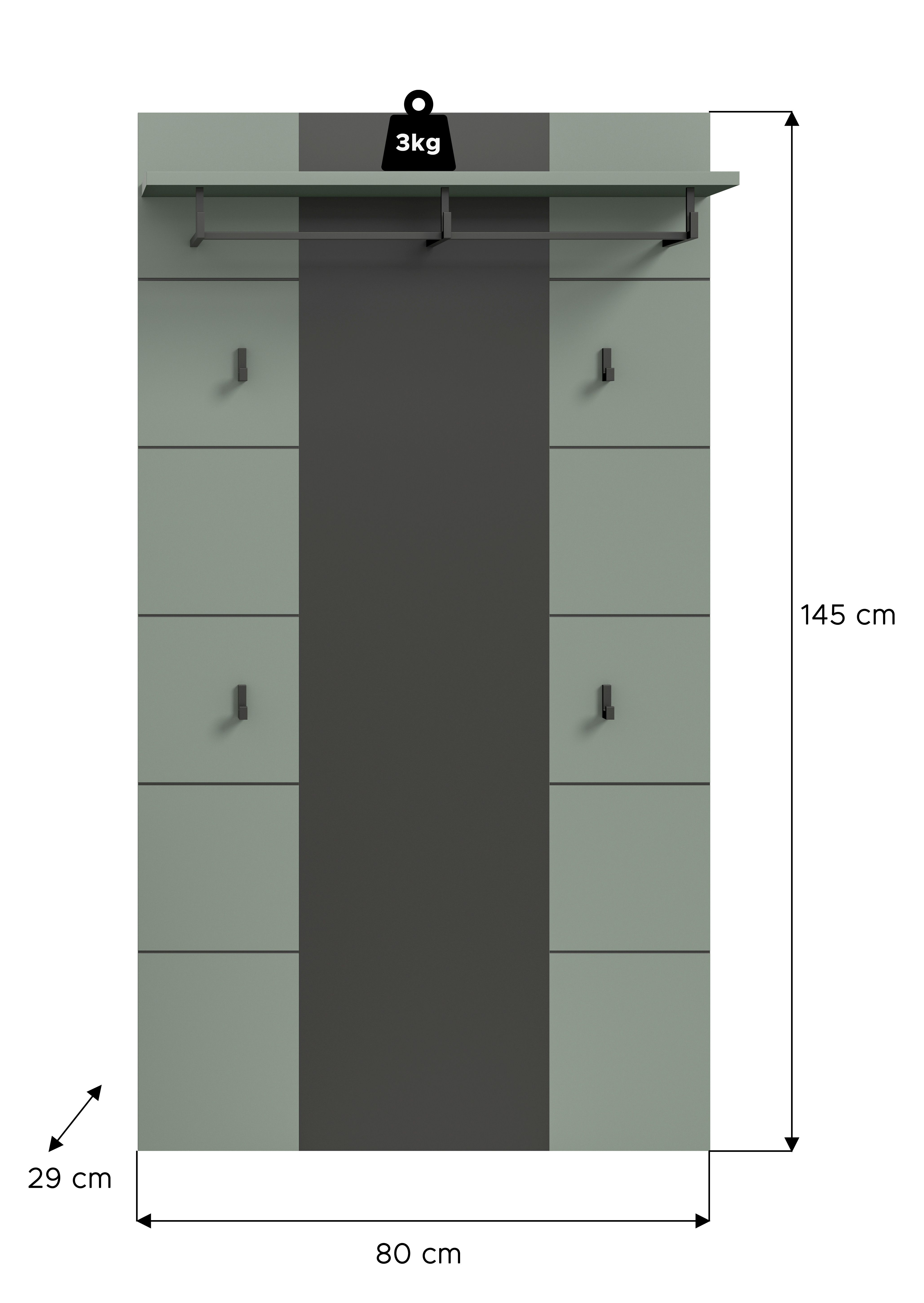 Unser vielseitiges Paneel (B/H/T: 80x141x29 cm) in basalt grauer Nachbildung und Smoke Green ist die ideale Wahl für Ihren Eingangsbereich. Mit einem durchdachten Design bietet es Platz für Jacken, Taschen und Schlüssel, während die stilvollen Haken für eine ordentliche Aufbewahrung sorgen. Die helle, moderne Optik des Paneels fügt sich nahtlos in Ihr Zuhause ein und verleiht Ihrem Flur eine freundliche Ausstrahlung. Die kompakte Bauweise gewährleistet, dass es auch in schmalen Räumen hervorragend zur Geltung kommt. Bringen Sie mit diesem praktischen Paneel Ordnung in Ihre Garderobe und gestalten Sie einen einladenden Einstieg in Ihr Zuhause!