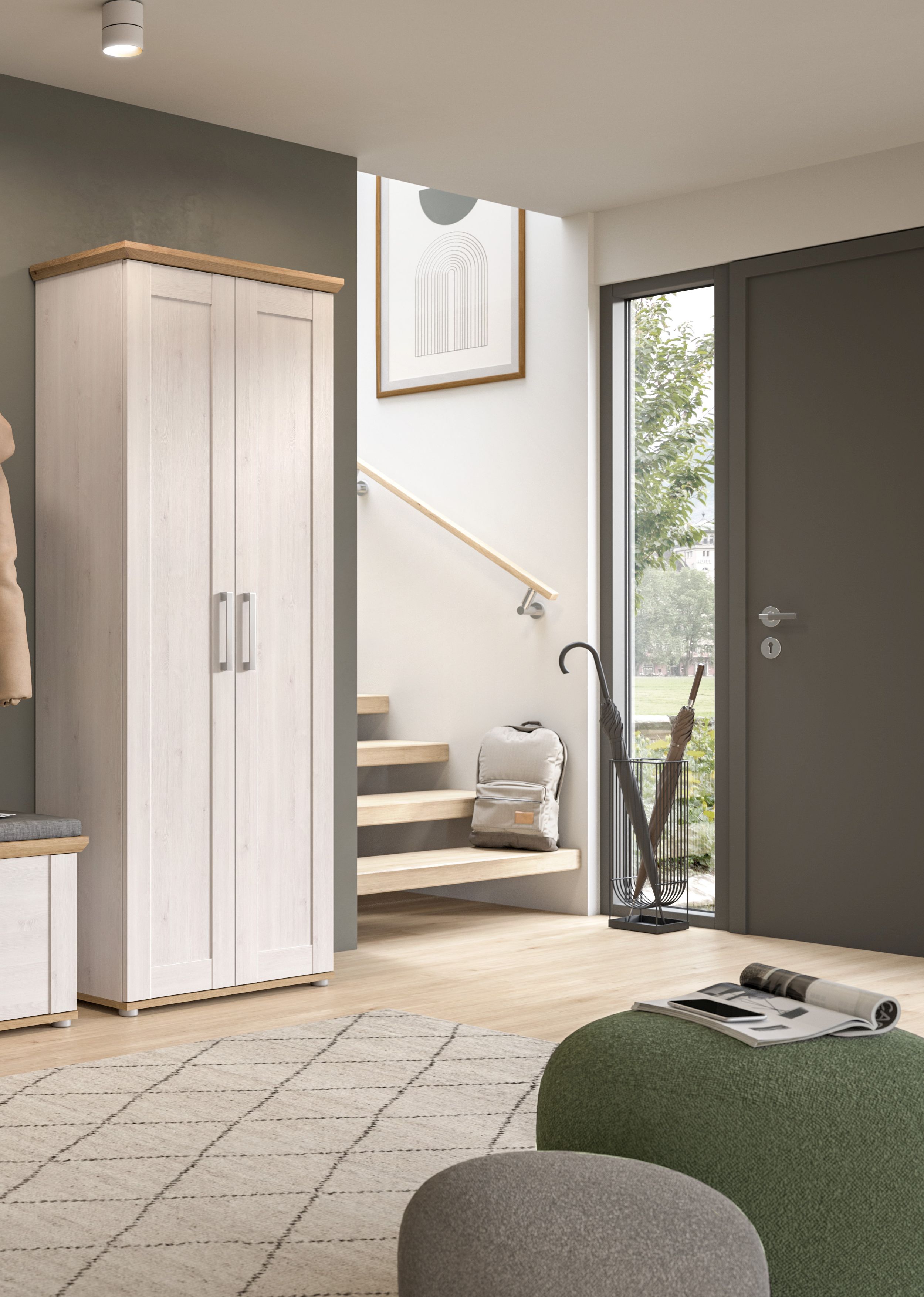 - Design/Stil: Der Garderobenschrank in Sibiu Lärche Nachbildung verleiht dem Flur oder der Diele eine natürliche und rustikale Ästhetik, die sich gut in verschiedene Einrichtungsstile einfügt und eine warme und einladende Atmosphäre schafft.