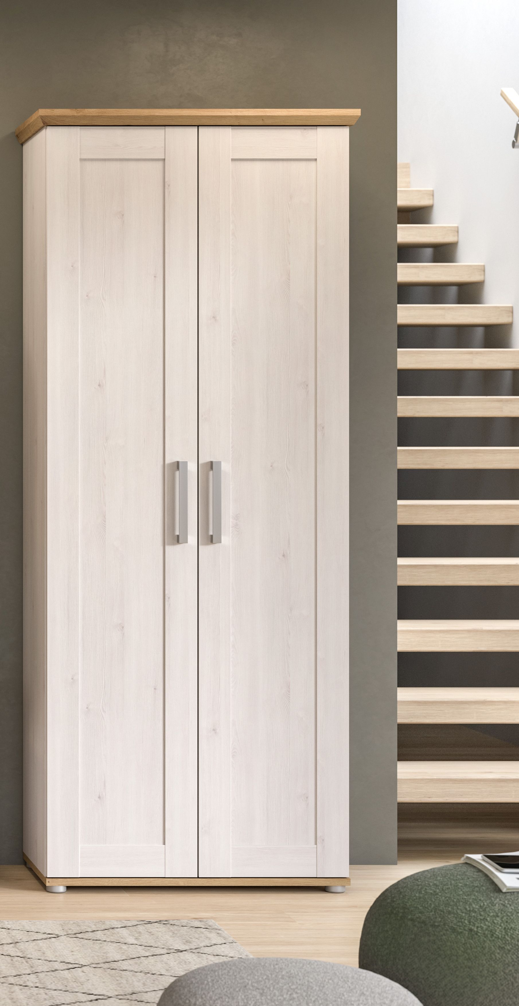 - Funktionalität: Mit großzügigem Stauraum bietet der Garderobenschrank ausreichend Platz für die Aufbewahrung von Jacken, Mänteln, Schuhen und anderen Accessoires, während die oberen Ablageflächen zusätzlichen Stauraum bieten.