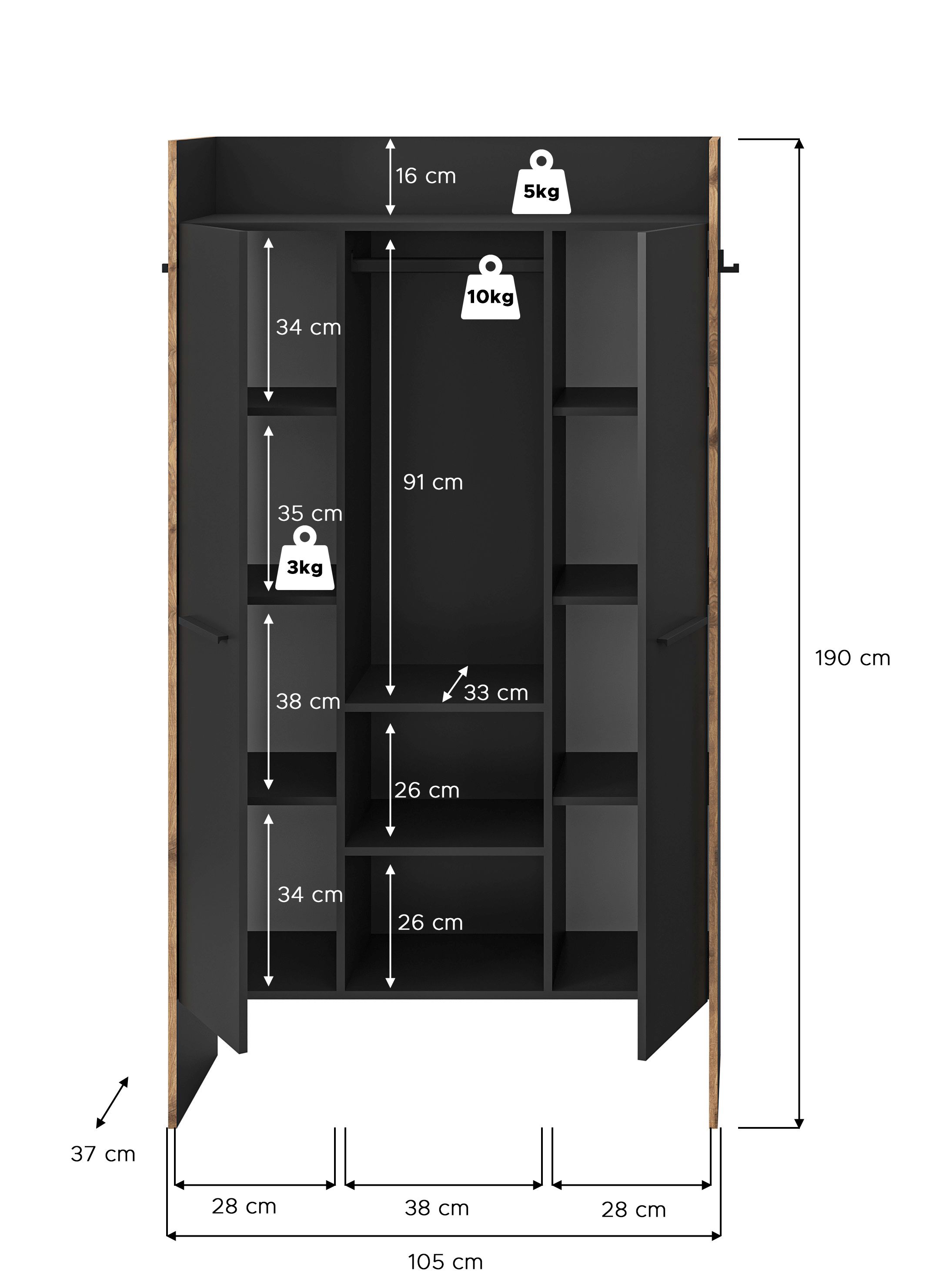 Dieser Garderobenschrank bietet Ihnen eine perfekte Kombination aus Funktionalität und Stil, die Ihren Eingangsbereich optimal organisiert und verschönert. Stellen Sie sich vor, wie Sie jeden Tag mit einem aufgeräumten und einladenden Zuhause starten – dieser Schrank macht es möglich. Gefertigt aus hochwertigem Basalt Melamin besticht er durch seine moderne Optik und Langlebigkeit. Mit den Maßen 105 x 189 x 37 cm bietet er ausreichend Platz für Ihre Kleidung dank der praktischen Kleiderstange und zwei Türen, die alles ordentlich verbergen. Die integrierte Sitzfläche ist bis zu 90 kg belastbar und lädt zum bequemen An- und Ausziehen ein. Ob Jacken, Mäntel oder Schuhe – dieser Garderobenschrank schafft Ordnung im Flur, Schlafzimmer oder Ankleidezimmer. Verlassen Sie sich auf Qualität und durchdachtes Design, das viele zufriedene Kunden überzeugt hat. Warten Sie nicht länger und schaffen Sie sich jetzt Ihren neuen Ordnungshelfer für ein schönes Zuhause! Mit den Maßen von 70 x 189 x 37 cm passt der Schrank ideal auch in kleine Flure oder Nischen. Ob morgens beim schnellen Anziehen der Jacke oder abends beim Schuhewechsel – dieses Möbelstück unterstützt Sie zuverlässig im Alltag.
