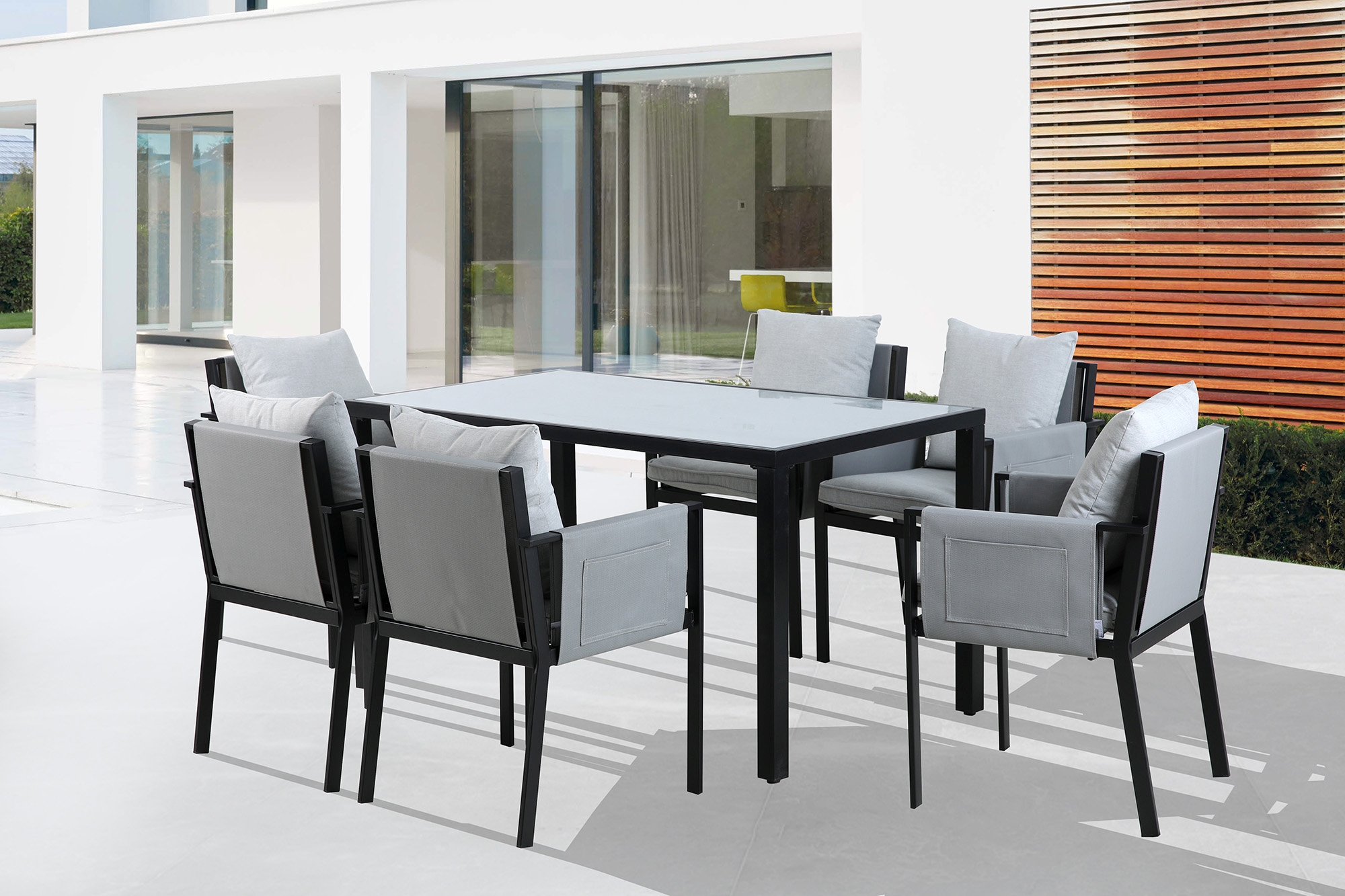 Diese moderne Gartenessgruppe, bestehend aus einem Esstisch, 6 Stühlen, sowie Sitz- und Rückenkissen, bietet Sitzgelegenheiten für 6 Personen. Die ca. 5 cm hohen Sitzkissen, sowie die im Lieferumfang enthaltenen gemütlichen Rückenkissen zum Anlehnen bieten optimalen Sitzkomfort. Die Essgruppe ist die ideale Lösung für Garten, Terrasse, Wintergarten usw. und bietet Platz für gesellige Runden, Familienfeiern oder Grillabende. Das Gestell aus Stahl ist besonders strapazierfähig und robust und somit ideal für den Einsatz im Outdoor-Bereich geeignet. Abgerundet wird der modern-gradlinige Look durch eine Tischplatte aus gehärtetem und satiniertem Glas, sowie grauen Sitzpolstern. Die Abdeckung der Armlehnen verfügen zusätzlich über jeweils eine praktische Seitentasche.