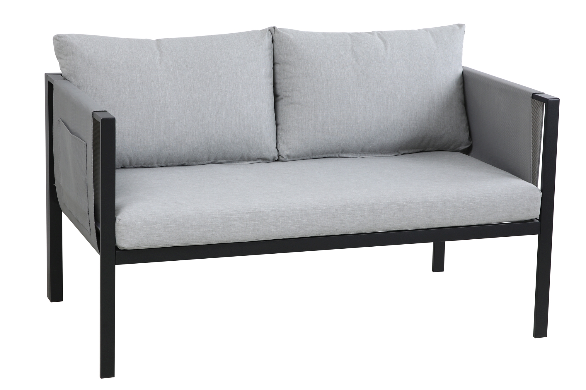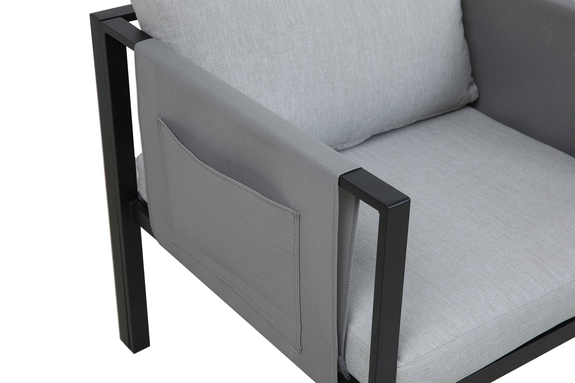 Bezug der Sitzpolster: Olefin (Polyetylen oder Propylen) in der Farbe grau