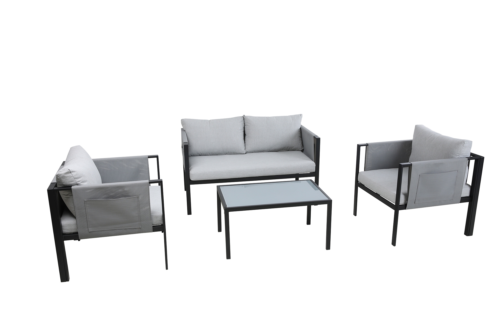 Diese moderne Gartensitzgruppe, bestehend aus einem 2-Sitzer, 2 Sesseln, einem Couchtisch, sowie Sitz- und Rückenkissen, bietet Sitzgelegenheiten für 4 Personen. Die ca. 9 cm hohen Sitzkissen, sowie die im Lieferumfang enthaltenen gemütlichen Rückenkissen zum Anlehnen bieten optimalen Sitzkomfort. Die Essgruppe ist die ideale Lösung für Garten, Terrasse, Wintergarten usw. und bietet Platz für gesellige Runden, Familienfeiern oder Grillabende. Das Gestell aus Stahl ist besonders strapazierfähig und robust und somit ideal für den Einsatz im Outdoor-Bereich geeignet. Abgerundet wird der modern-gradlinige Look durch eine Tischplatte aus gehärtetem und satiniertem Glas, sowie grauen Sitzpolstern. Die Abdeckung der Armlehnen verfügen zusätzlich über jeweils eine praktische Seitentasche.