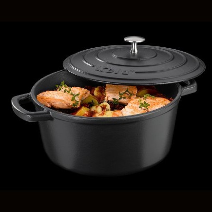 Runder Bräter Calido in Schwarz: Er zeichnet sich aus durch eine Emaille-Beschichtung sowohl innen als auch außen.