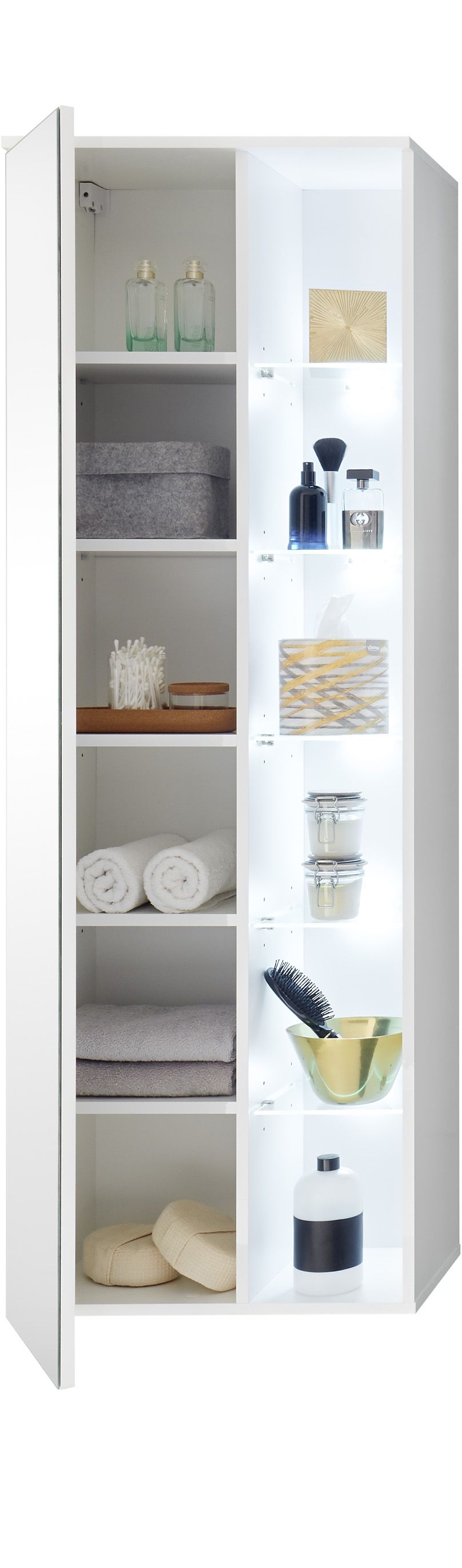 1 Spiegeltür, dahinter 5 Einlegeböden