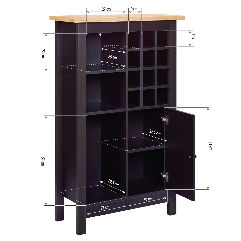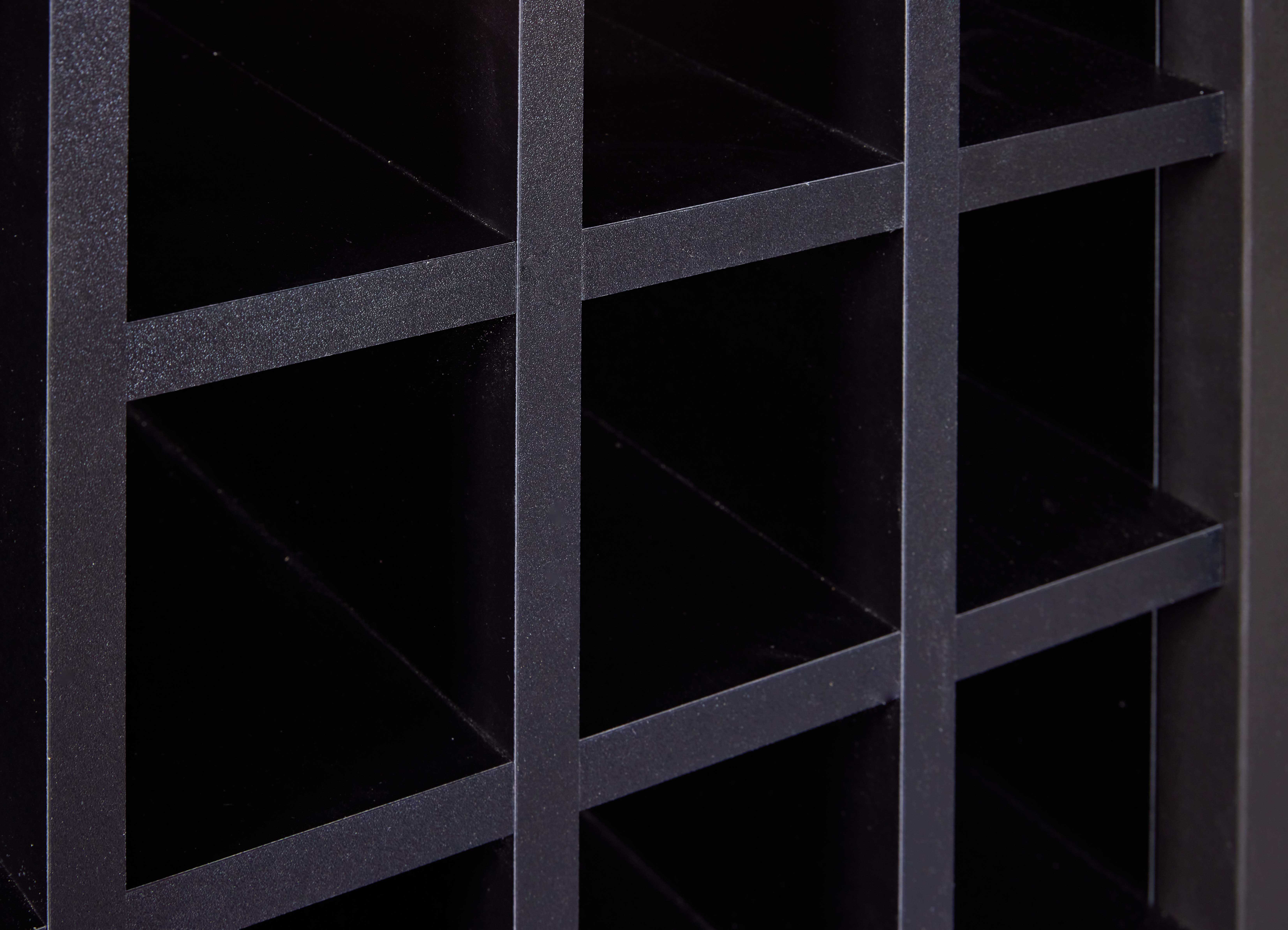 Mit seinen großzügigen Maßen von 76,8 x 33 x 124,4 cm bietet dieser Schrank reichlich Platz für Ihre Weinsammlung. Die durchdachte Innenaufteilung umfasst 3 große Fächer sowie 12 kleine Fächer, die speziell für Flaschen konzipiert sind, sodass Ihre Weinflaschen stets organisiert und griffbereit aufbewahrt werden können. Eine Tür vervollständigt das Design und sorgt für einen eleganten Abschluss. Das elegante schwarze Finish verleiht dem Weinschrank eine ansprechende Ästhetik, die sich nahtlos in verschiedene Einrichtungsstile einfügt.