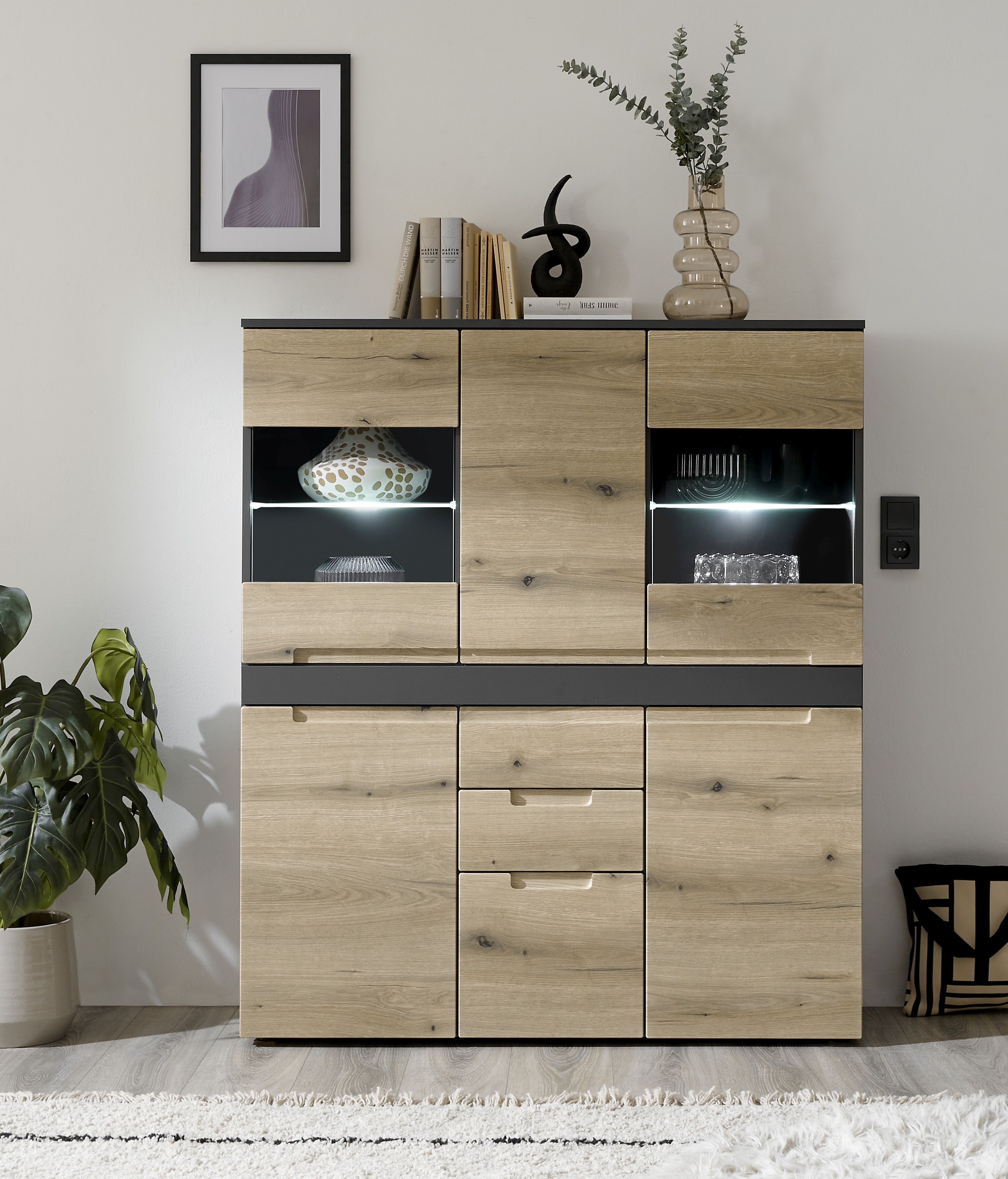 Front: Evoke Tiefzieh Holznachbildung, MDF (Mitteldichte Holzfaserplatte) foliert / Glas