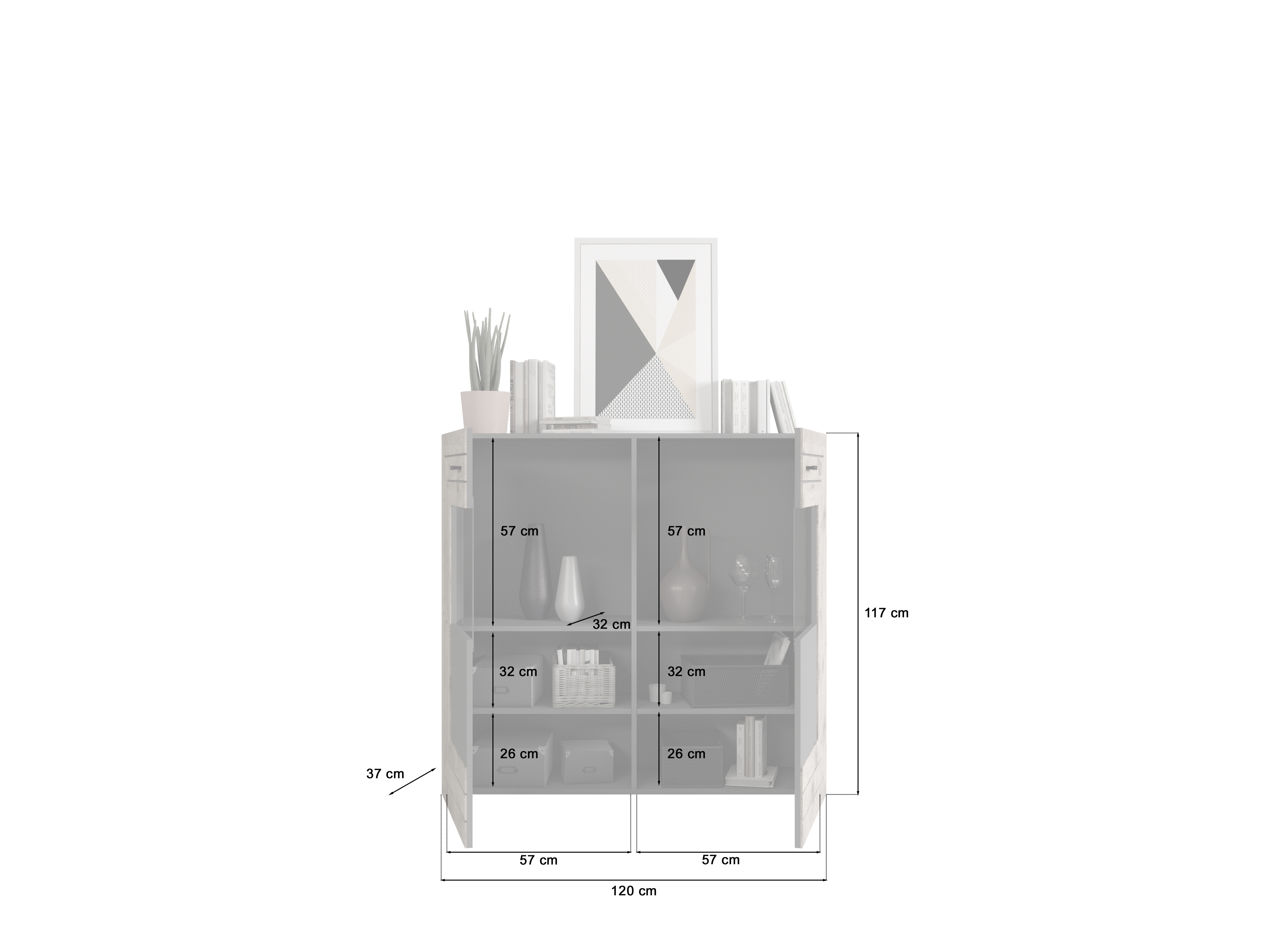 Unser Highboard in edler Grau-Nachbildung ist die ideale Lösung für stilvolle Aufbewahrung. Mit Maßen von 120x117x37 cm bietet es nicht nur ausreichend Platz für Ihre Gegenstände, sondern fügt sich auch nahtlos in jedes Wohnambiente ein. Entdecken Sie jetzt dieses praktische Möbelstück für Ihr Zuhause!