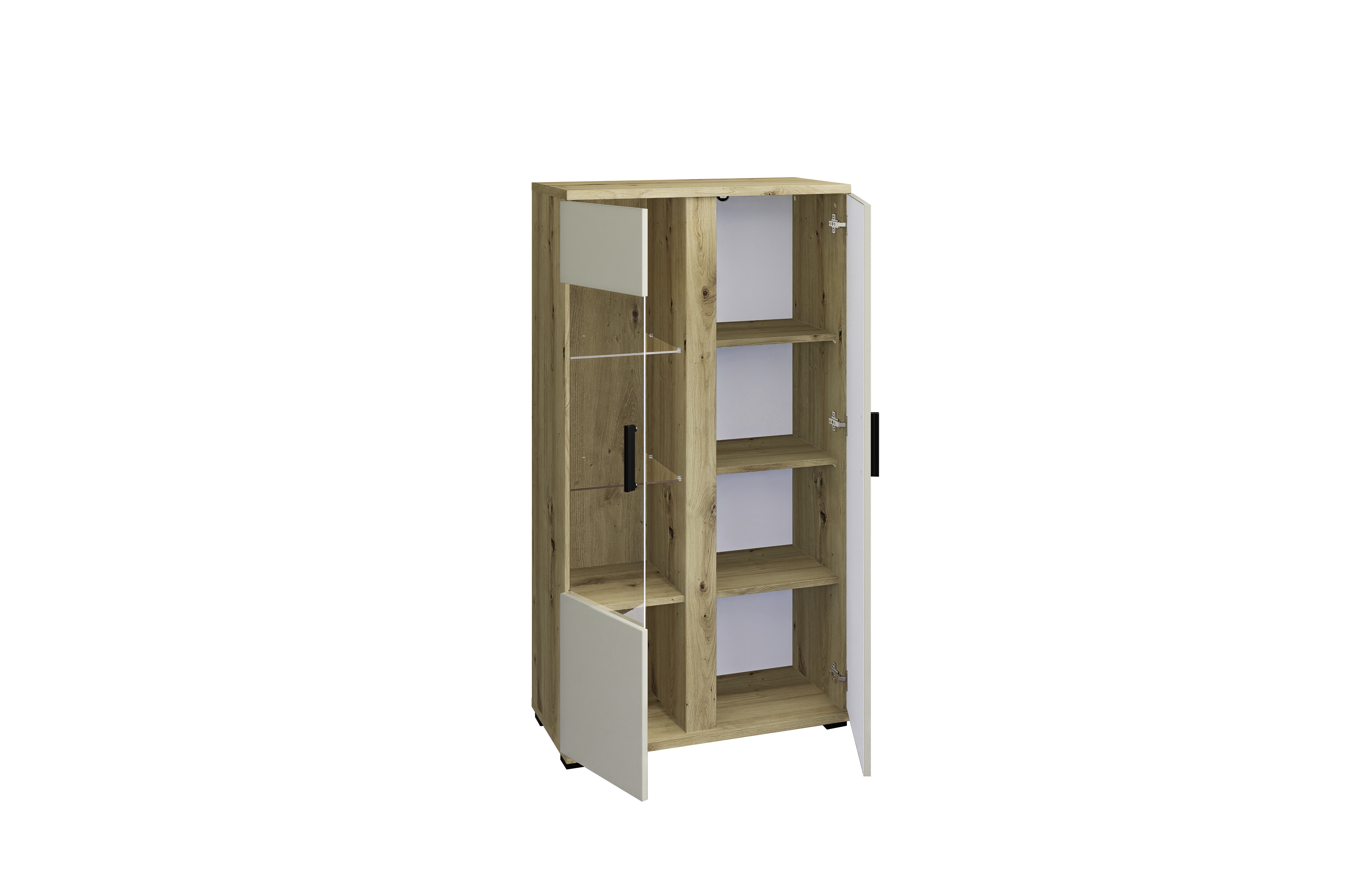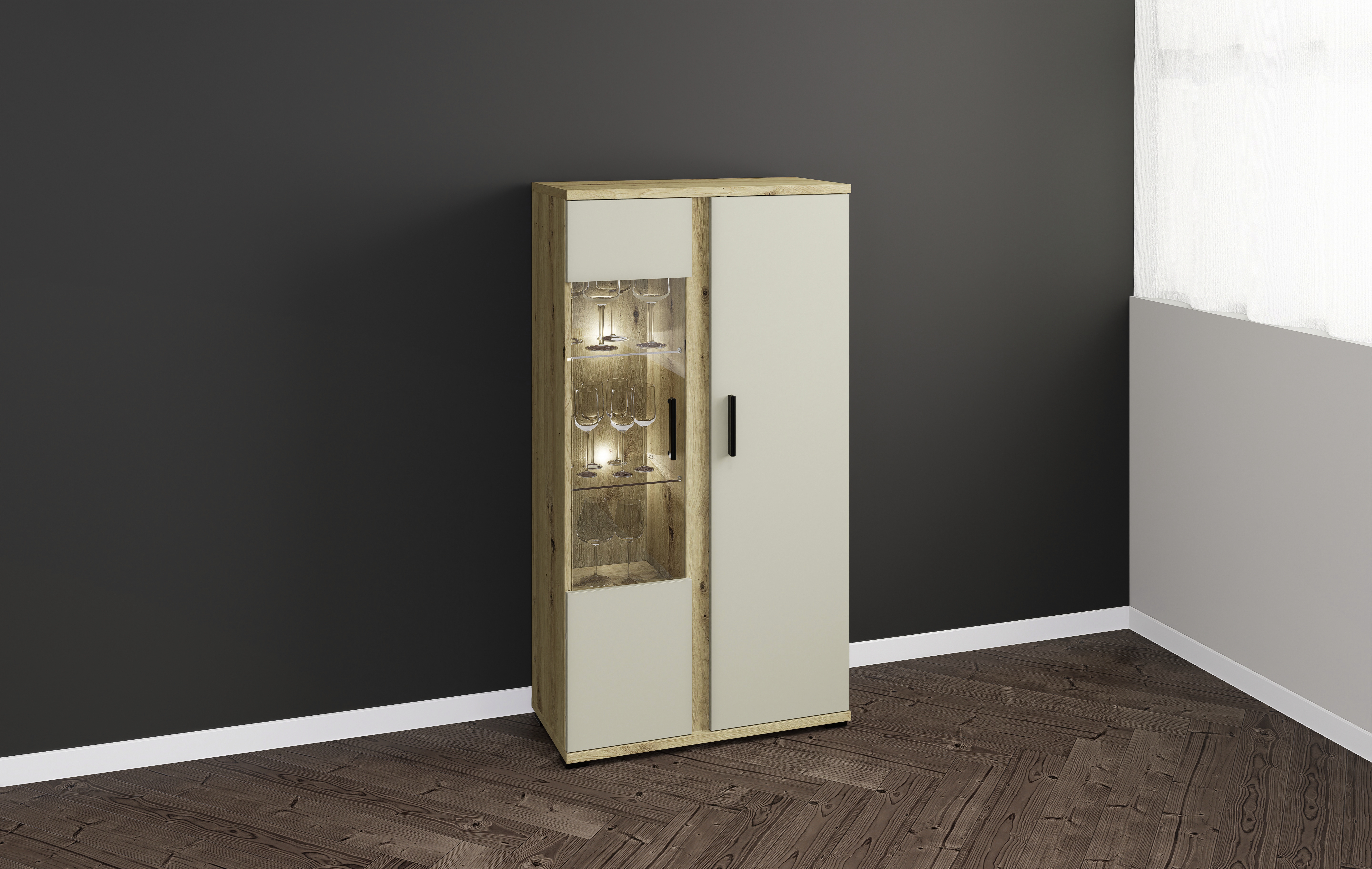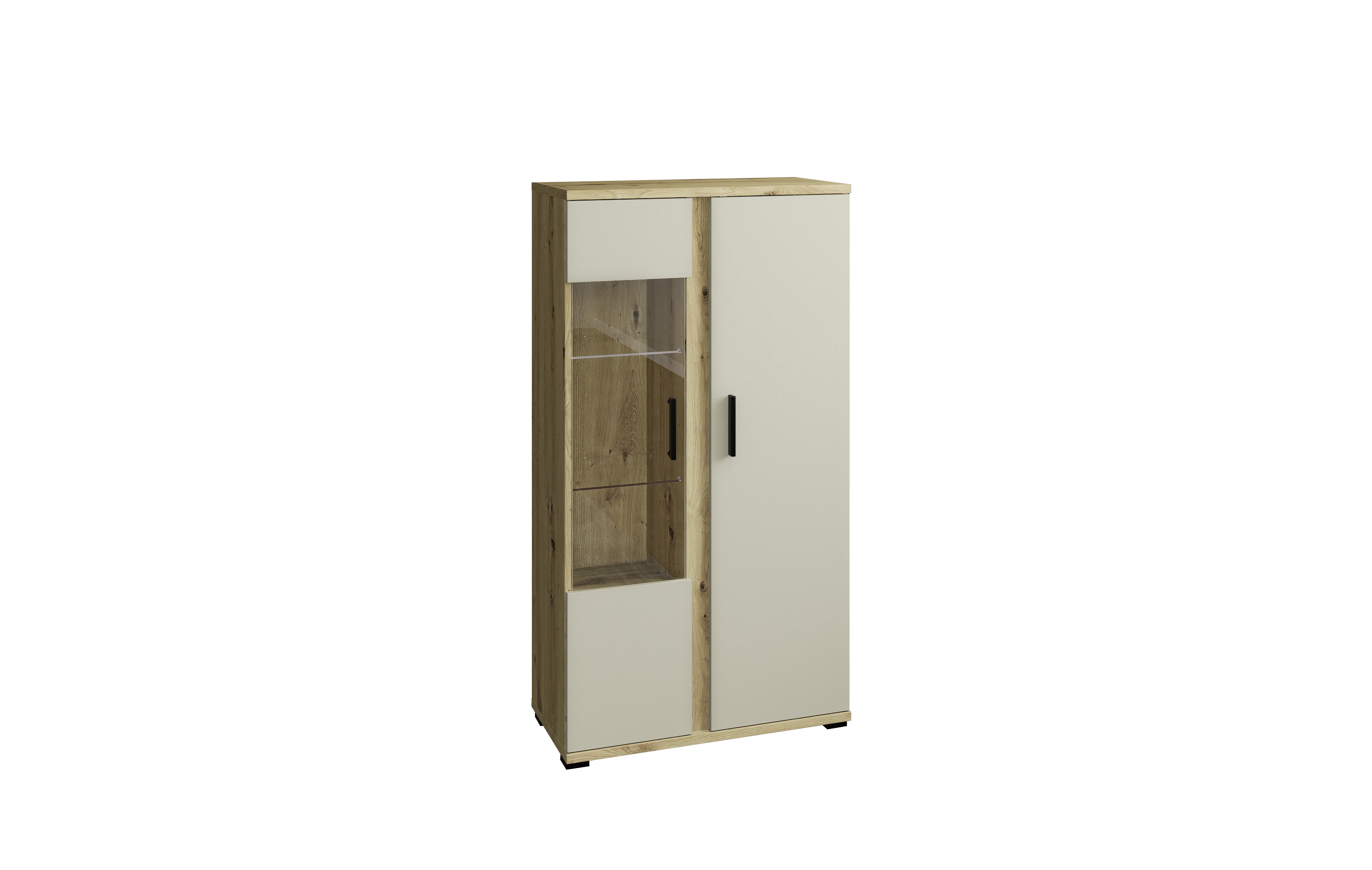 Front: Kaschmir mit Absetzungen in Artisan Eiche Holznachbildung, Spanplatte Melaminbeschichtung / Glas