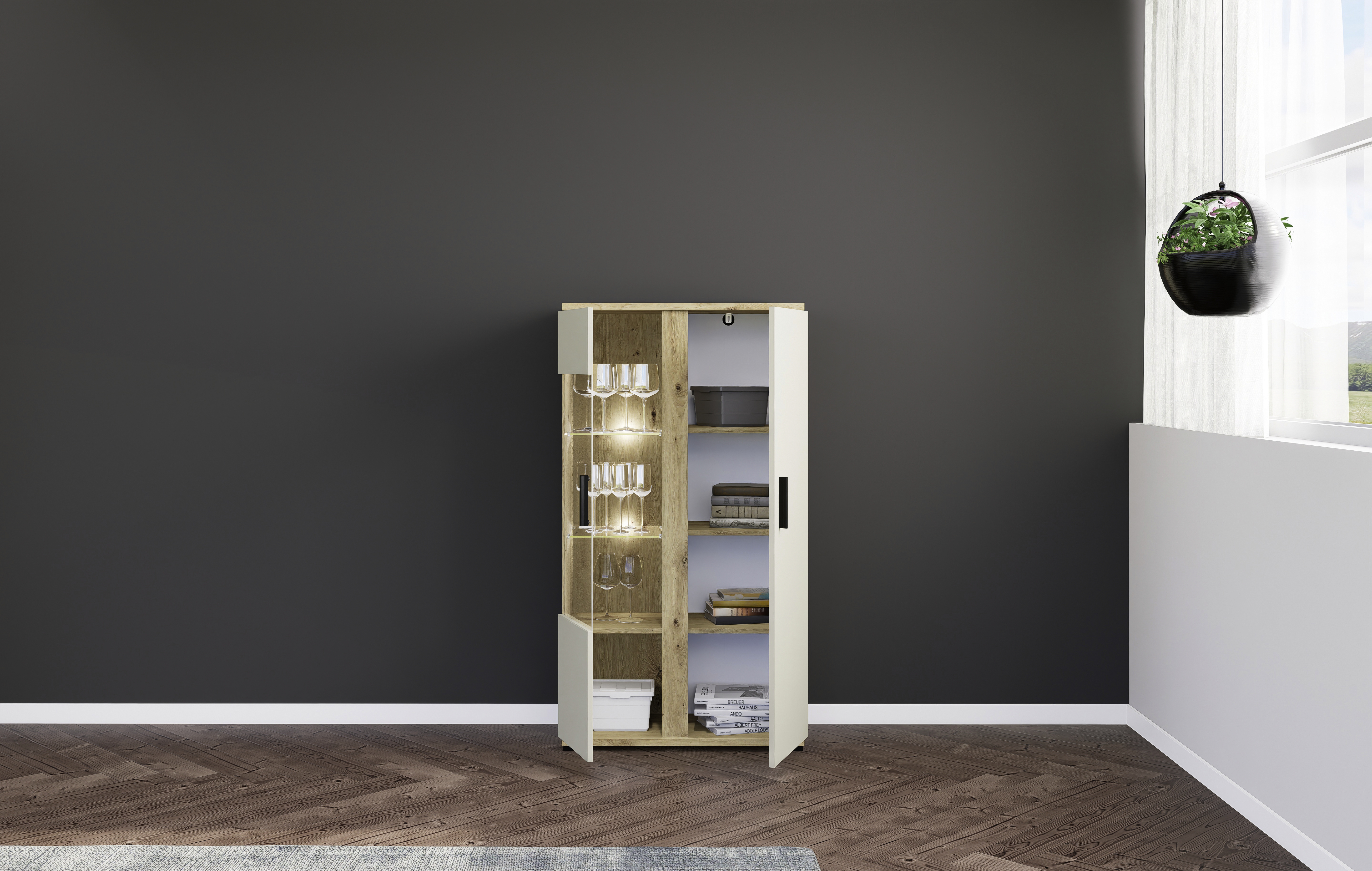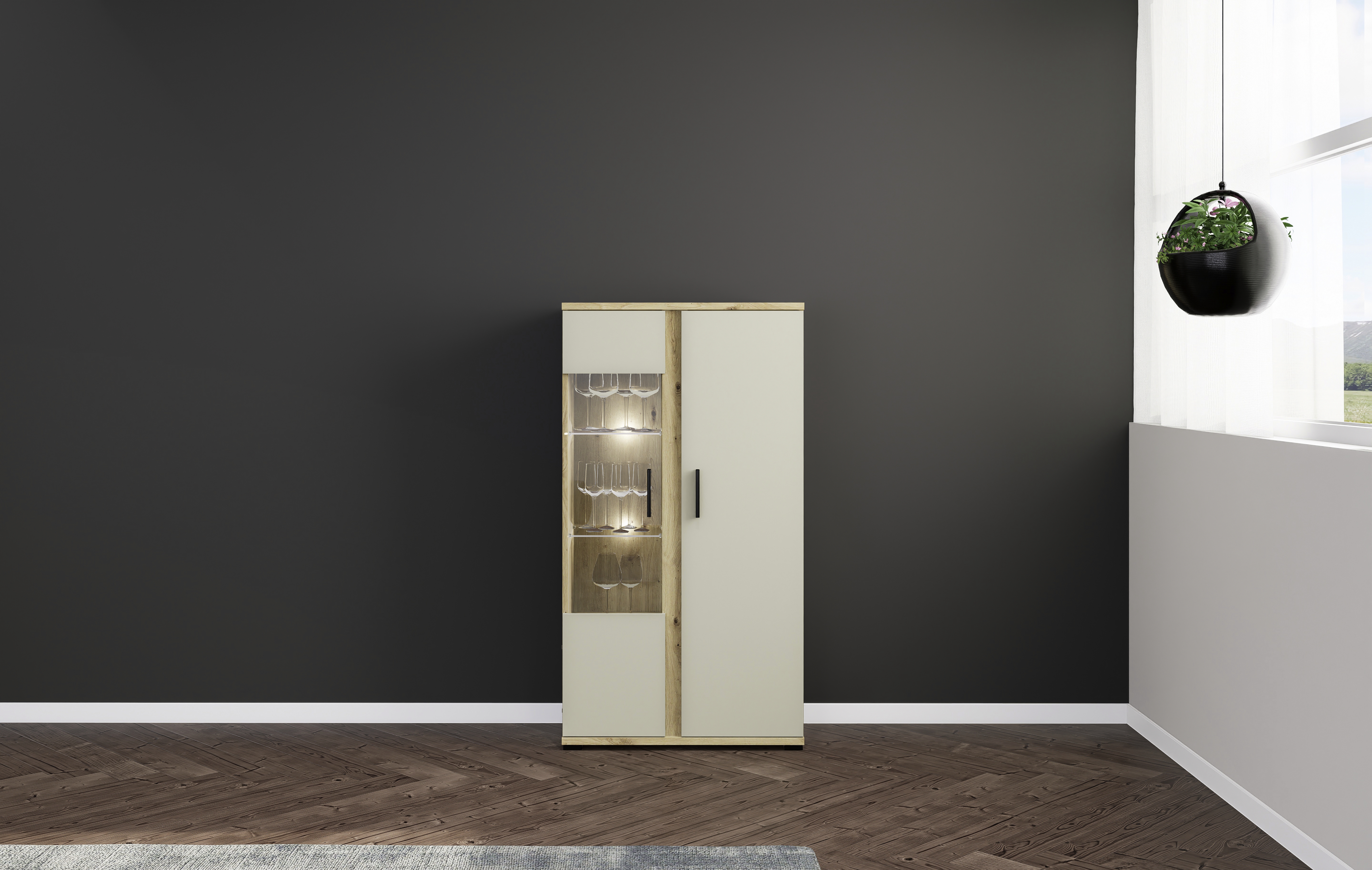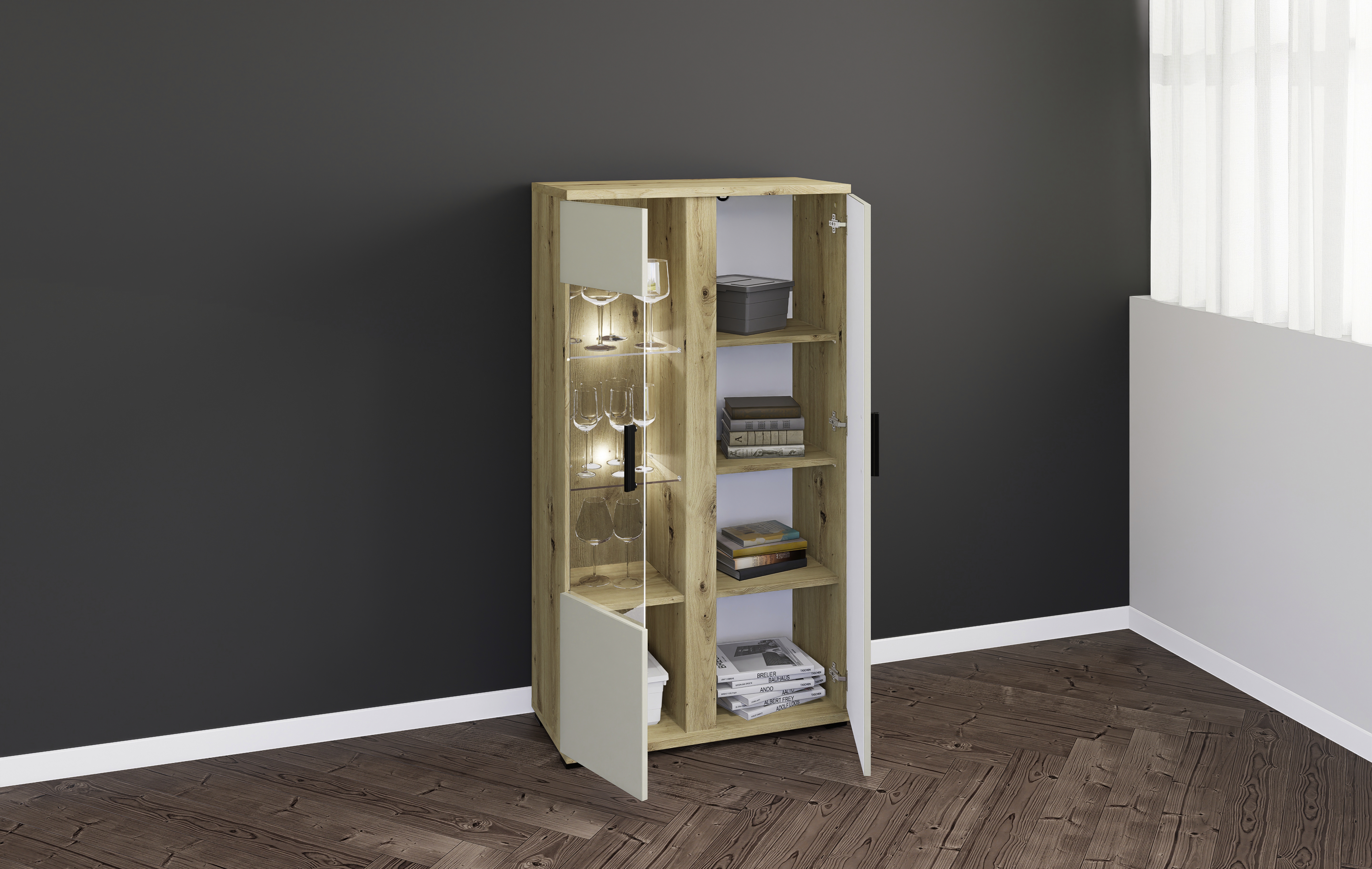 Front: Kaschmir mit Absetzungen in Artisan Eiche Holznachbildung, Spanplatte Melaminbeschichtung / Glas