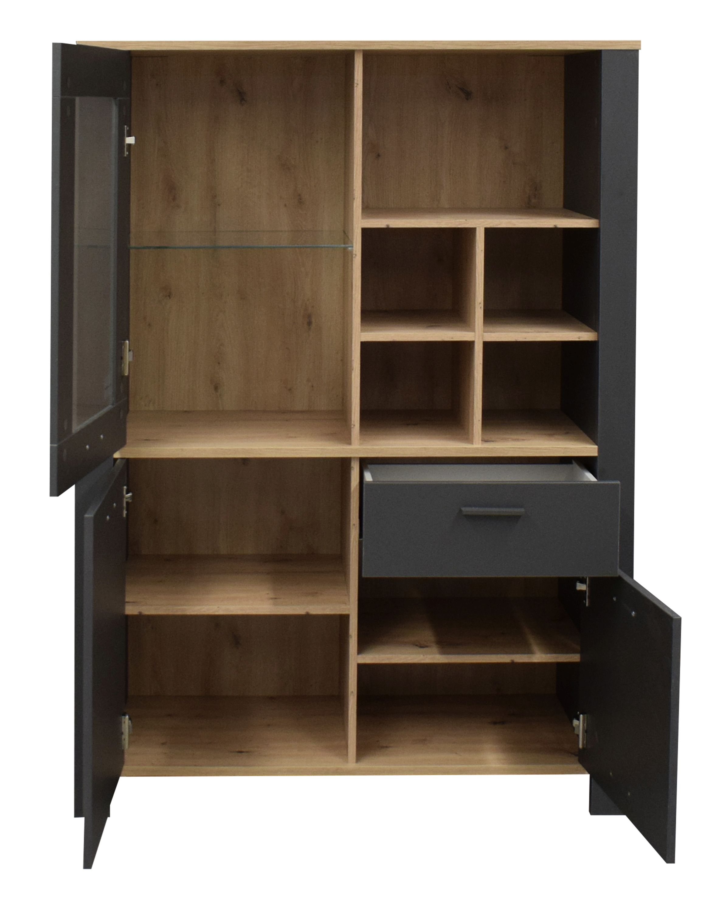 Anthrazit matt Lack kombiniert mit Asteiche Holznachbildung / Klarglas