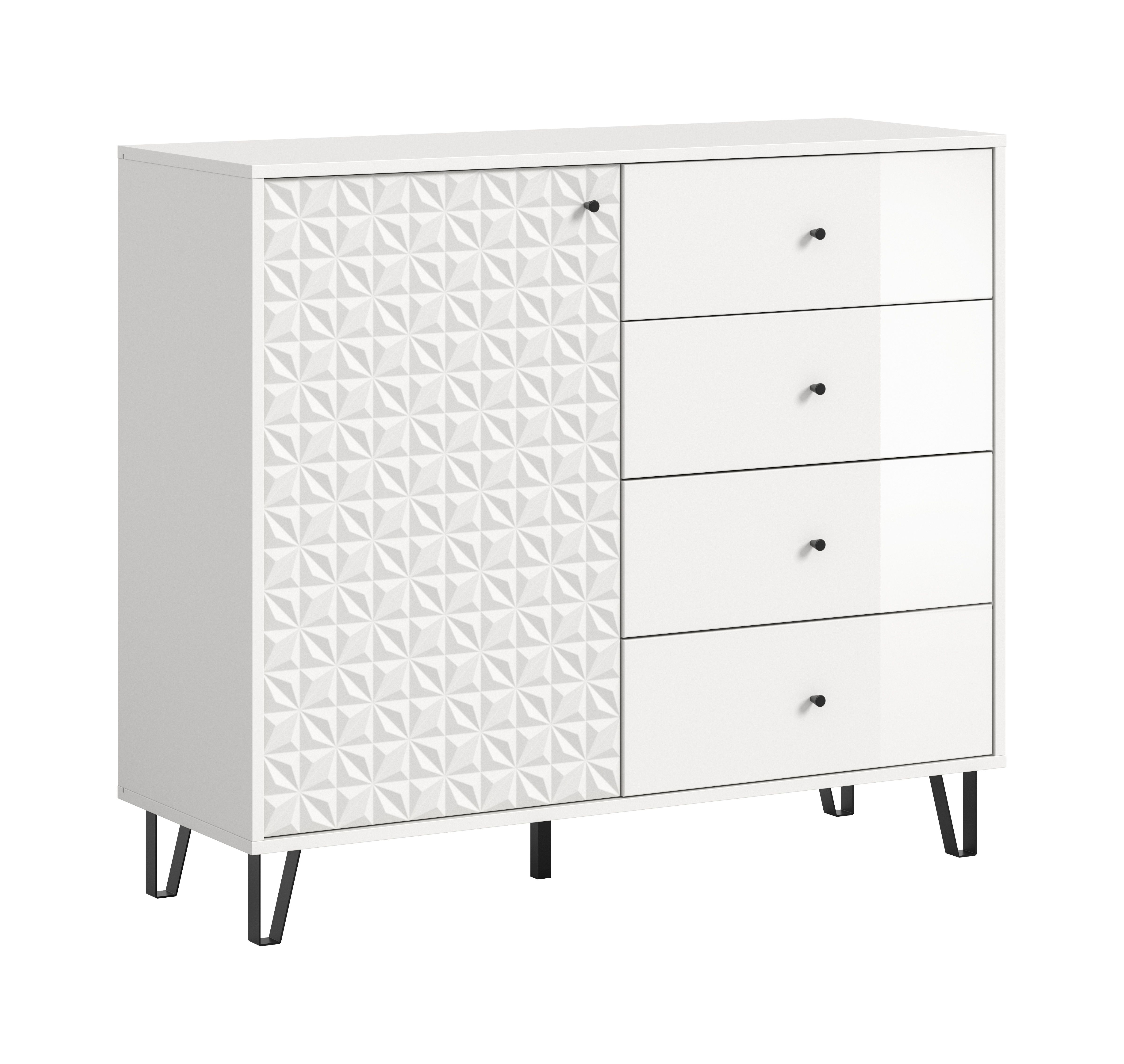 Entdecken Sie das elegante Highboard, das mit seinem modernen Design und durchdachter Funktionalität überzeugt! Die Kombination aus weißem Melamin und glänzendem Weiß Hochglanz macht es zu einem stilvollen Highlight in Ihrem Zuhause. Mit seinen Maßen von ca. 110 x 96 x 40 cm bietet es kompakte Größe bei gleichzeitig viel Stauraum. Hinter einer Tür verbergen sich zwei höhenverstellbare Einlegeböden, die Ihnen flexible Aufbewahrungsmöglichkeiten eröffnen. Drei offene Fächer sowie vier praktische Schubkästen sorgen zusätzlich für Ordnung und Übersicht.