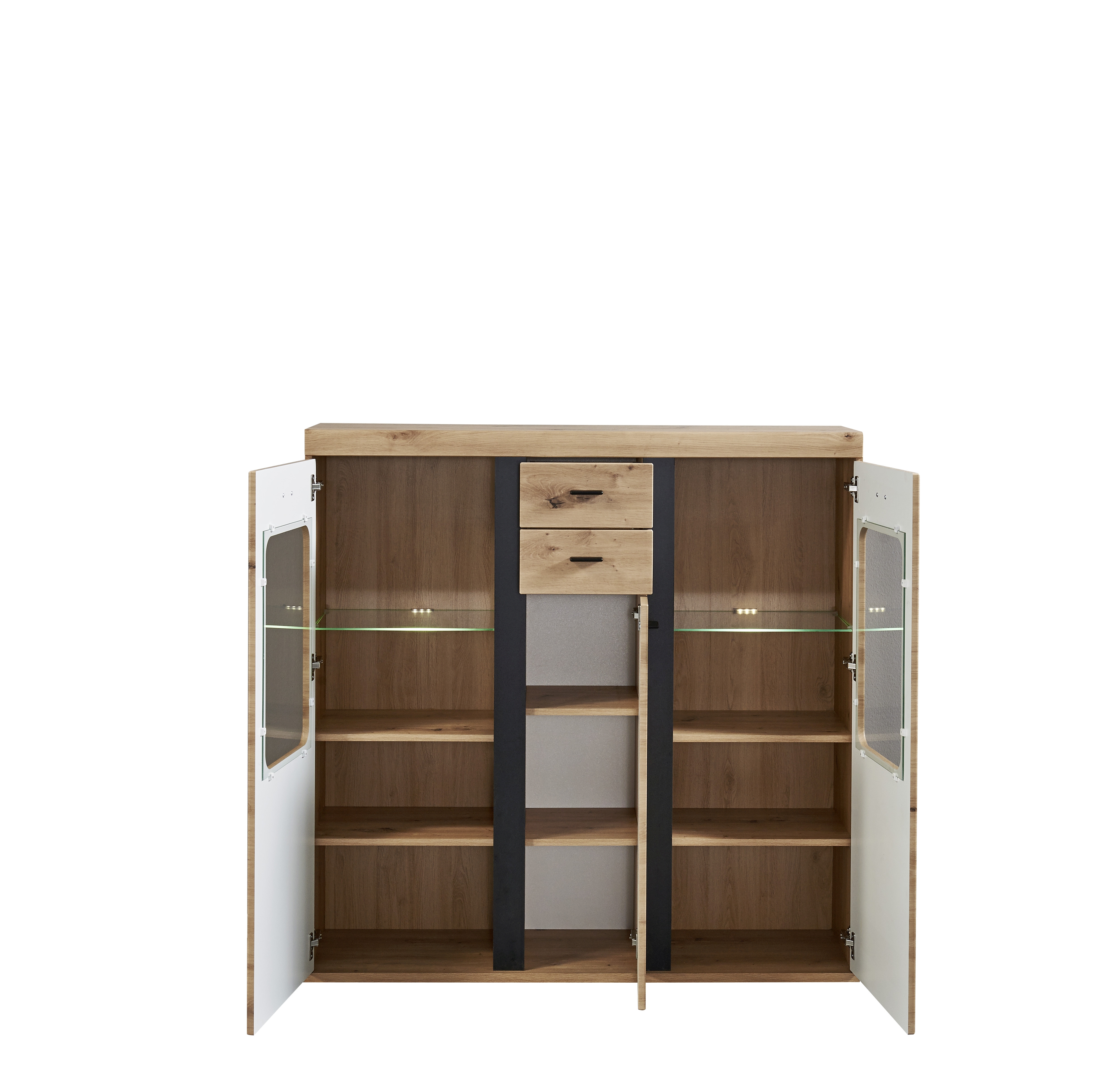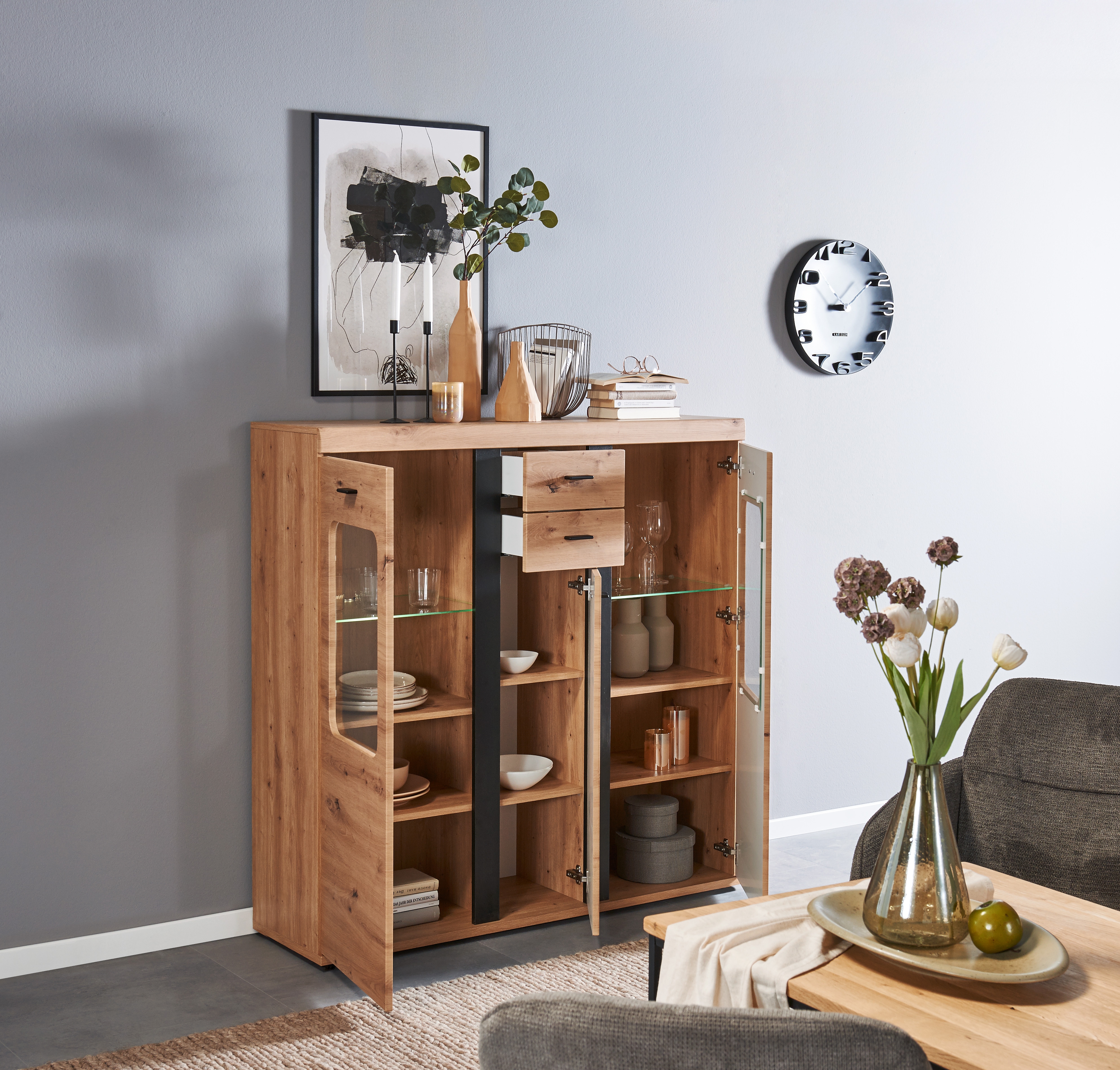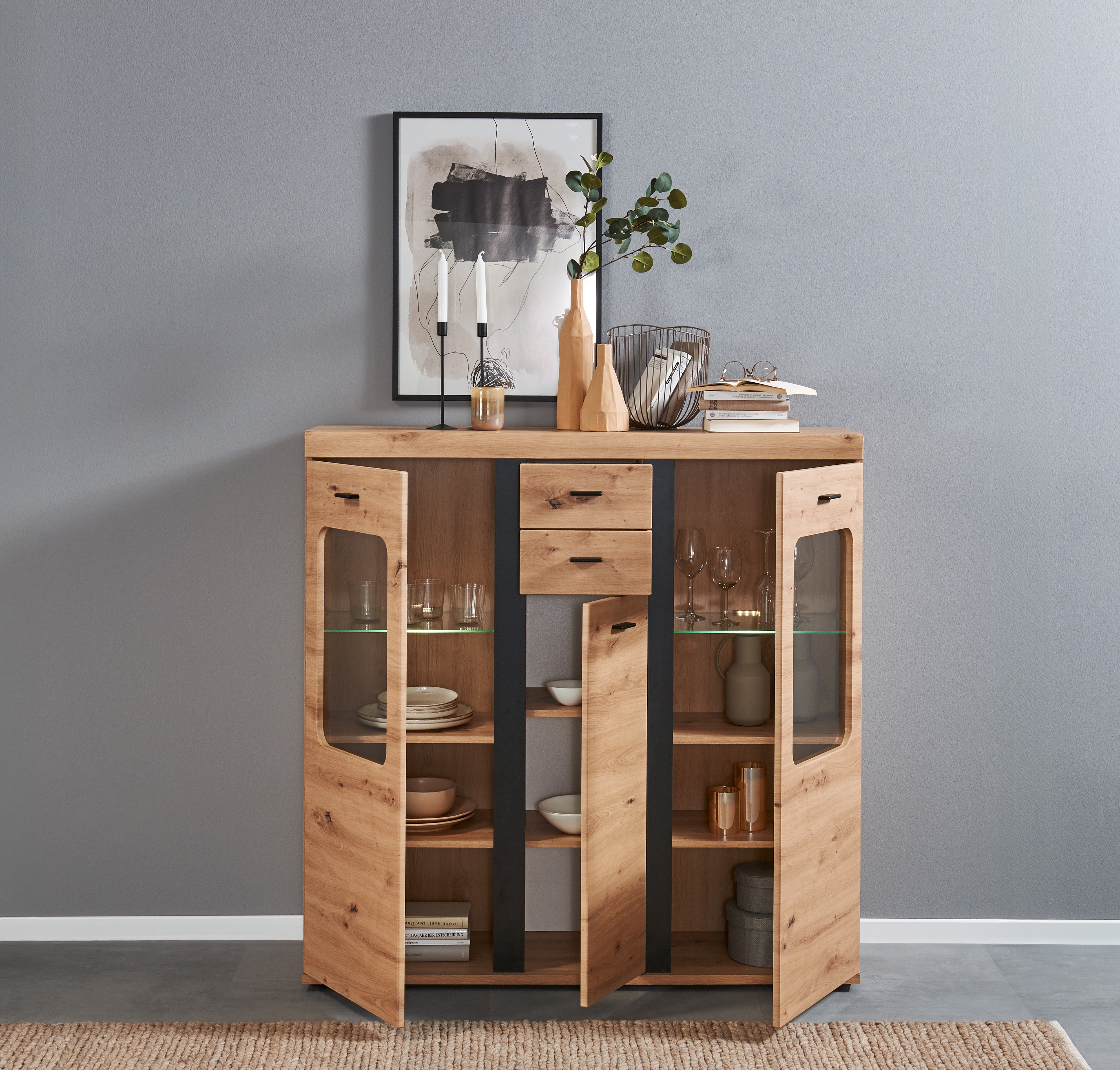 Front: Artisan Eiche Holznachbildung, MDF (Mitteldichte Holzfaserplatte) foliert mit Absetzungen in Schwarz (Spanplatte Melaminbeschichtung) / Glas