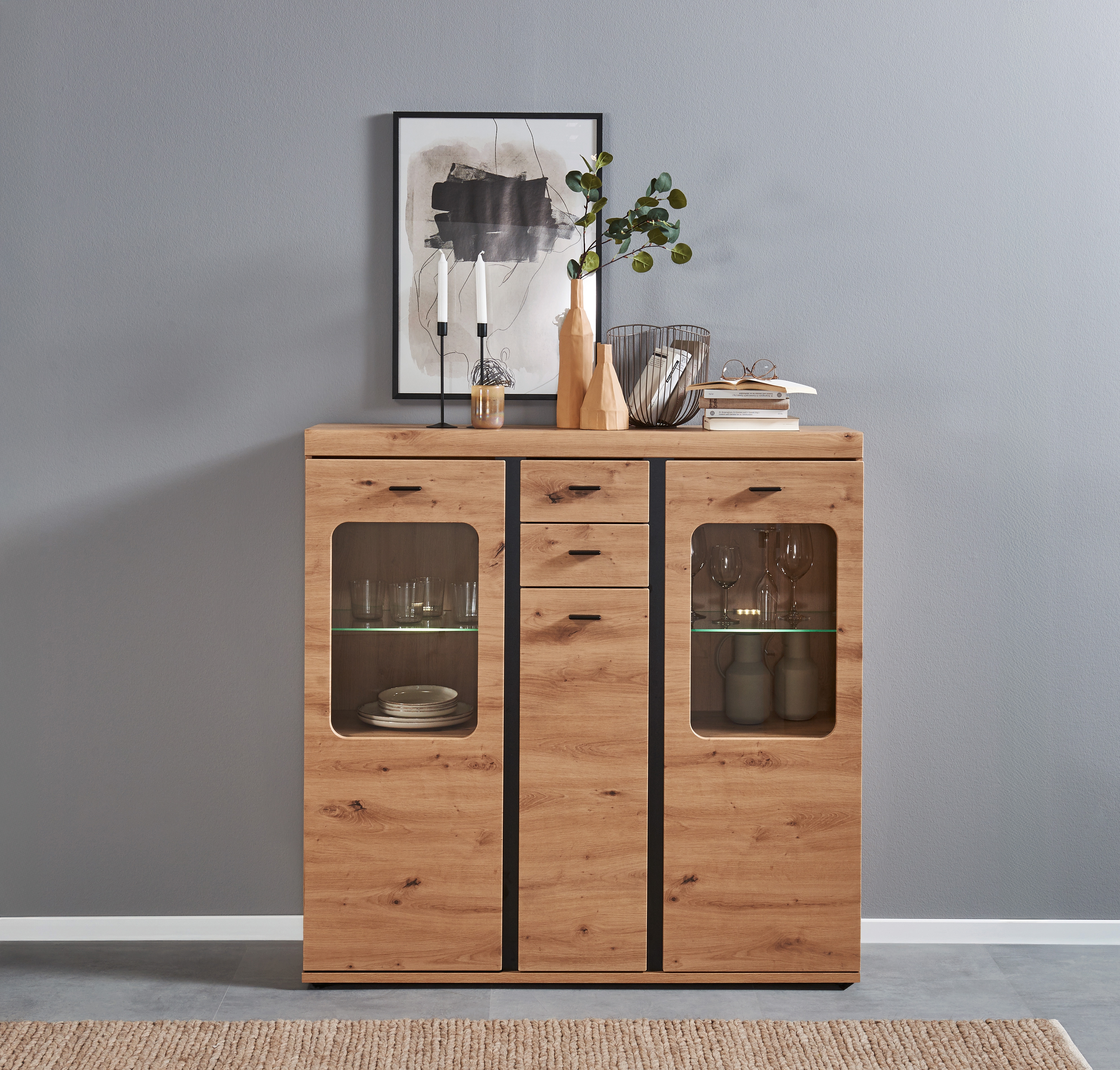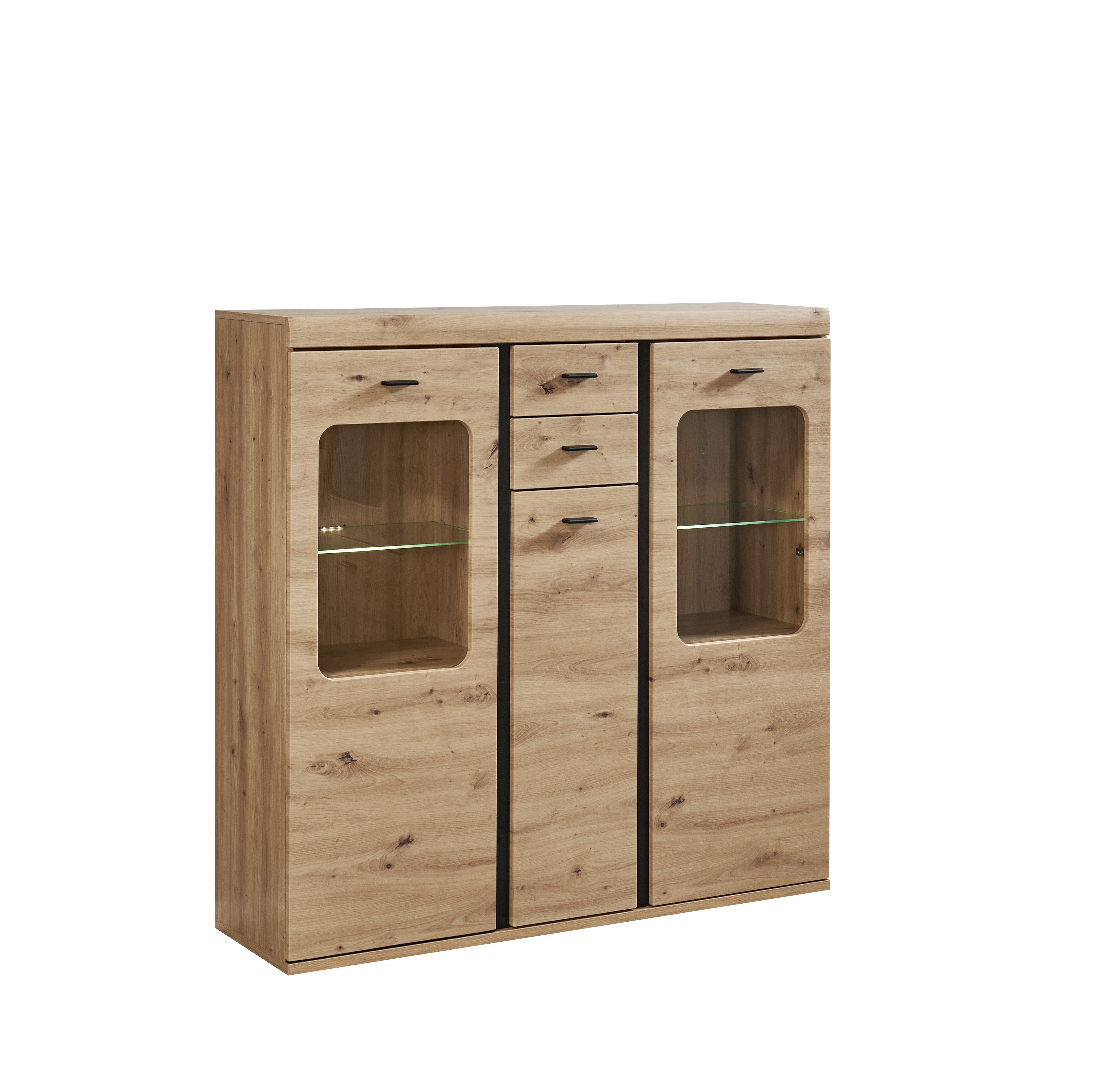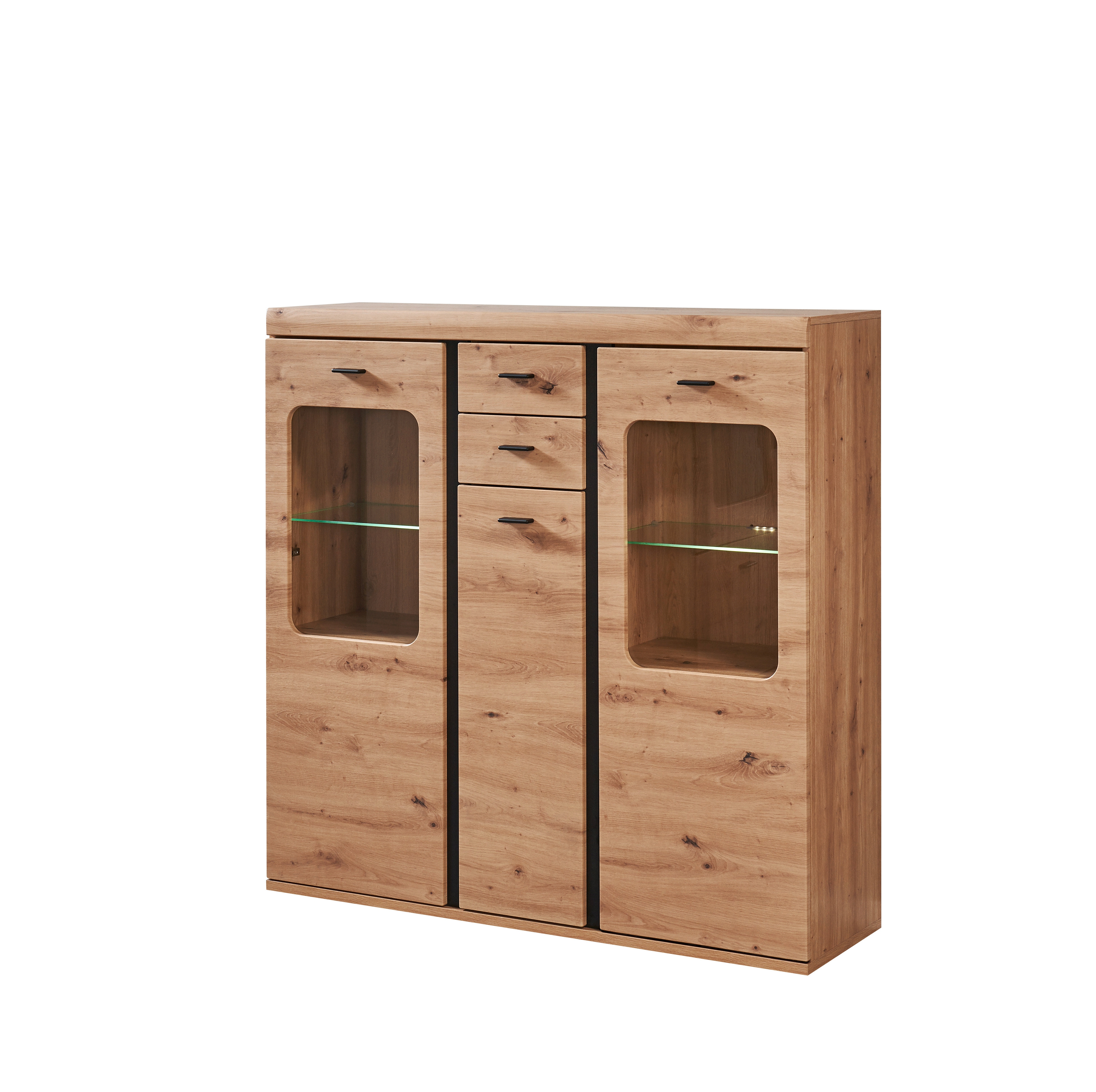 Front: Artisan Eiche Holznachbildung, MDF (Mitteldichte Holzfaserplatte) foliert mit Absetzungen in Schwarz (Spanplatte Melaminbeschichtung) / Glas