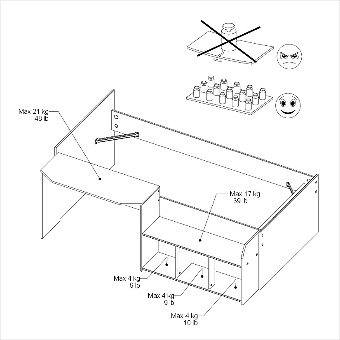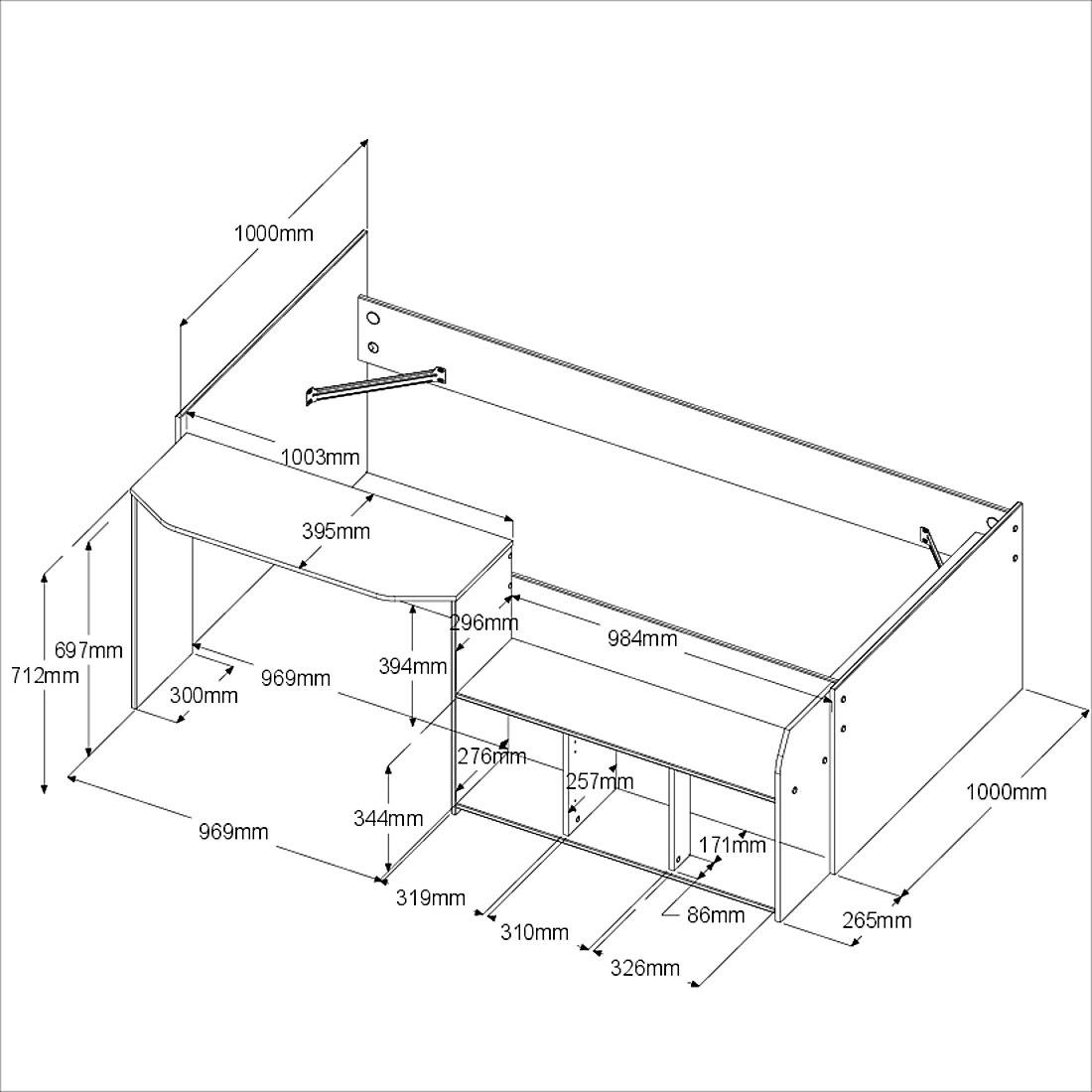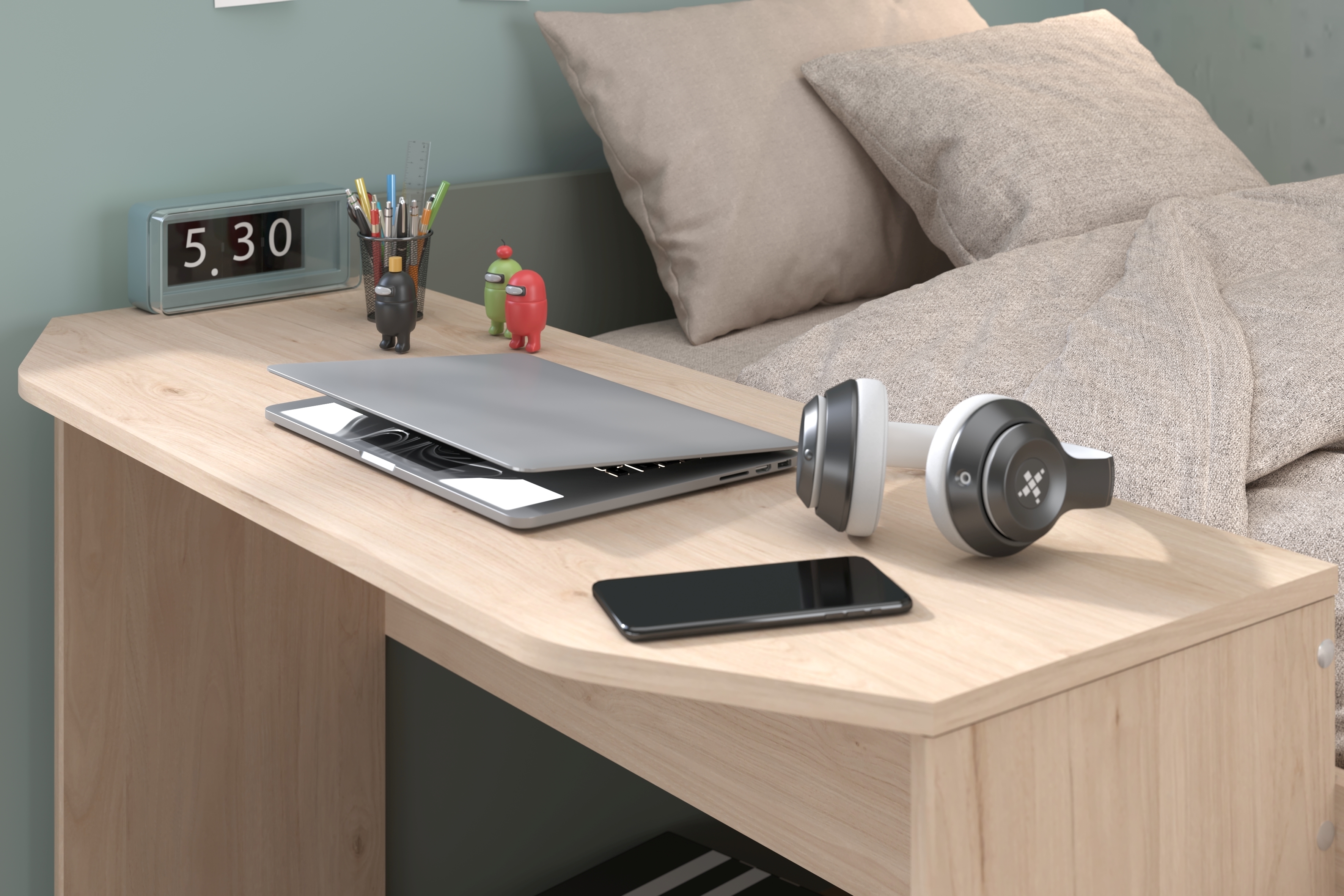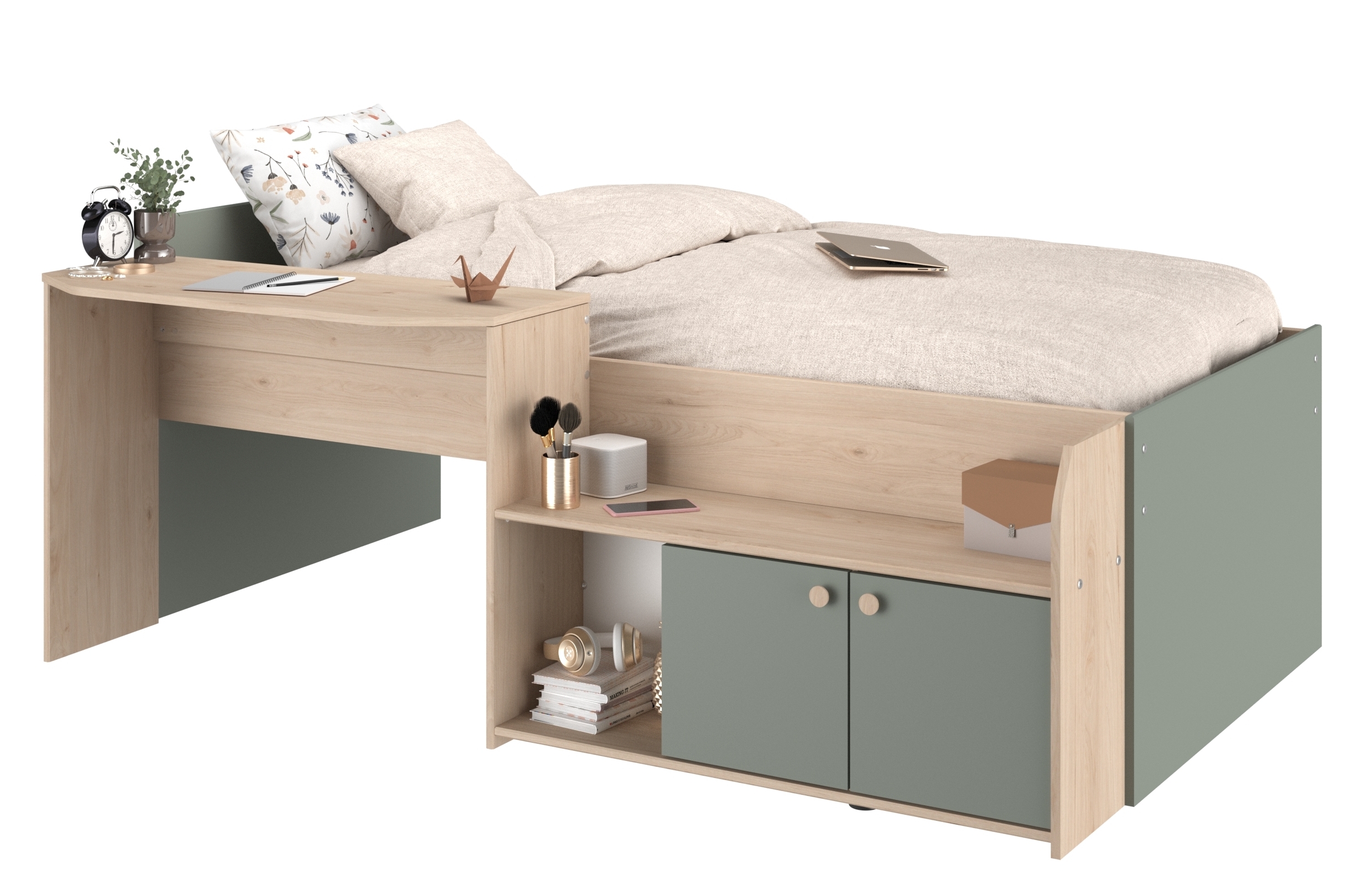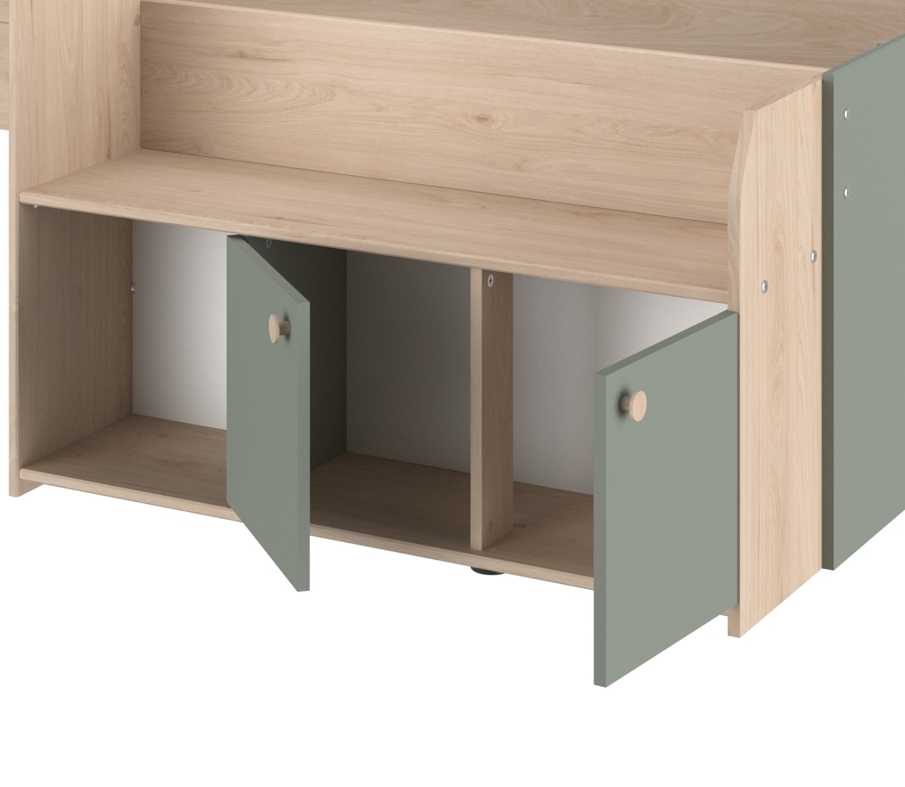 längsseitig an der Liegefläche: integrierter Schreibtisch auf Höhe des Kopfteils, integrierte Kommode mit 2 Türen, 1 offenes Fach und 1 Trittstufe