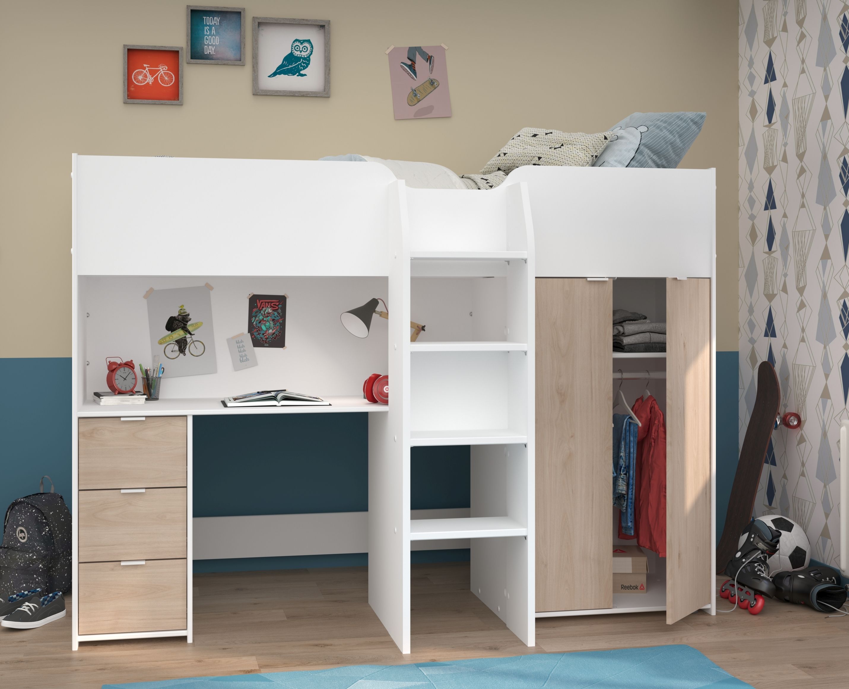 1 integrierter Schreibtisch (links unterhalb der Liegefläche) mit 1 großen Arbeitsfläche, Kabeldurchlass und 3 Schubkästen