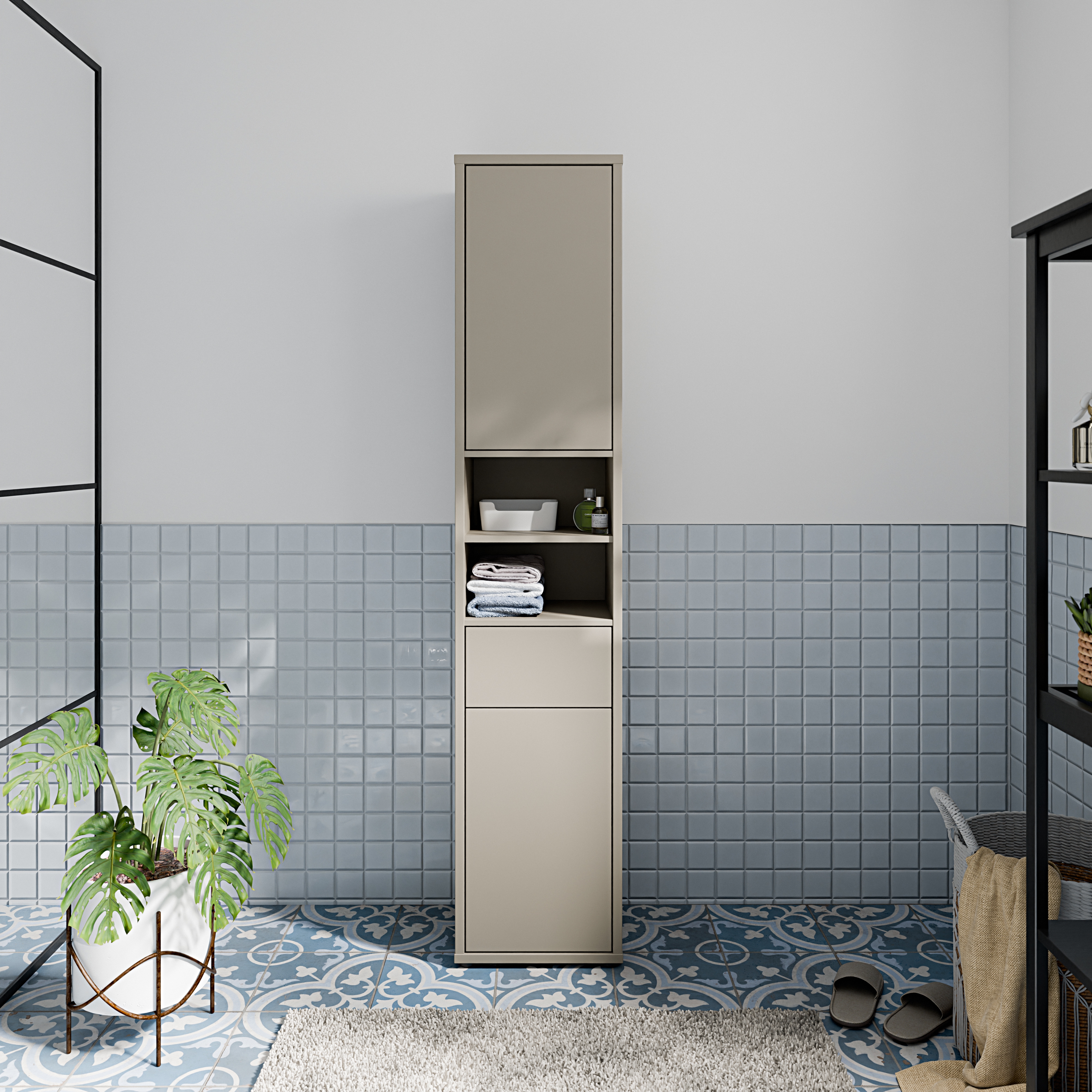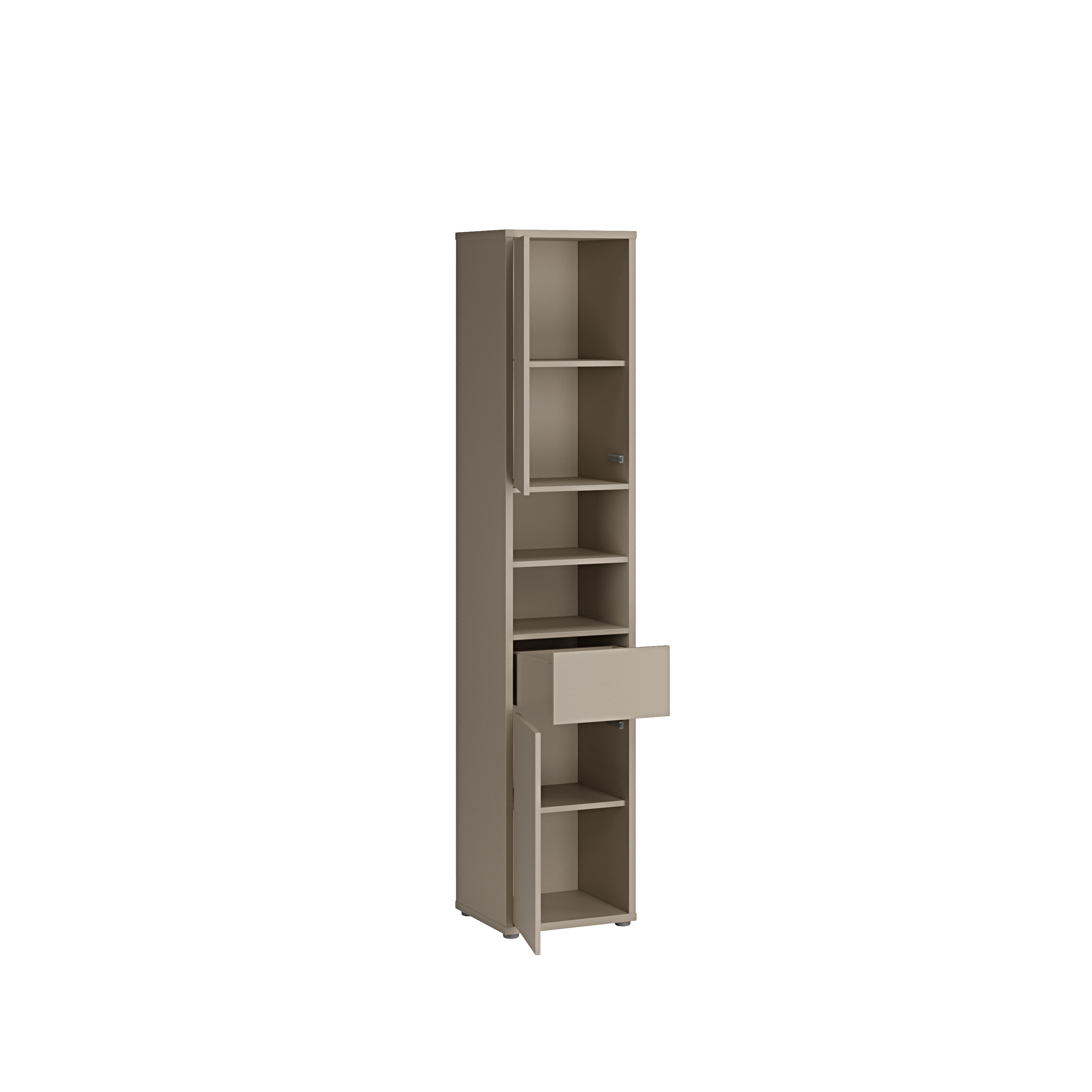 Dieser Hochschrank in Taupe (U88) bietet funktionalen Stauraum für Ihr Badezimmer. Ausgestattet mit zwei Türen, zwei Einlegeböden, einem Schubkasten und zwei offenen Fächern, lassen sich Handtücher, Pflegeprodukte und Badutensilien ordentlich und griffbereit verstauen. Die einheitliche Farbgebung sorgt für ein ruhiges Gesamtbild und lässt sich gut mit bestehenden Badmöbeln kombinieren. Der kompakte Schrank eignet sich ideal für kleinere Räume und nutzt den vorhandenen Platz optimal aus. Eine praktische Lösung für den Alltag - stabil, pflegeleicht und preiswert. Erhältlich bei MEGA Möbel, online oder in Ihrer Filiale vor Ort.