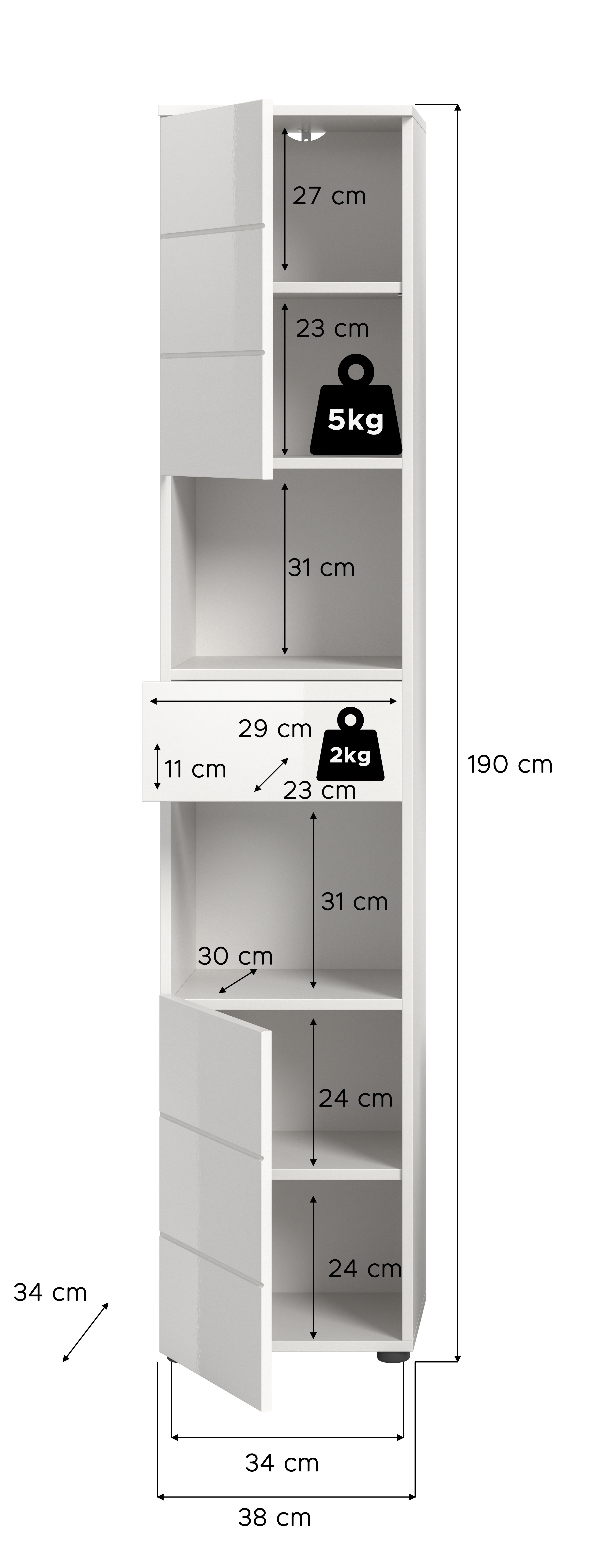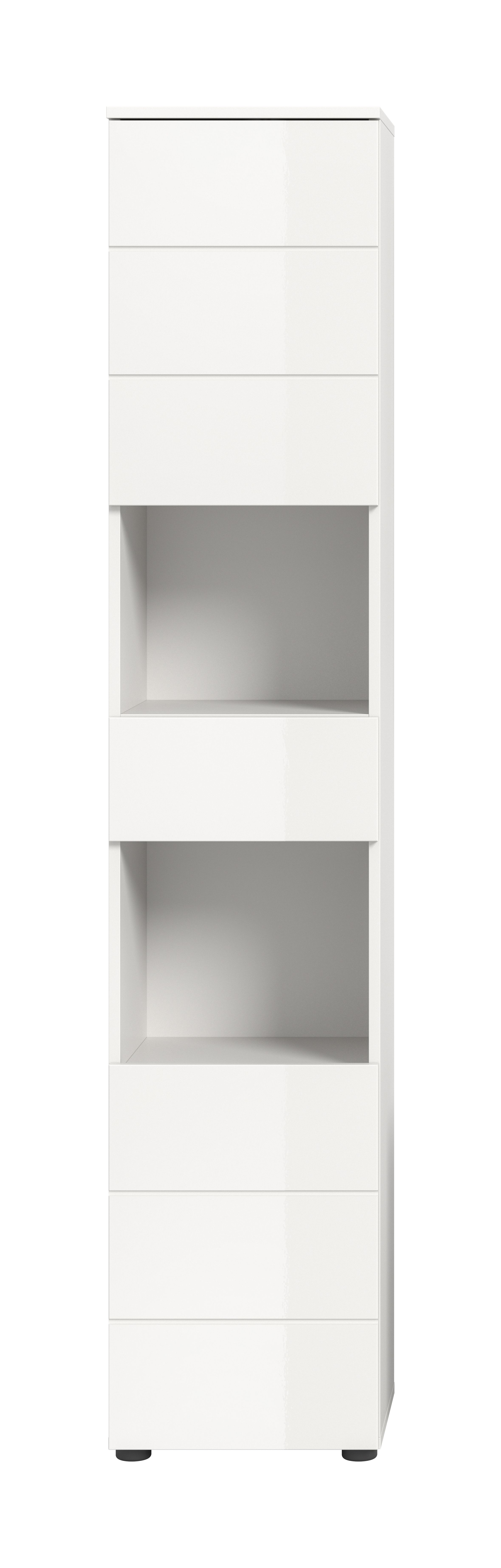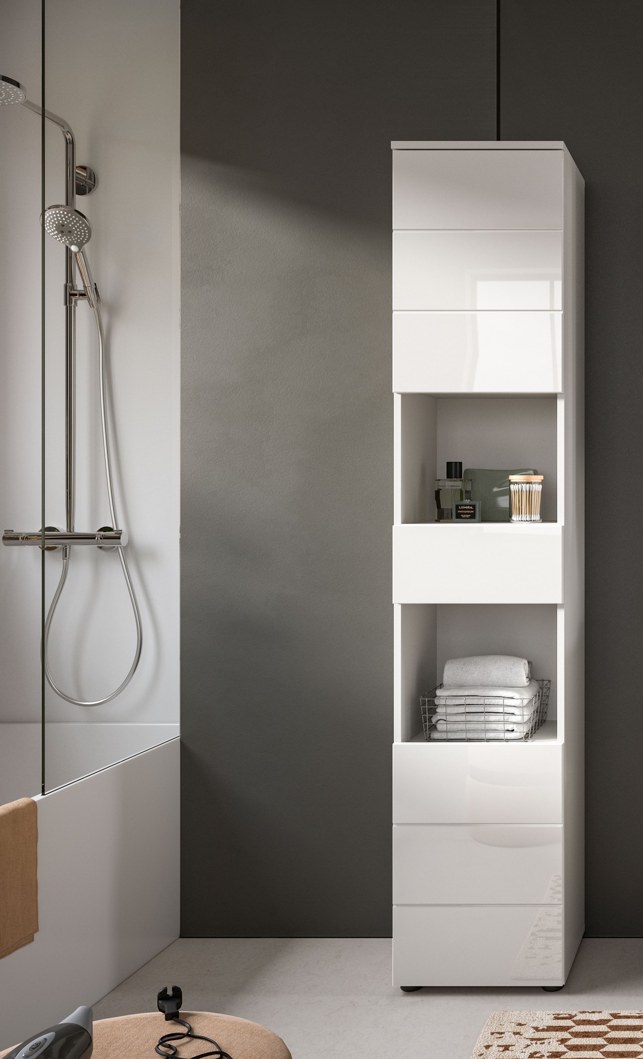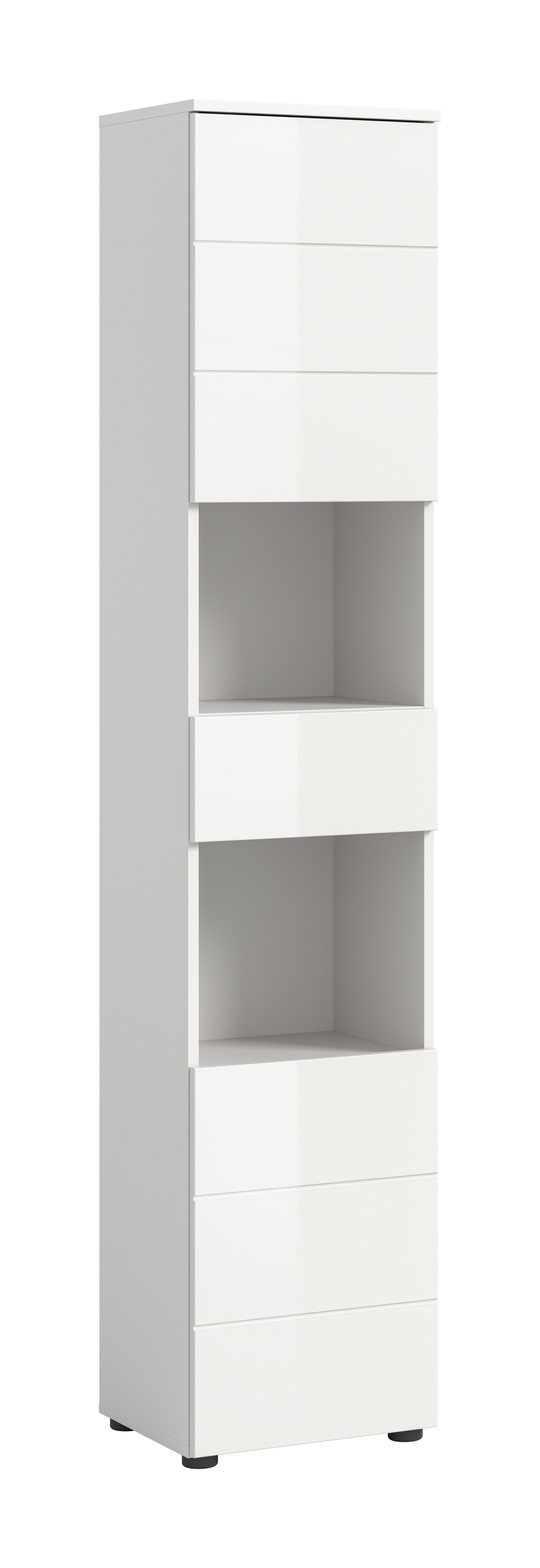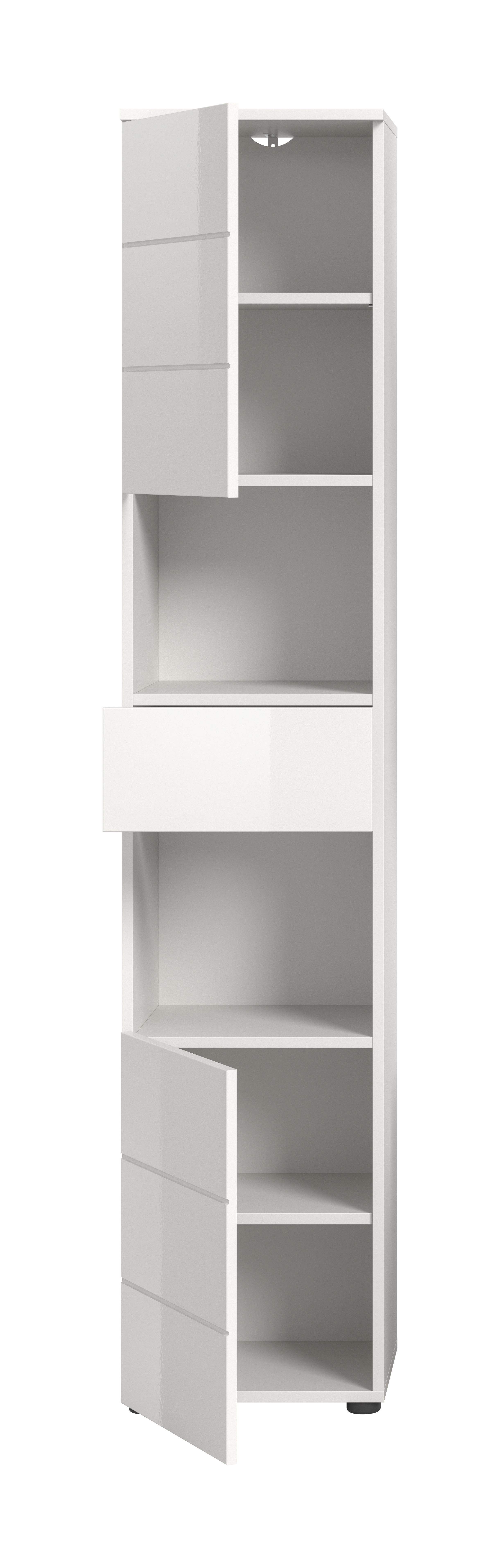 Unser Hochschrank (B/H/T: 38x190x34 cm) in weißer hochglänzender Tiefzieh-Optik bietet maximalen Stauraum für alle Ihre Badutensilien. Mit seiner hohen, schmalen Bauweise ist er ideal für kleinere Badezimmer, während die elegante Hochglanz-Oberfläche für einen modernen Look sorgt. Nutzen Sie jeden Zentimeter Platz und kombinieren Sie Funktionalität mit stilvollem Design in Ihrem Badezimmer!