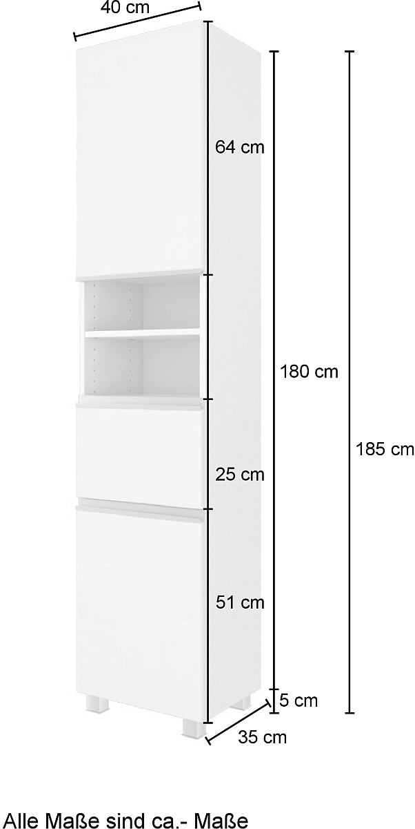 | Hochschrank | 40 | 180 (ohne Möbelfüße) | 35 |