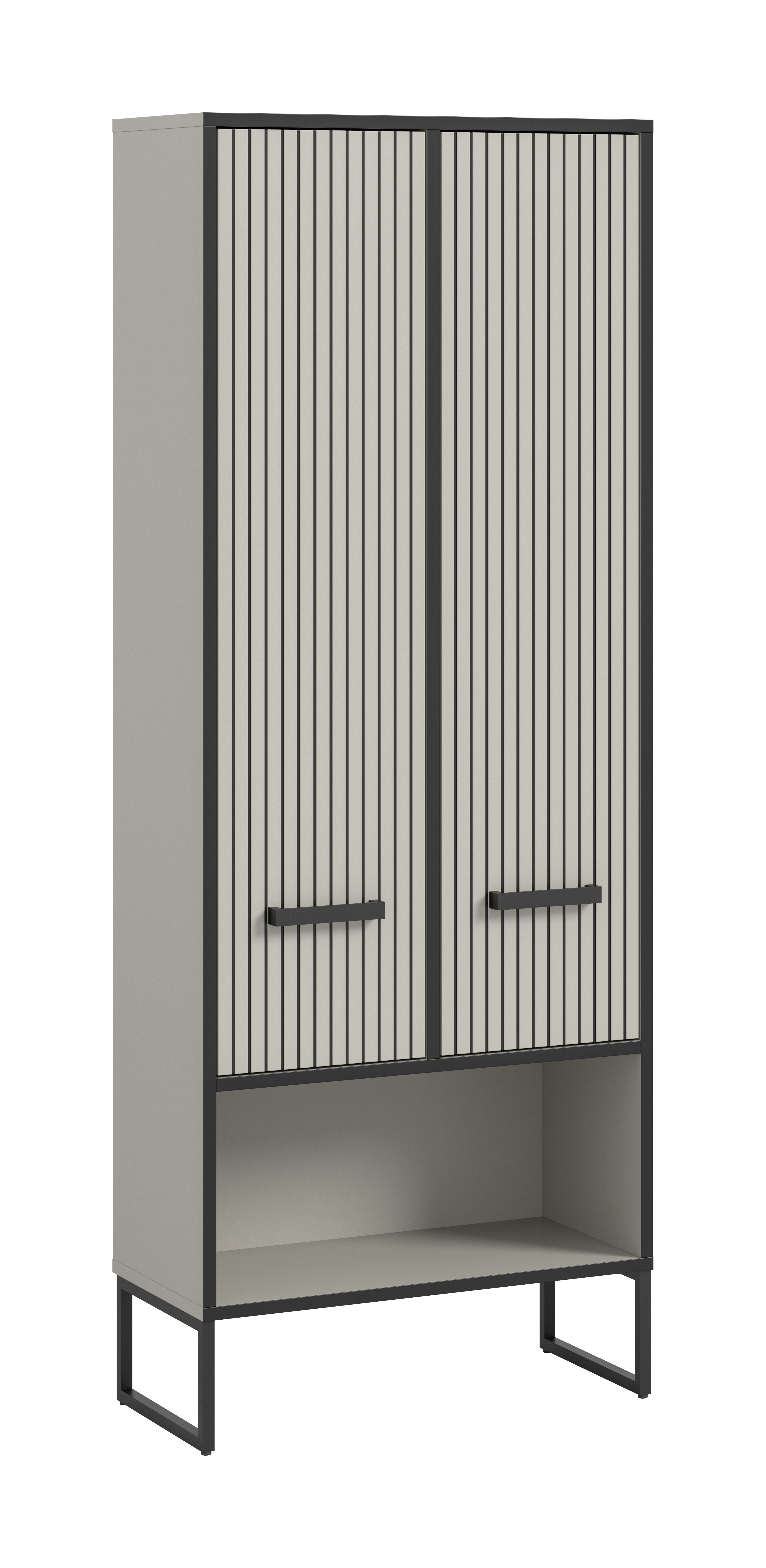Ein weiteres Highlight ist unser großzügiger Hochschrank mit zwei Türen, der insgesamt sechs höhenverstellbare Einlegeböden und acht geschlossene Fächer hat. So findet alles, von Badutensilien bis zu Reinigungsgeräten, seinen Platz – und das ganz stilvoll in trendiger Rillenoptik.