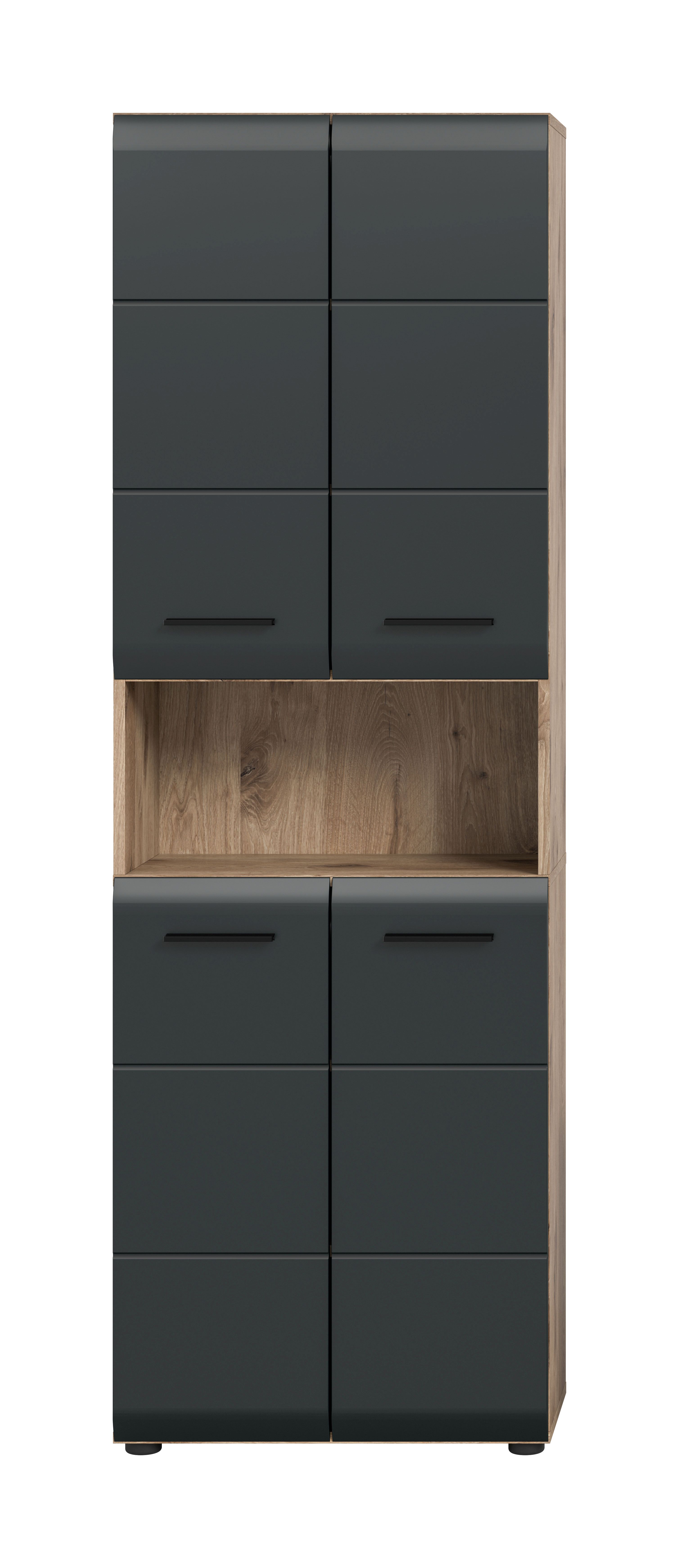 Entdecken Sie unseren geräumigen Badezimmer Hochschrank in Schwarz matt und Nox Eiche Holznachbildung. Mit den großzügigen Maßen von 60x185x30 cm bietet er nicht nur viel Stauraum für Ihre Badutensilien, sondern setzt auch einen modernen Akzent in Ihrem Badezimmer.