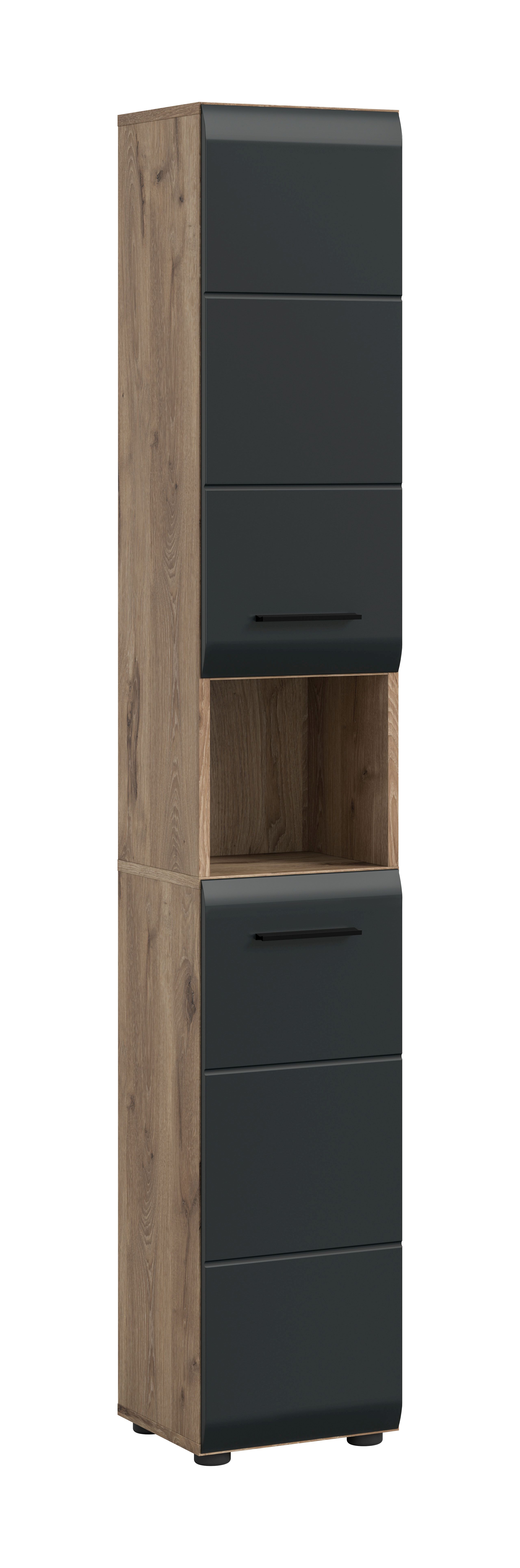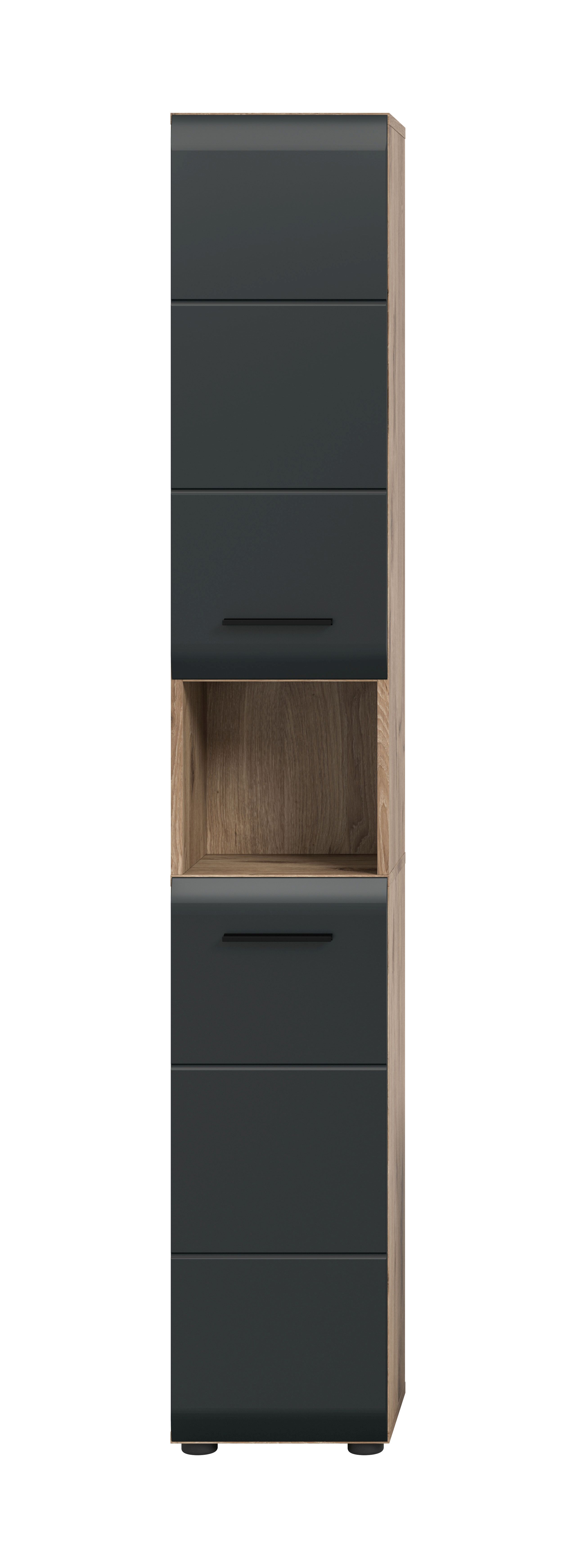Entdecken Sie den vielseitigen Hochschrank, der idealen Stauraum bietet! Dieser Hochschrank misst 30 x 185 x 30 cm und verfügt über zwei Türen, deren Türanschlag ebenfalls rechts oder links wechselbar ist. Mit vier herausnehmbaren und höhenverstellbaren Einlegeböden sowie sechs geschlossenen Fächern und zwei festen Konstruktionsböden bietet er sowohl Flexibilität als auch Funktionalität. Ein zusätzliches offenes Fach macht den Hochschrank zur perfekten Lösung für Ihr Badezimmer oder die Diele. Die MDF-Front mit Rillenfräsung verleiht ihm eine moderne Ausstrahlung.