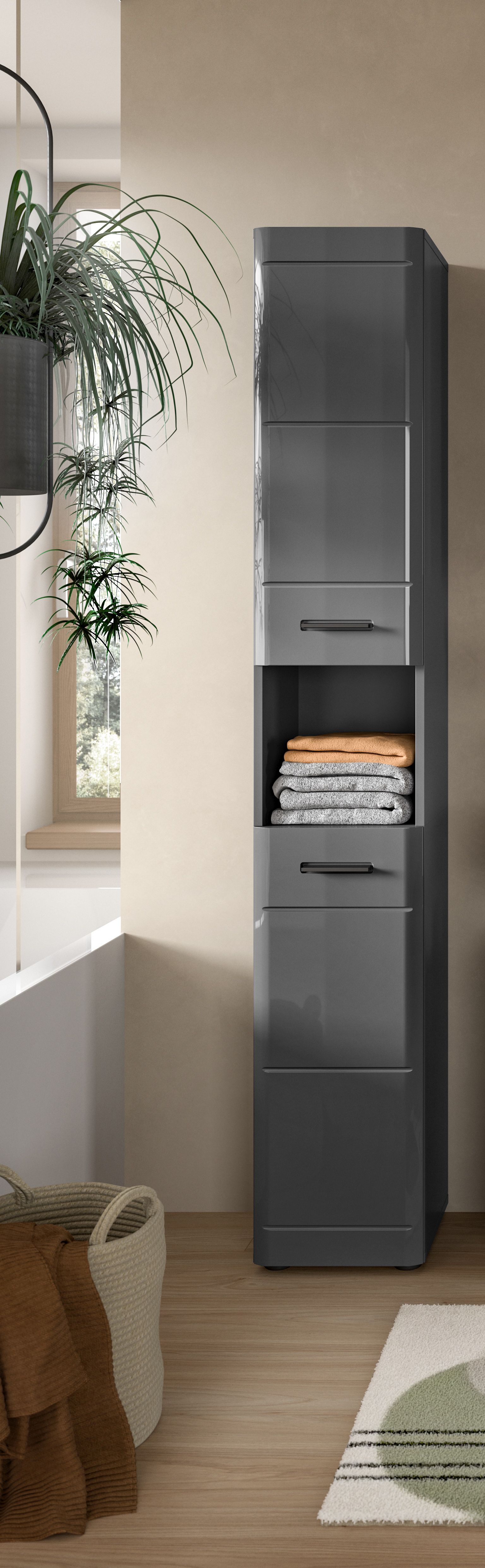 - Design/Stil: Der Hochschrank in grauer Nachbildung mit grauem Hochglanz tiefzieh präsentiert sich mit einem modernen und schlanken Design, das durch seine glänzende Oberfläche und klare Linien eine zeitgemäße Ästhetik im Badezimmer schafft, die gleichzeitig schlicht und elegant ist.