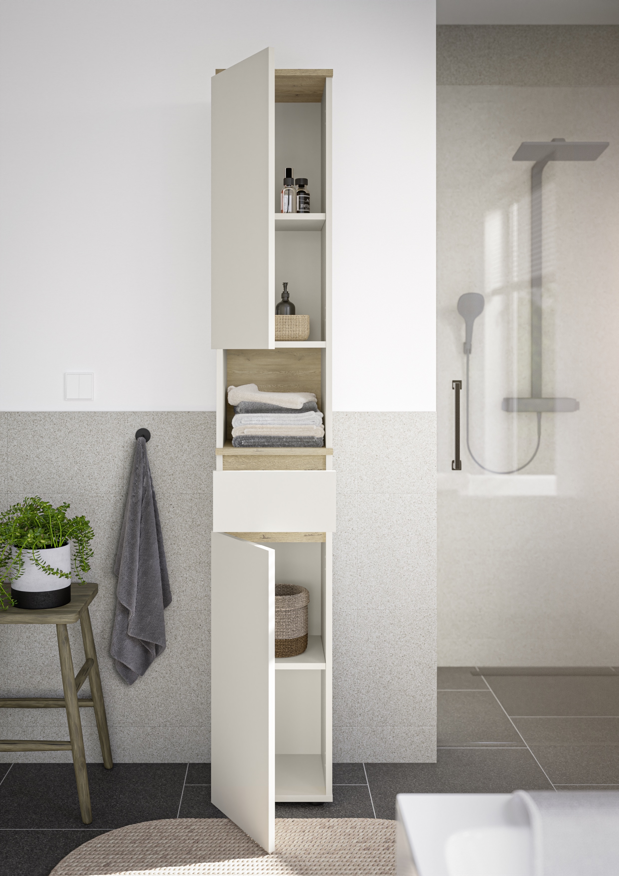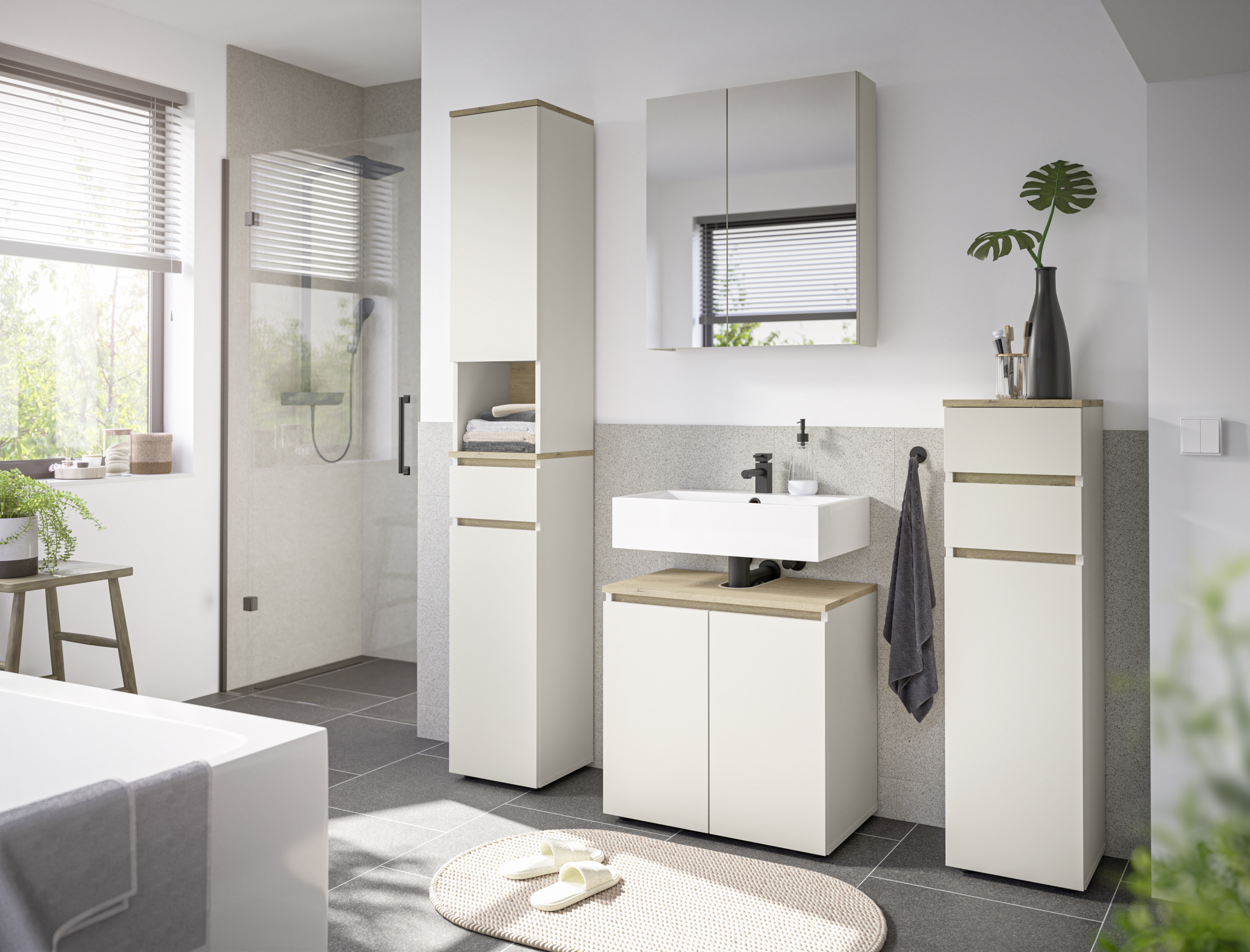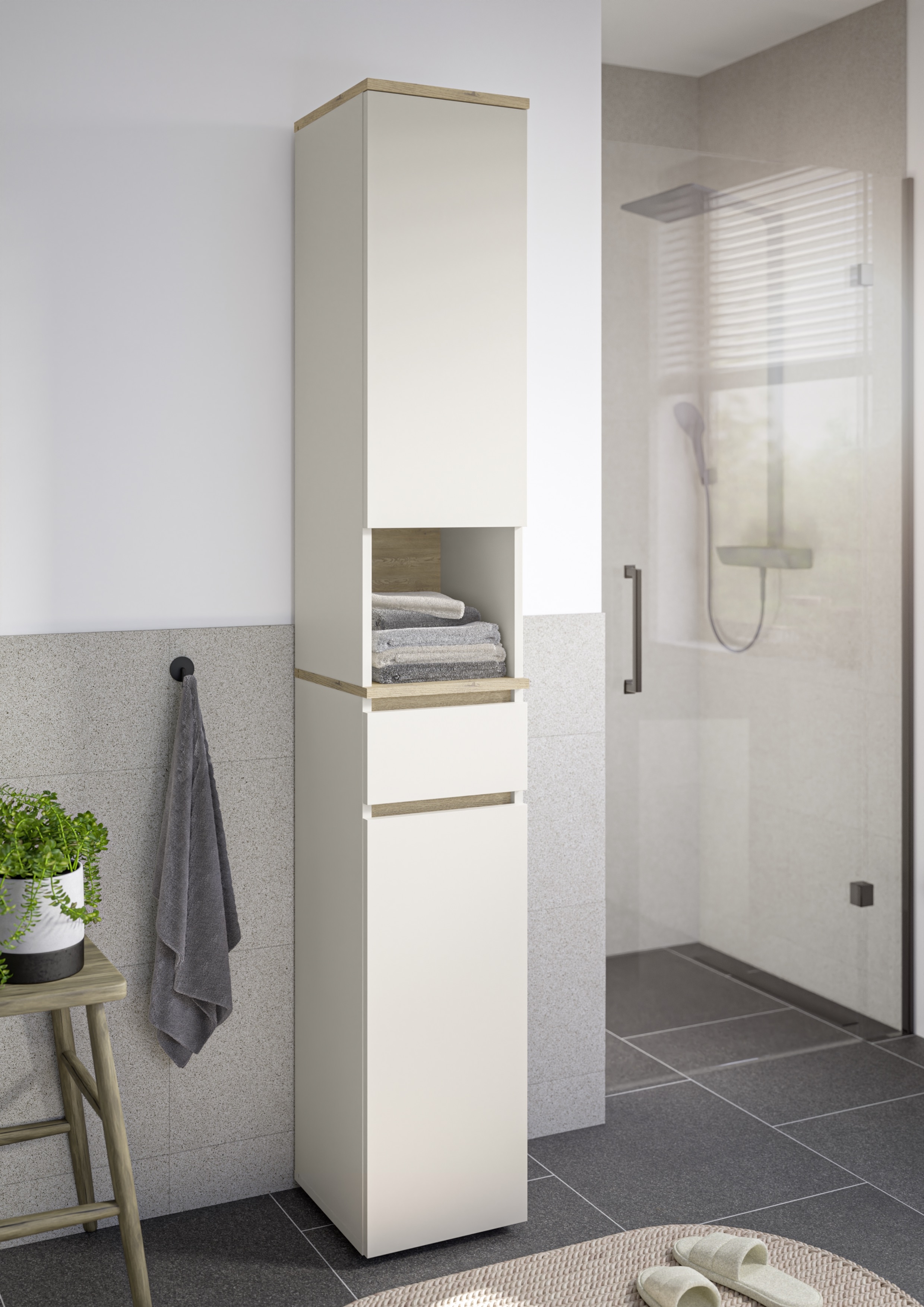 Dieser Hochschrank in Kaschmir mit Absetzungen in Cremona Eiche Holznachbildung bietet praktische Aufbewahrungsmöglichkeiten in schmalem Format. Die pflegeleichte Melaminbeschichtung sorgt für eine strapazierfähige Oberfläche im Alltag. Hinter zwei Türen befinden sich zwei Einlegeböden, die flexibel nutzbaren Stauraum für Haushaltsgegenstände, Vorräte oder Textilien bieten. Ein offenes Fach eignet sich ideal für Dinge, die schnell griffbereit sein sollen. Schwarze, runde Kunststoffgleiter geben dem Schrank sicheren Stand. Die zurückhaltende Farbgestaltung passt gut in moderne, preisbewusste Einrichtungen – ob im Flur, Bad oder Hauswirtschaftsraum.
