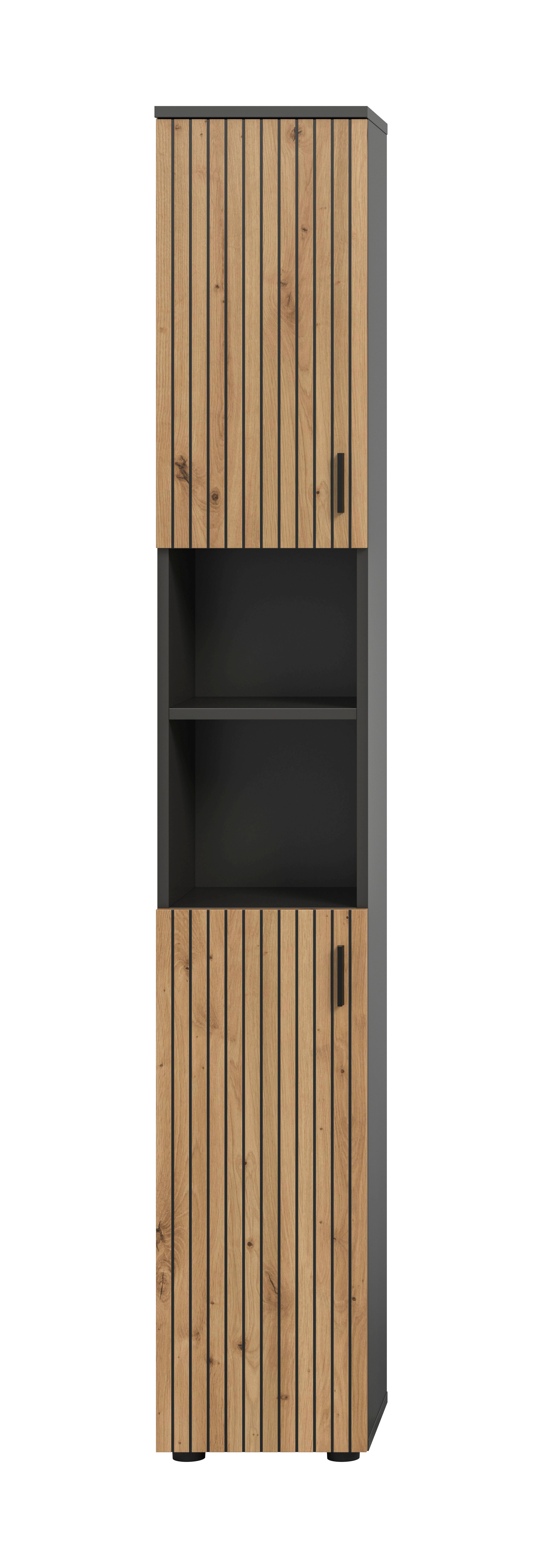Der hohe Badschrank in Artisan Oak Nachbildung (30 x 192 x 30 cm) bietet mit zwei Türen, zwei höhenverstellbaren Einlegeböden, vier geschlossenen und zwei offenen Fächern sowie drei festen Konstruktionsböden viel Stauraum. Der wechselbare Türanschlag ermöglicht flexible Platzierung. Die pflegeleichte Front mit eingefräster Paneeloptik ist hochwertig verarbeitet und verleiht deinem Bad eine warme, natürliche Ausstrahlung. Durch die weiteren Möbeltypen der Serie kannst du dein Bad individuell gestalten und funktional erweitern. Dieser Schrank verbindet modernes Design mit praktischer Organisation.